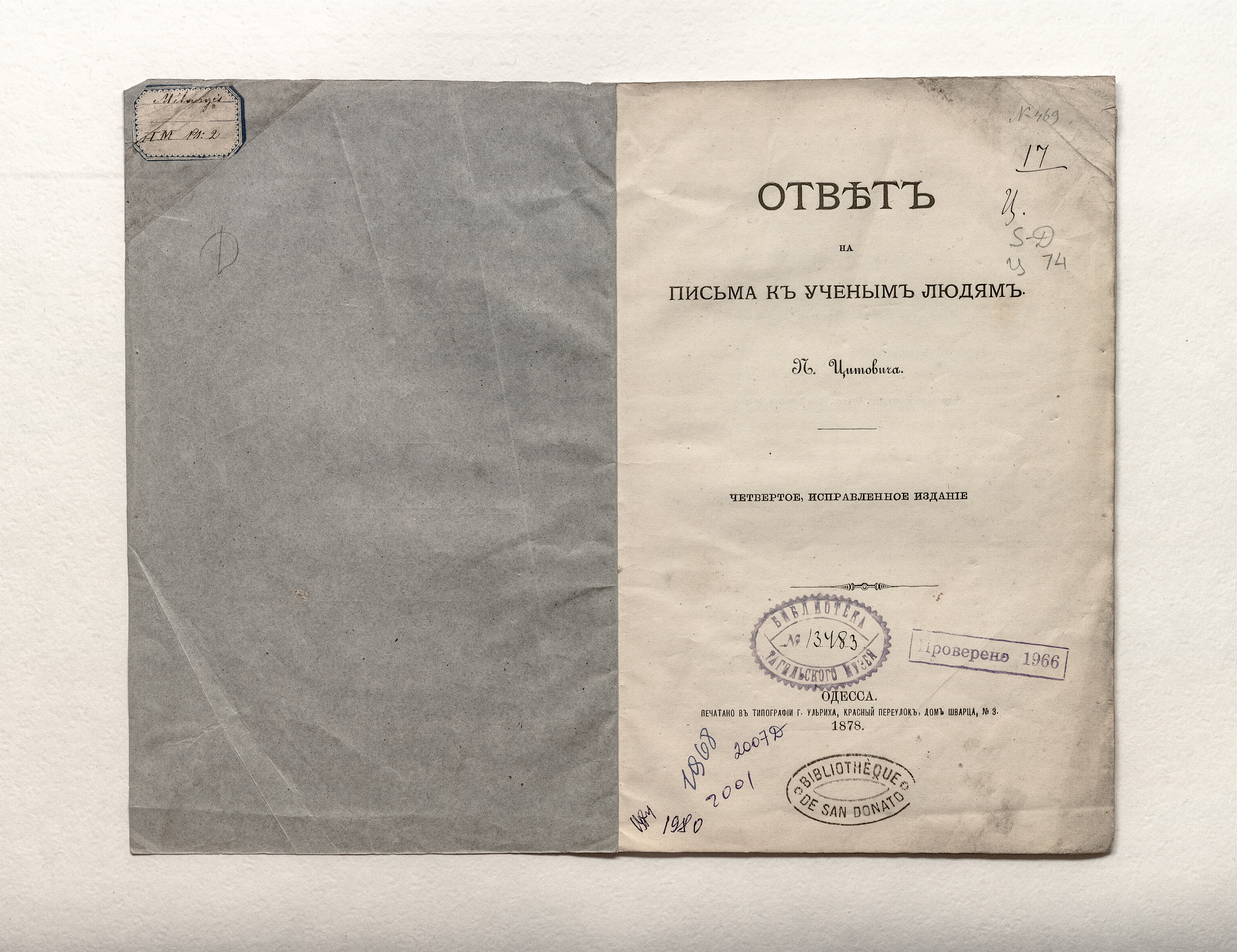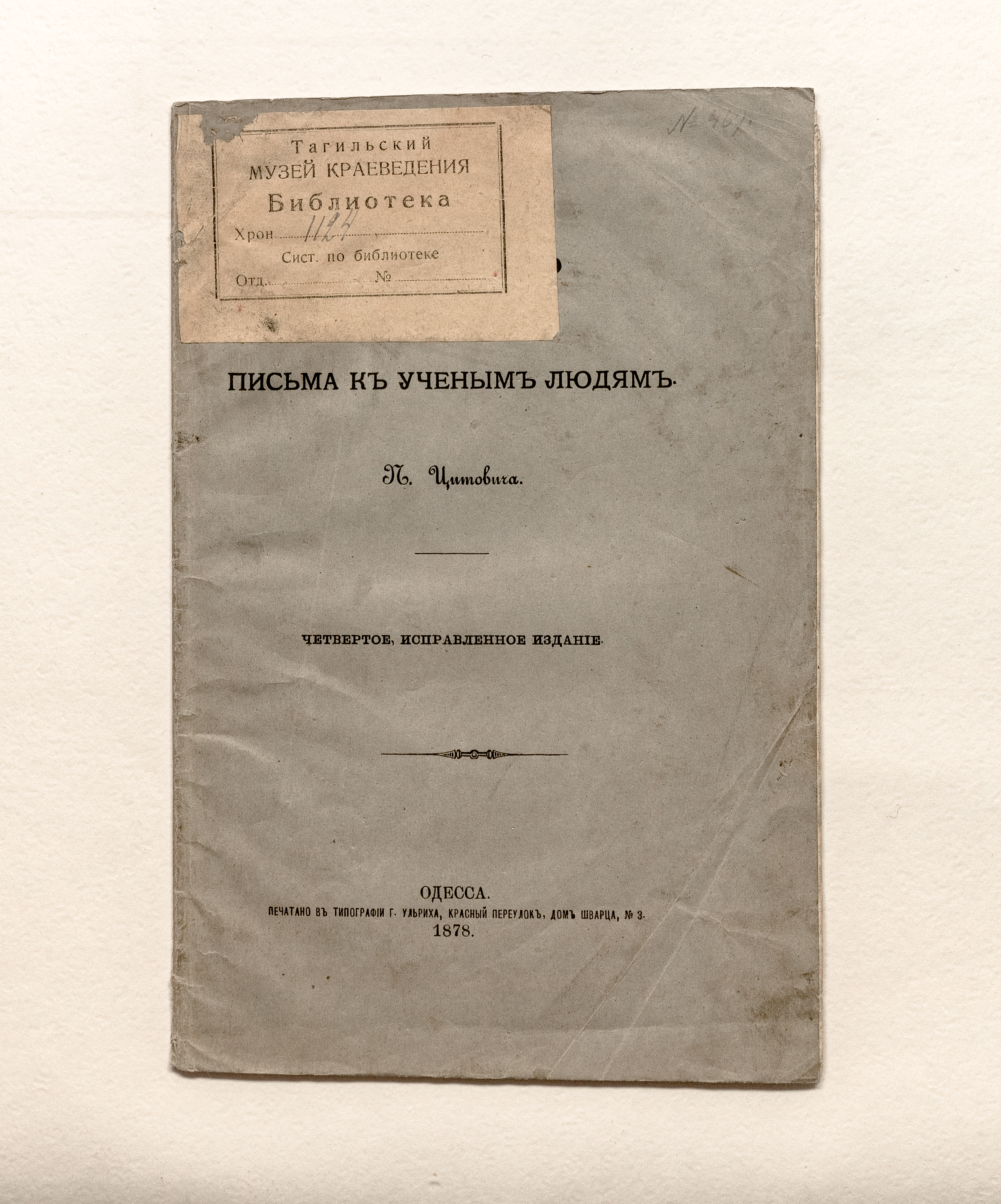 Цитович, П. П. (1843 – 1913). Ответ на письма к ученым людям П. Цитовича / П. П. Цитович. – 4-е изд., испр. – Одесса : тип. Г. Ульриха, 1878. – [2], 38 с. ; 24х15,5 см.