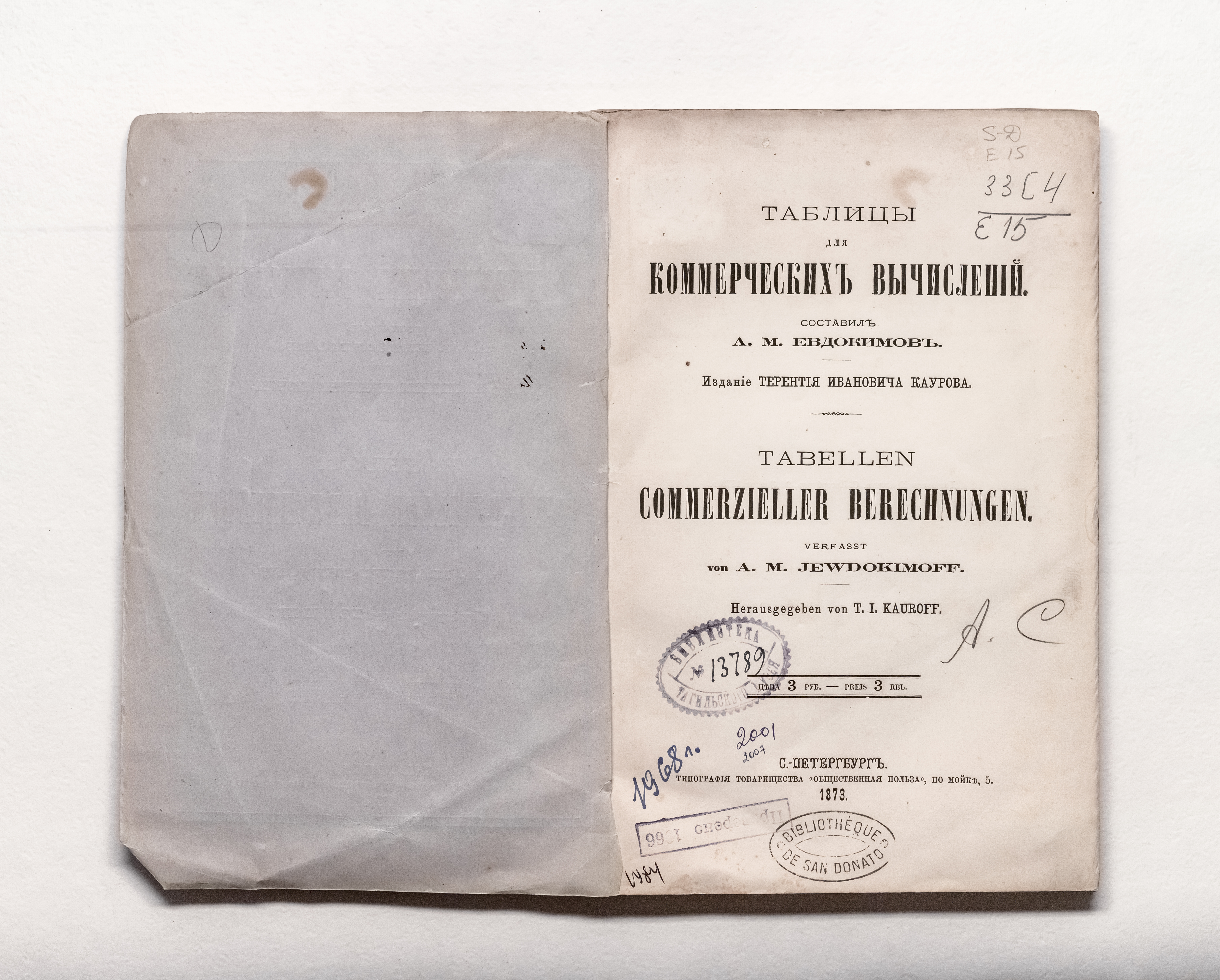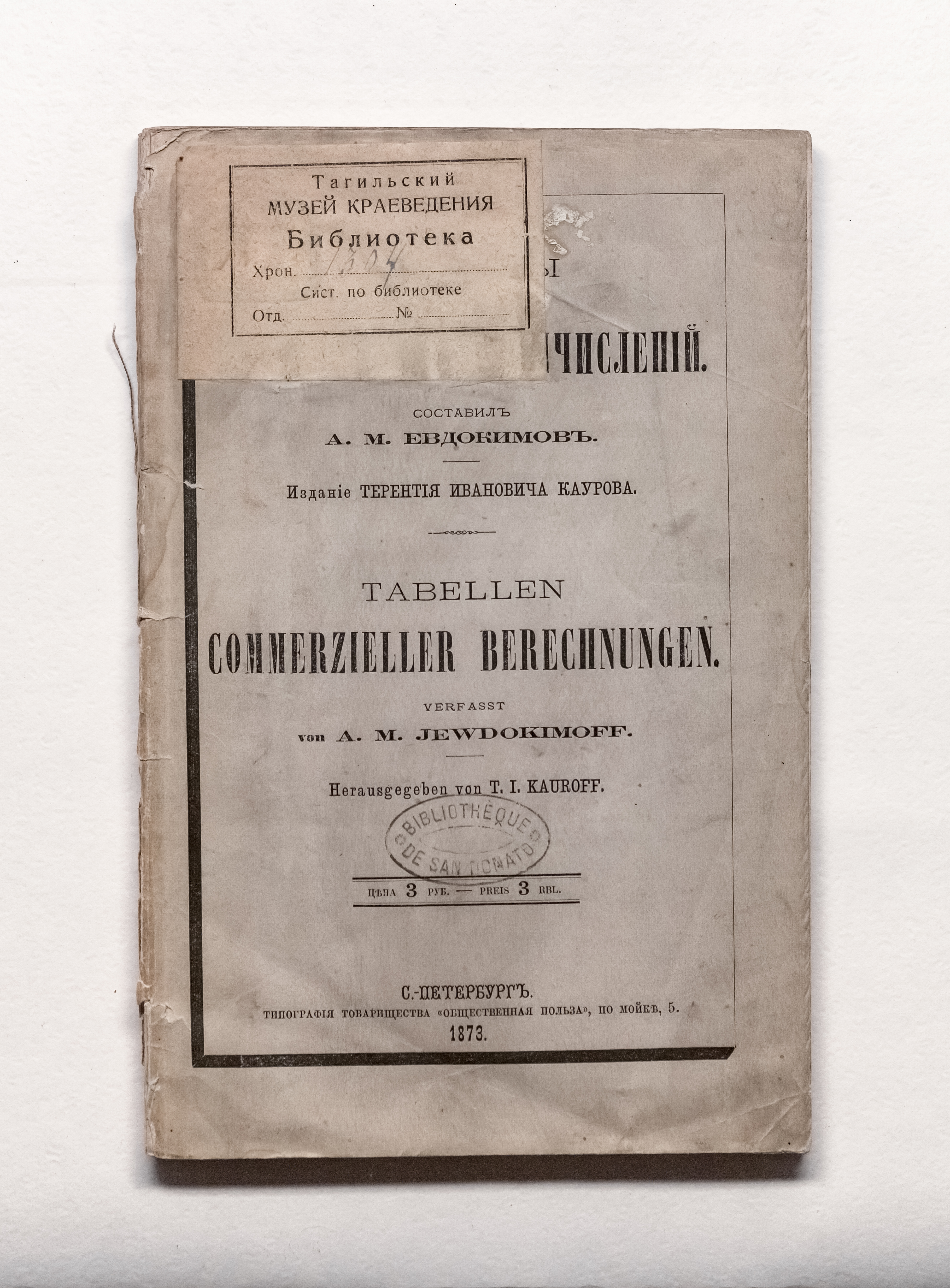 Таблицы для коммерческих вычислений / сост. А. М. Евдокимов ; изд. Т. И. Кауров. – Санкт-Петербург : тип. т-ва "Обществ. польза", 1873. – [4], 125 с. ; 24,5х15,5 см.