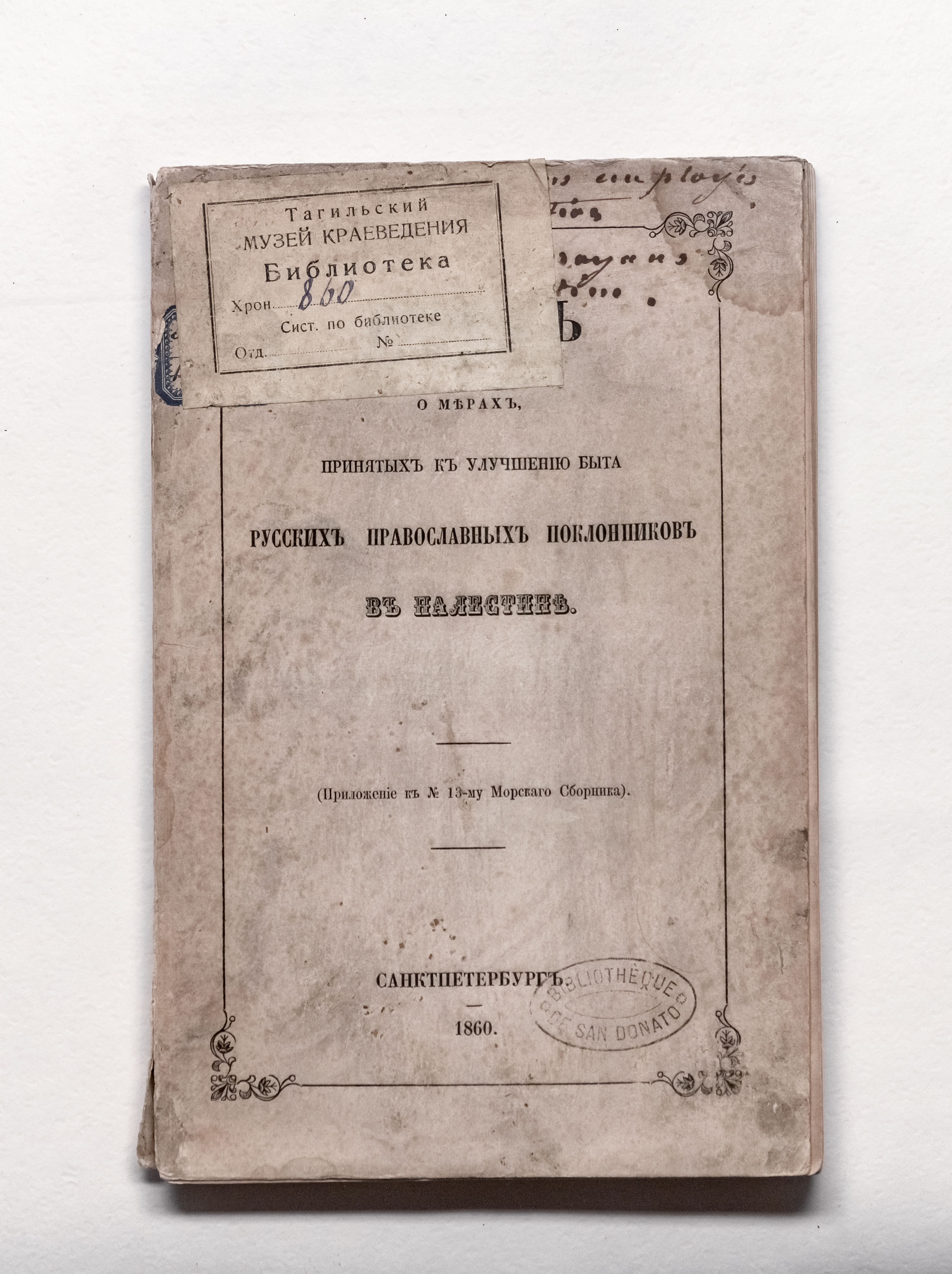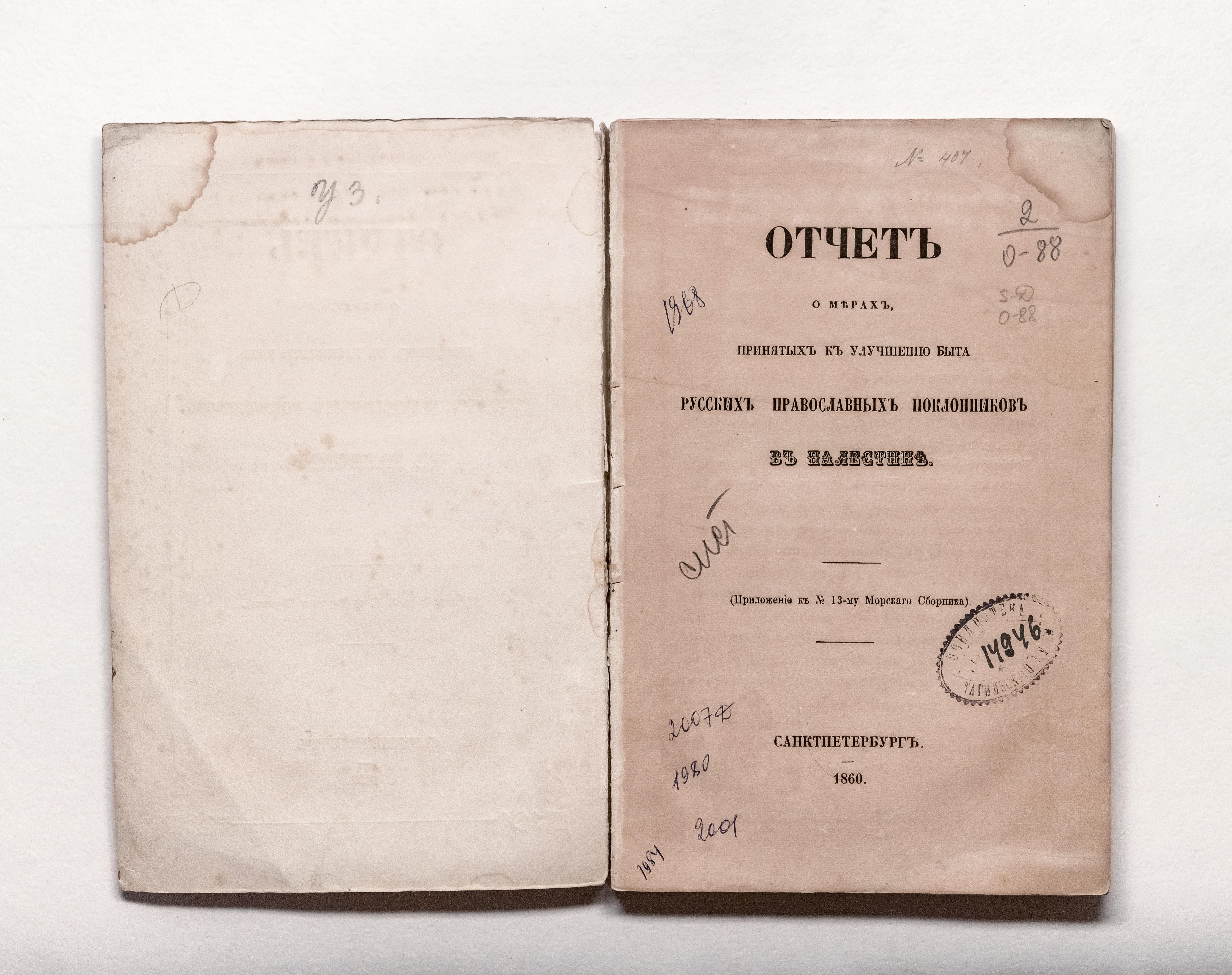 Леонид (архим. Троице-Сергиевой лавры; Кавелин Лев Александрович; 1822 – 1891). Отчет о мерах, принятых к улучшению быта русских православных поклонников в Палестине / Леонид. – Санкт-Петербург : тип. Мор. м-ва, 1860. – 4, 143, 4 с., 2 л. ил., карт. – (приложение к № 13 Морского сборника). ; 24х15,5 см.