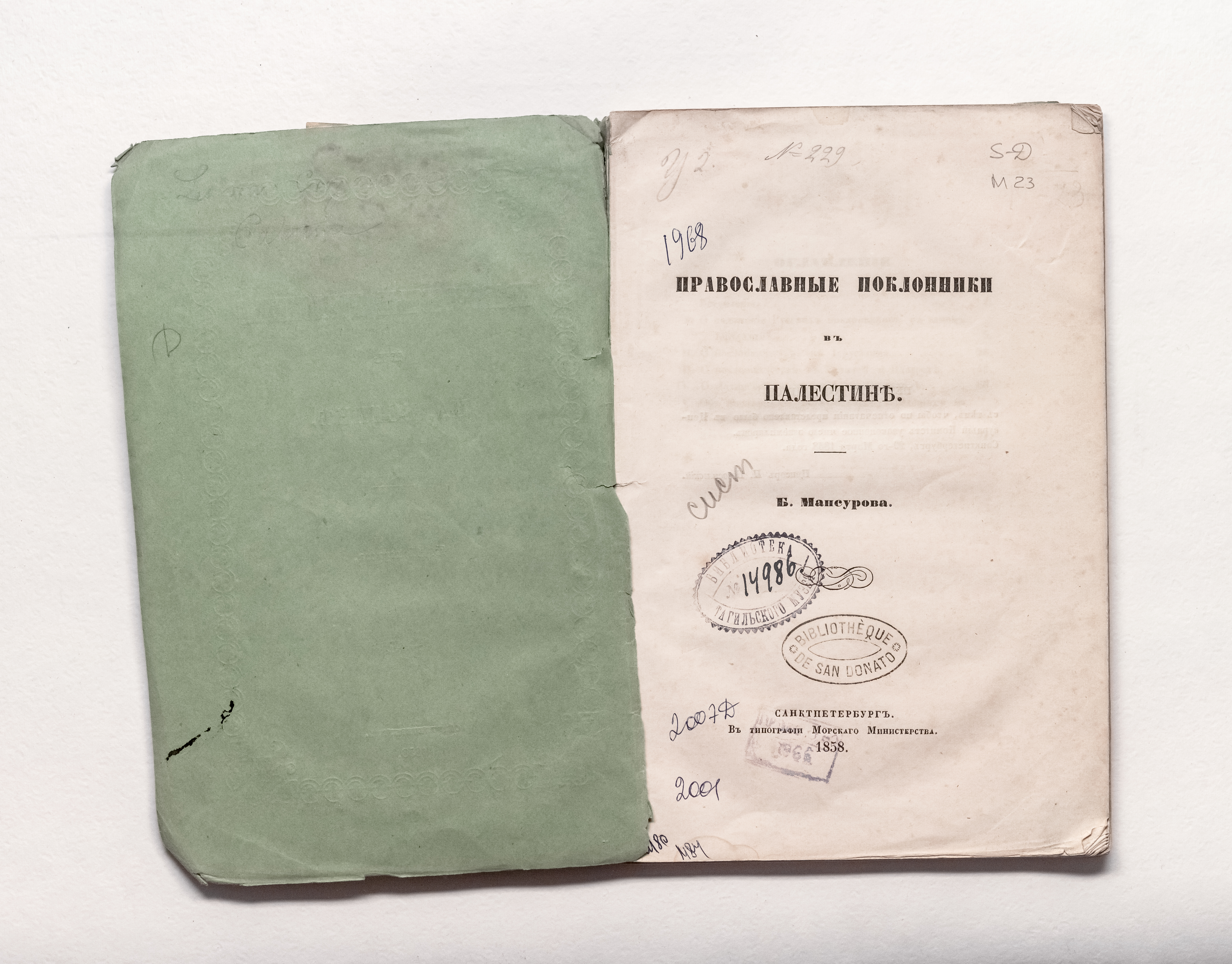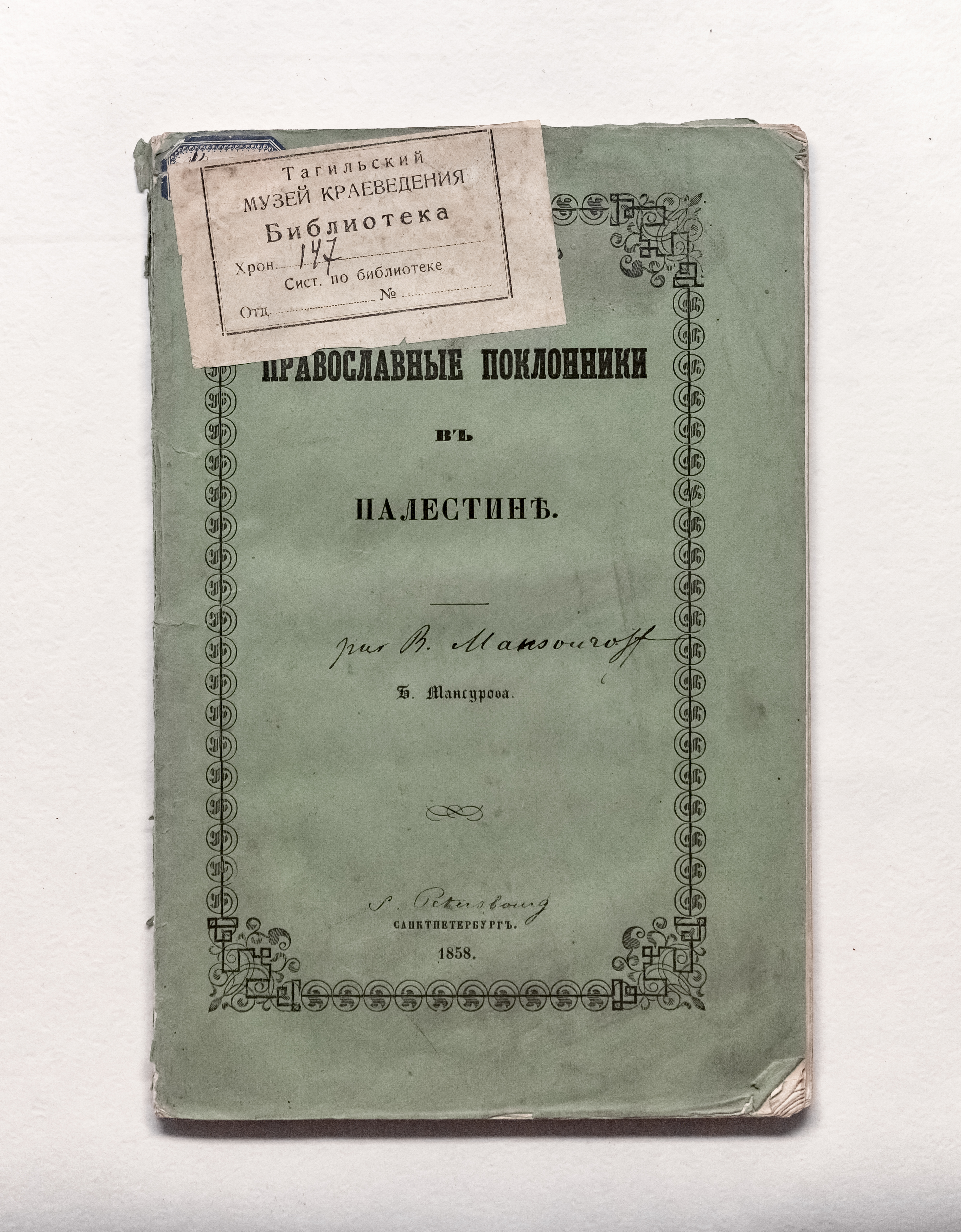 Мансуров, Б. П. (1828 – 1910). Православные поклонники в Палестине / Б. П. Мансуров. – Санкт-Петербург : тип. Морского м-ва, 1858. – [4], 106 с. ; 23,5х15,5 см.