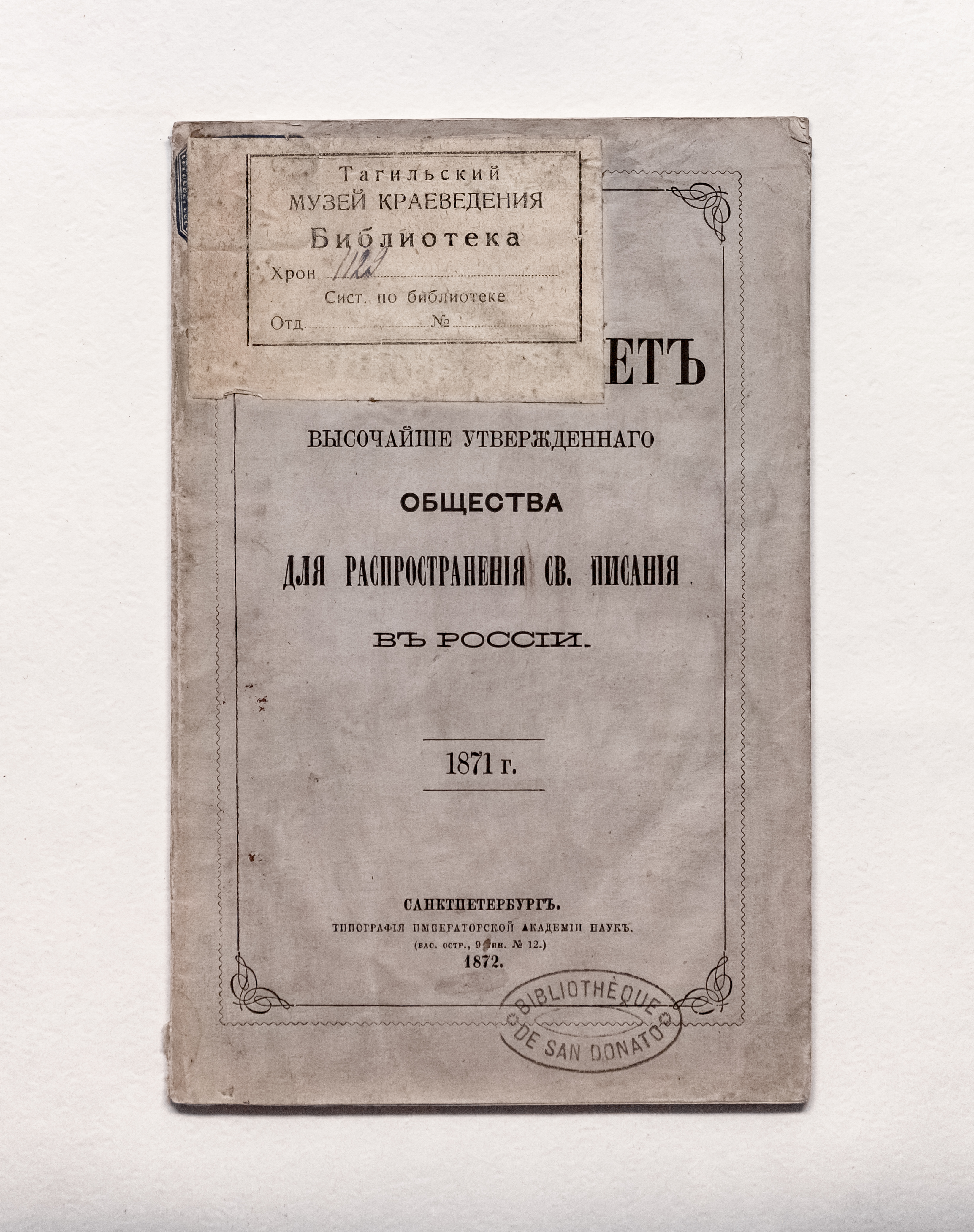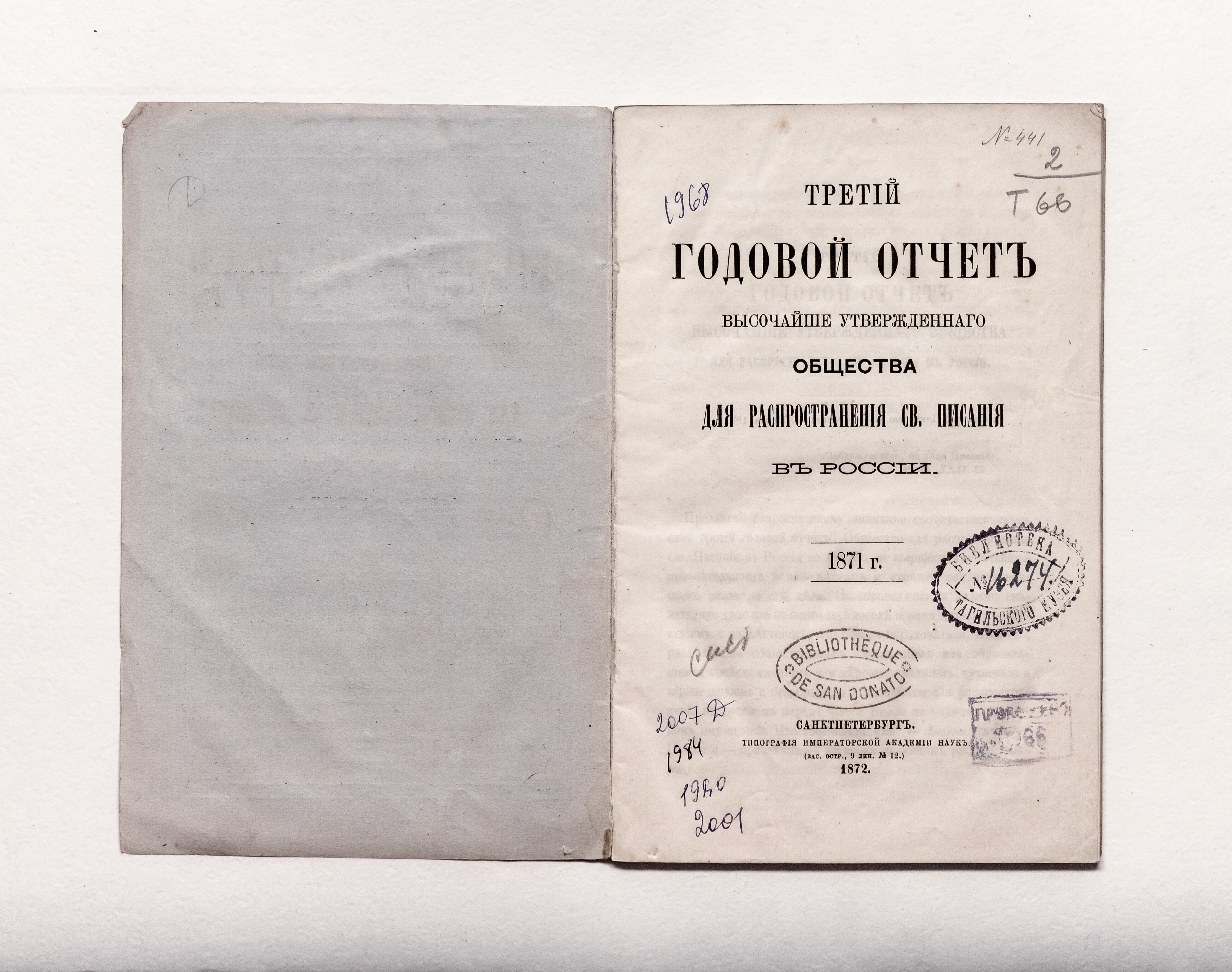 Третий годовой отчет высочайше утвержденного общества для распространения Св. писания в России. – Санкт-Петербург : тип. Императорской Академии Наук, 1872. – 72 с. ; 20,5х13,5 см.