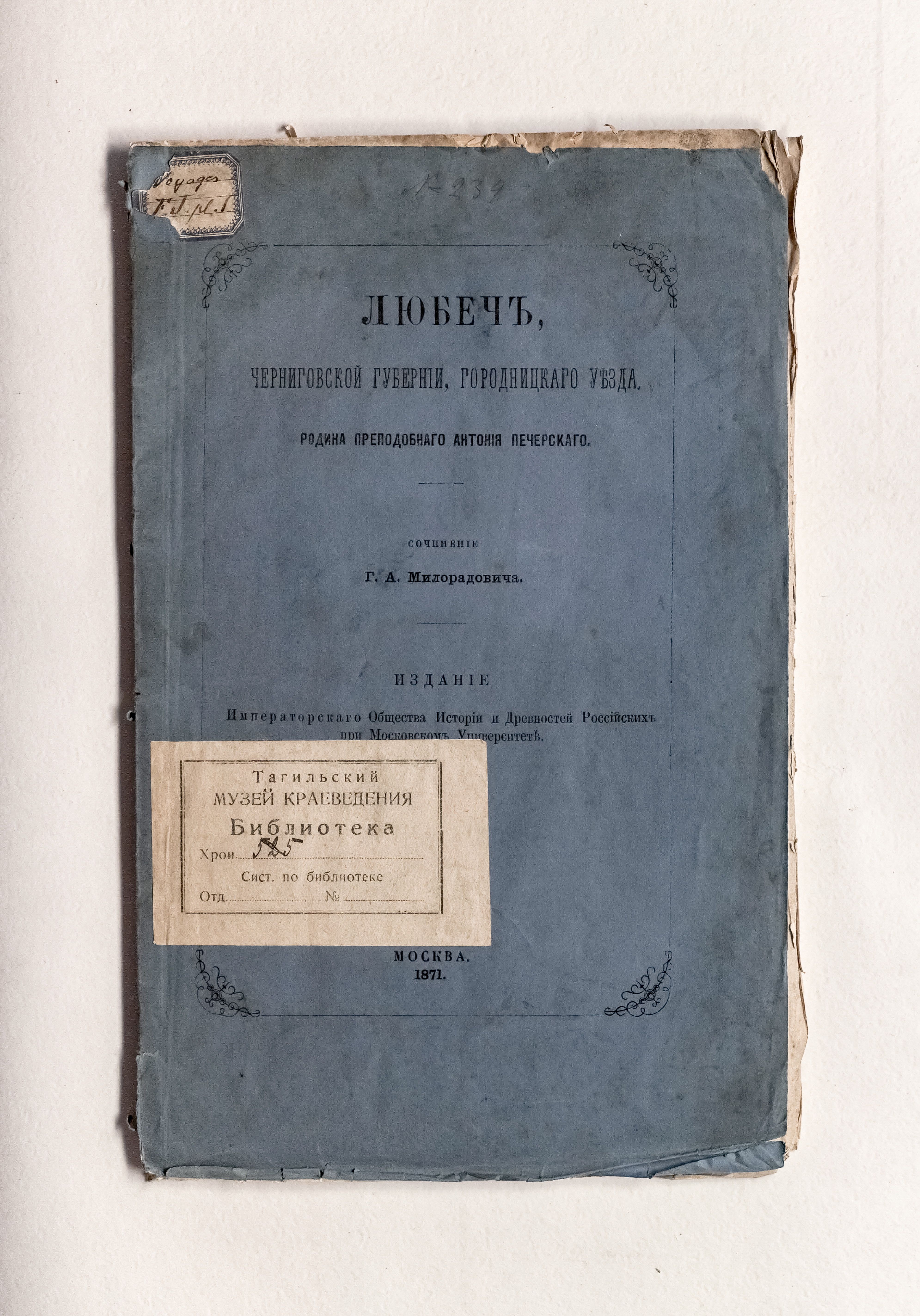 Милорадович, Г. А. (1839 – 1905). Любеч, Черниговской губернии, Городницкого уезда : родина преподобного Антония Печерского / Г. А. Милорадович ; О-во истории и древностей рос. при Моск. ун-те. – Москва : Университетская тип. (Катков и К), 1871. – 156, [2] с. ; 28х17,5 см.