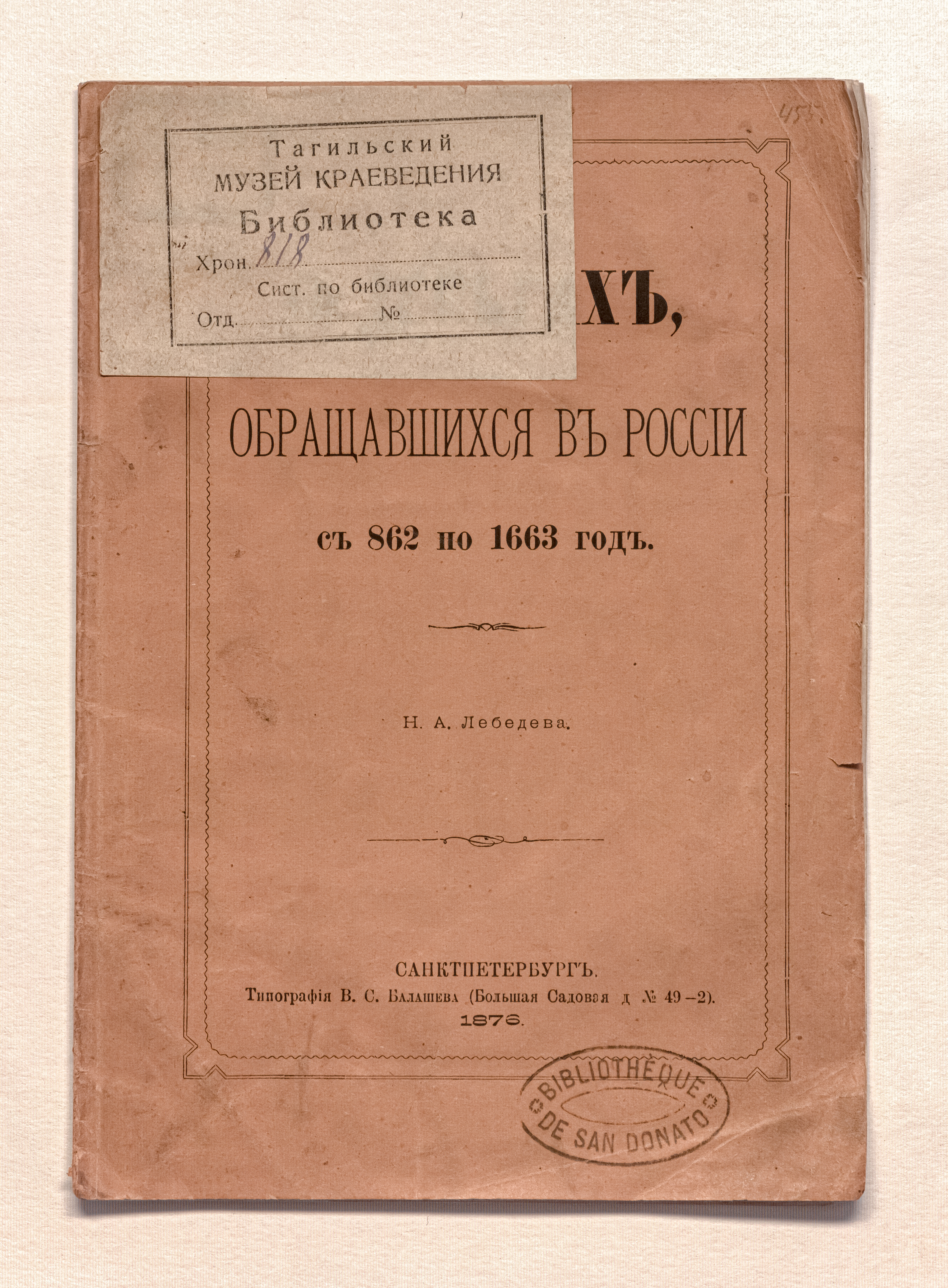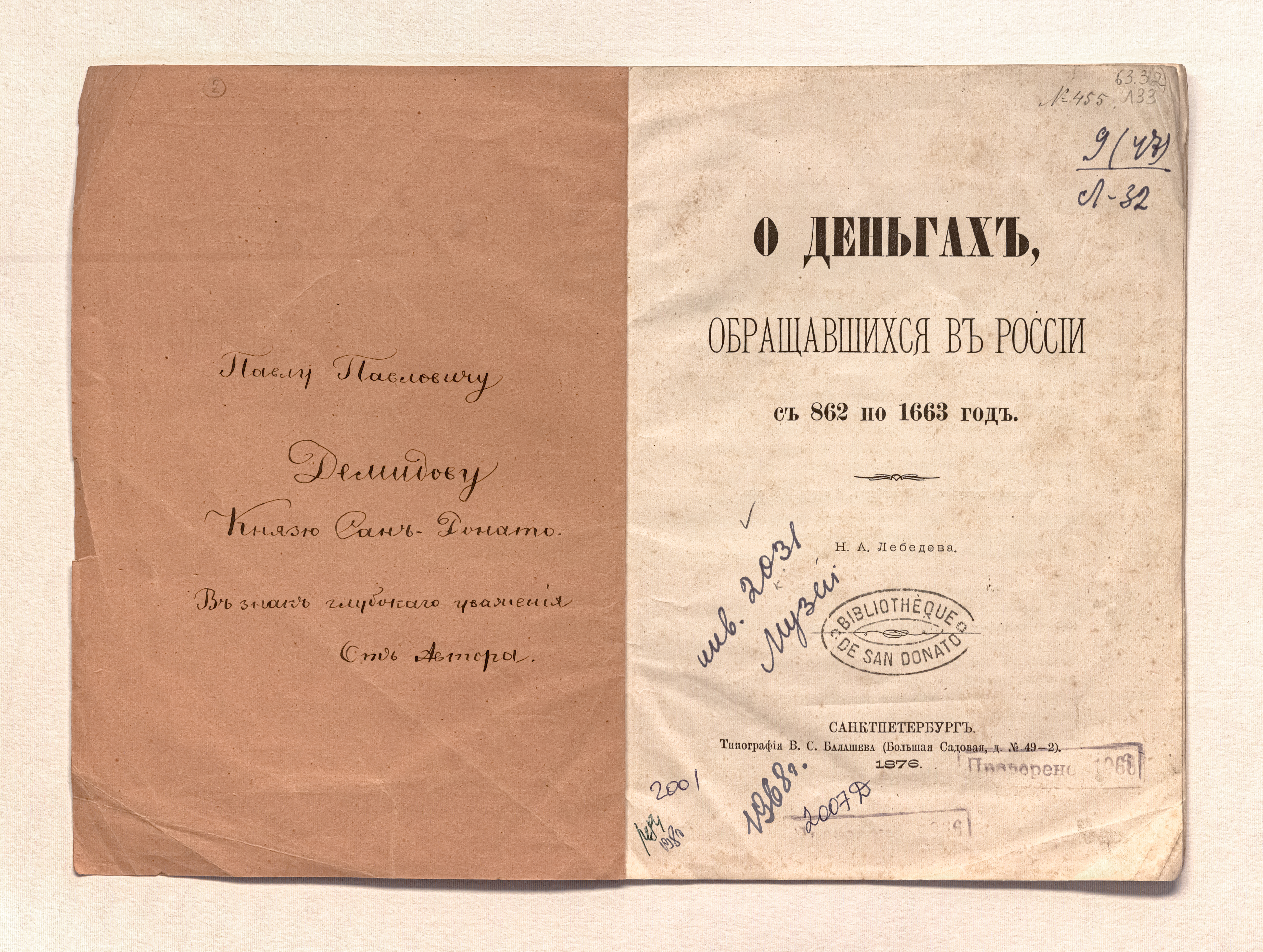 Лебедев, Н. А. (1813-1896). О деньгах, обращавшихся в России с 862 по 1663 год / Н. А. Лебедев. – Санкт-Петербург : тип. В. С. Балашева, 1876. – 10 с. ; 20,5х14,5 см.