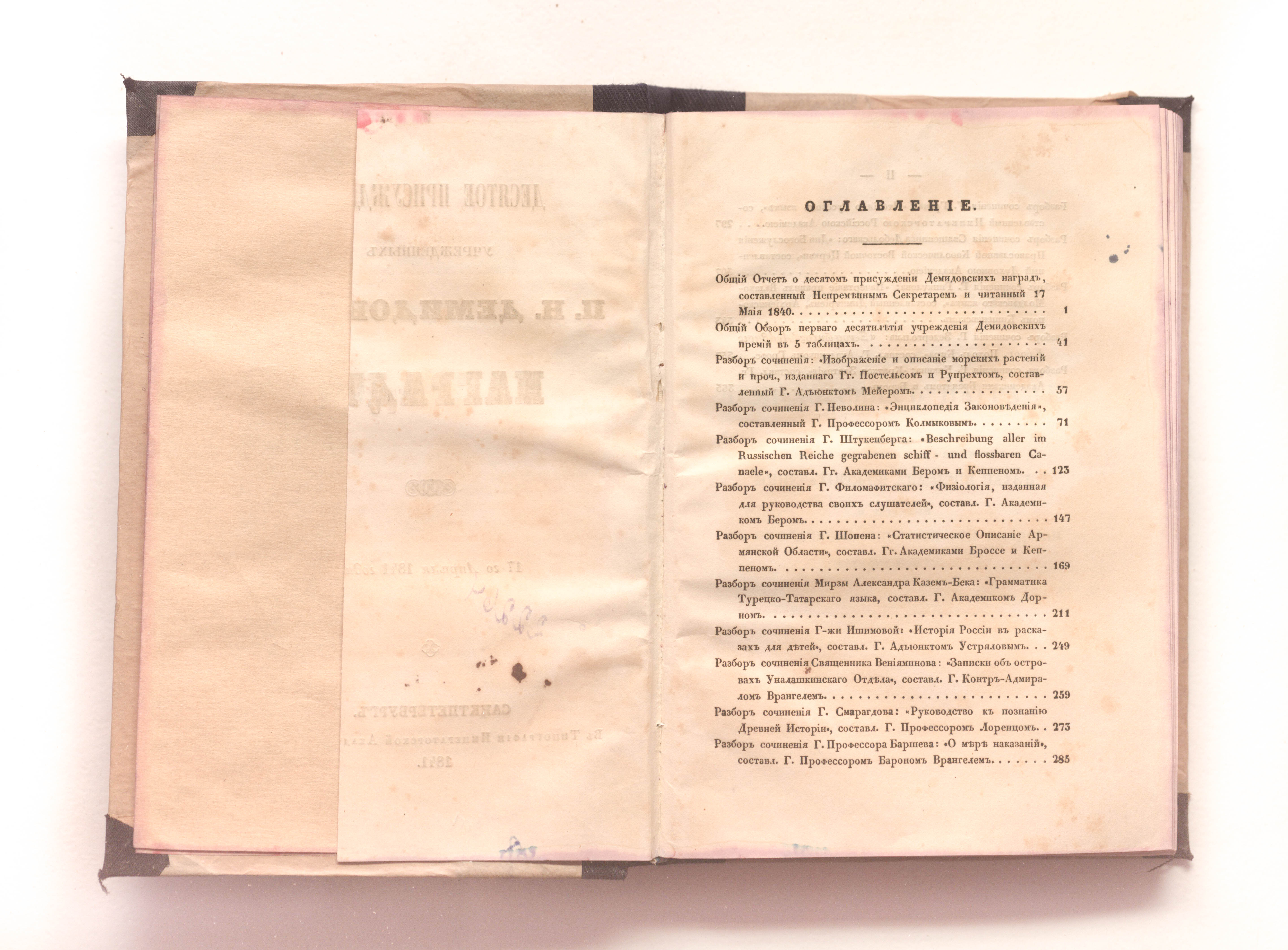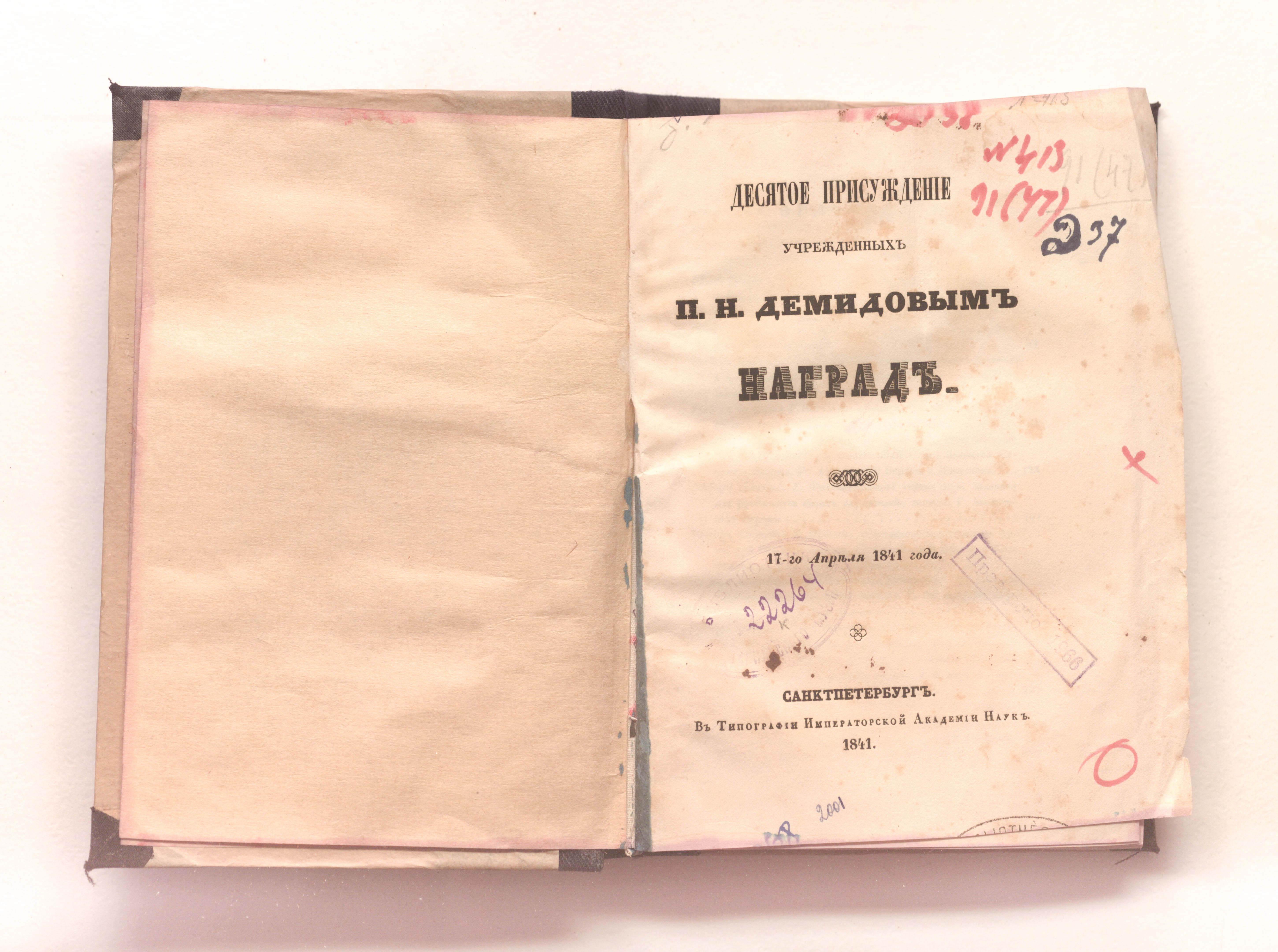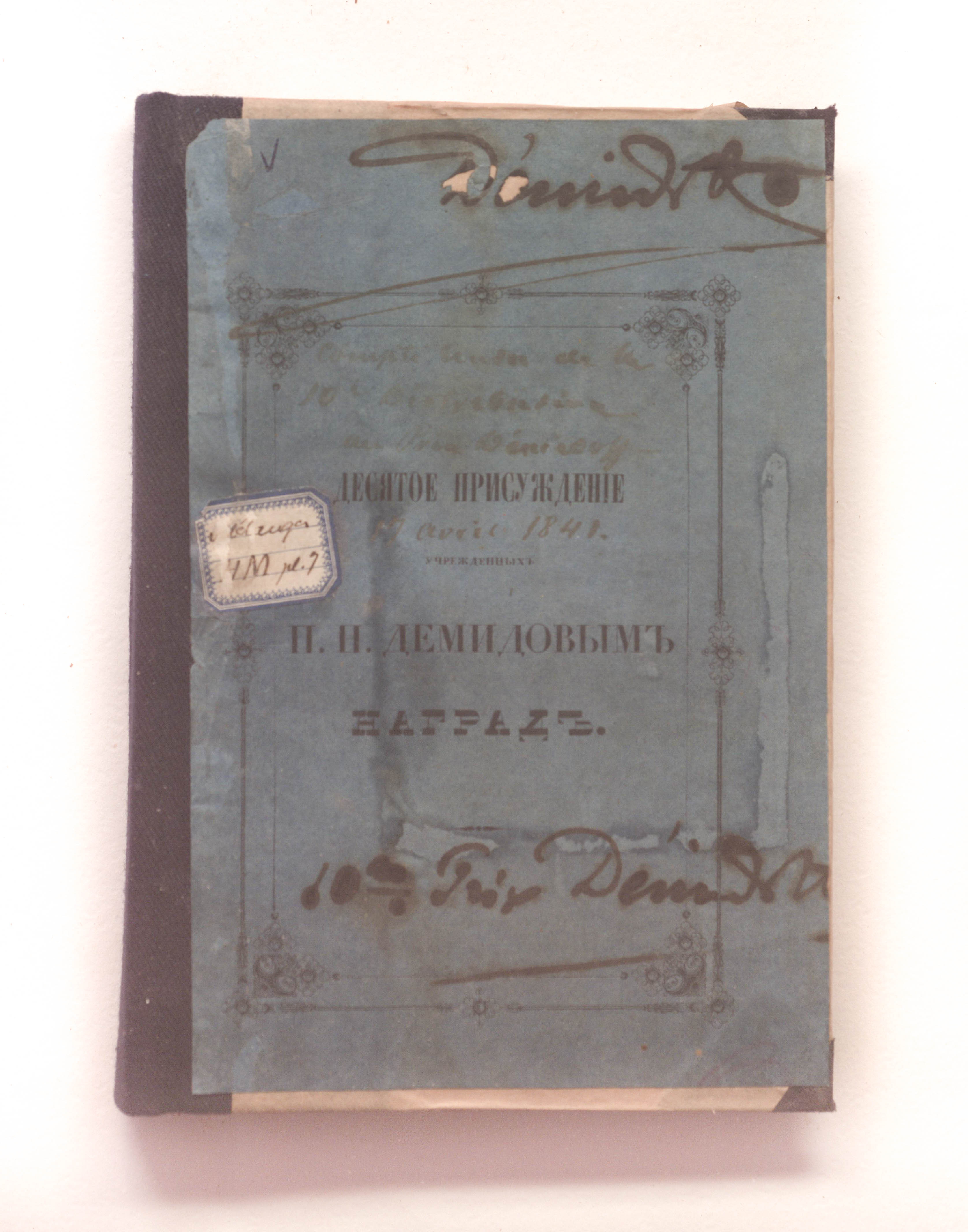 Десятое присуждение учрежденных П. Н. Демидовым наград. 17 апреля 1841 года. – Санкт-Петербург : тип. Императорской Академии Наук, 1841. – 375 с. ; 21х14,5см.