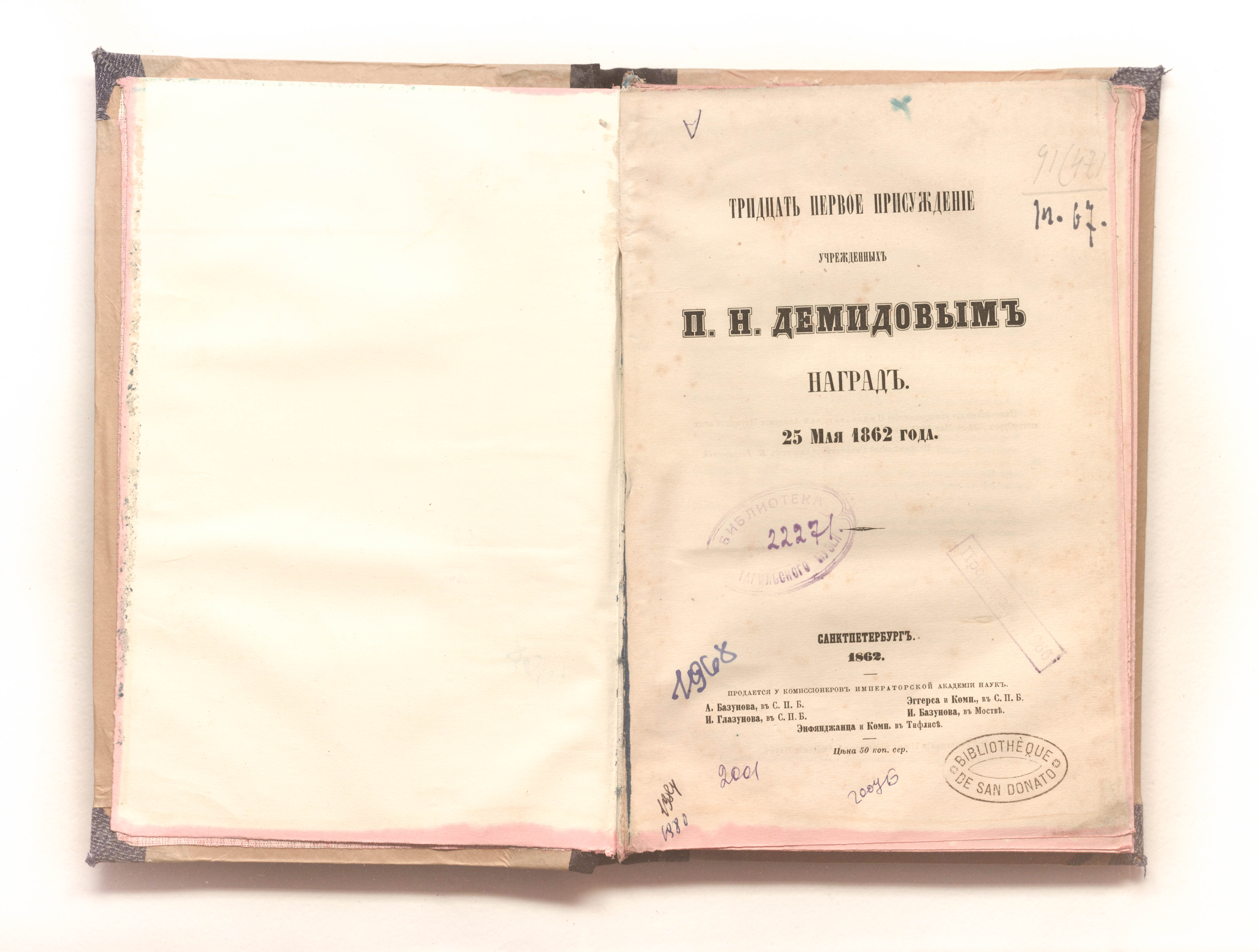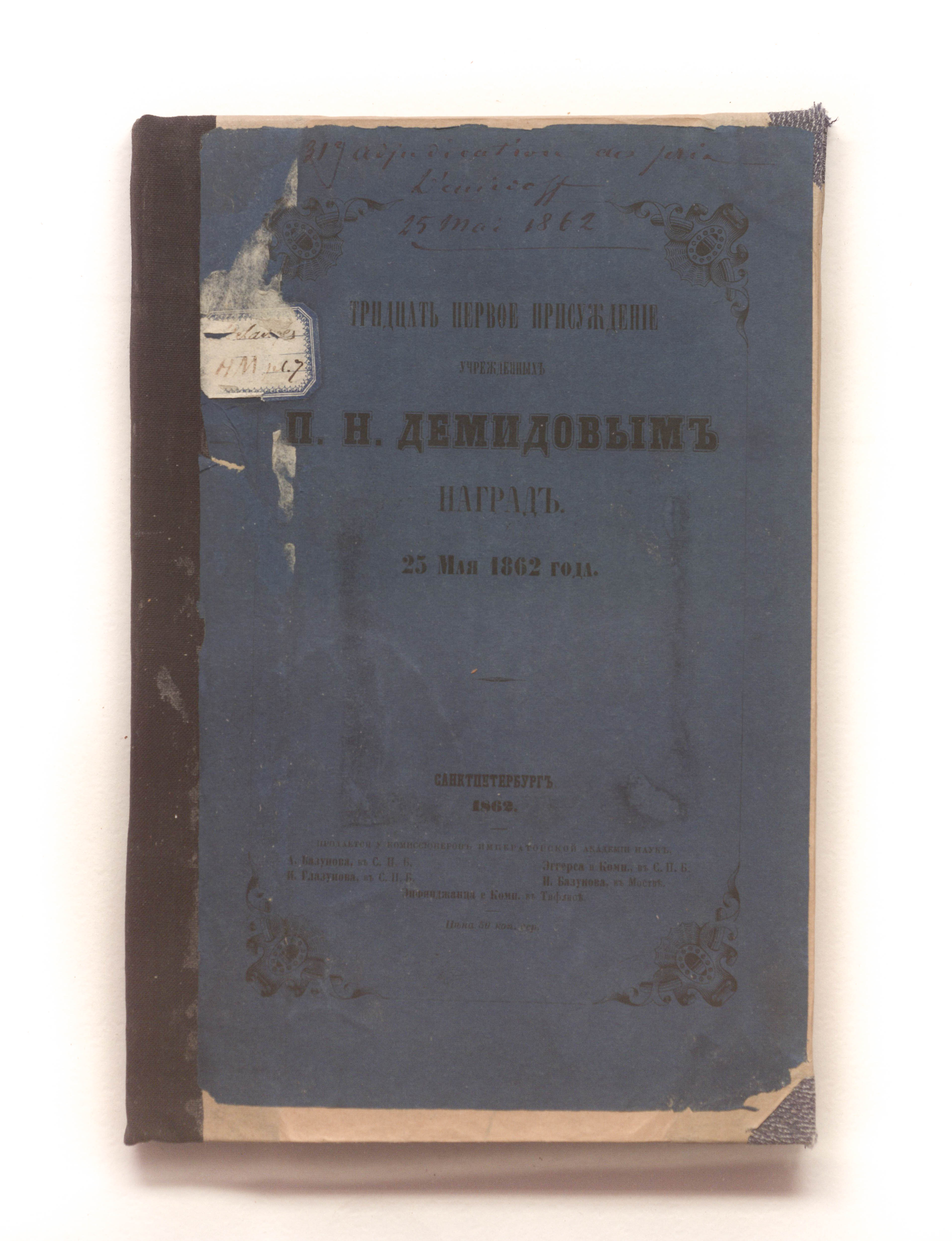 Тридцать первое присуждение учрежденных П. Н. Демидовым наград. 25 мая 1862 года. – Санкт-Петербург : тип. Императорской Академии Наук, 1862. – 188 с. ; 25х16,5см.