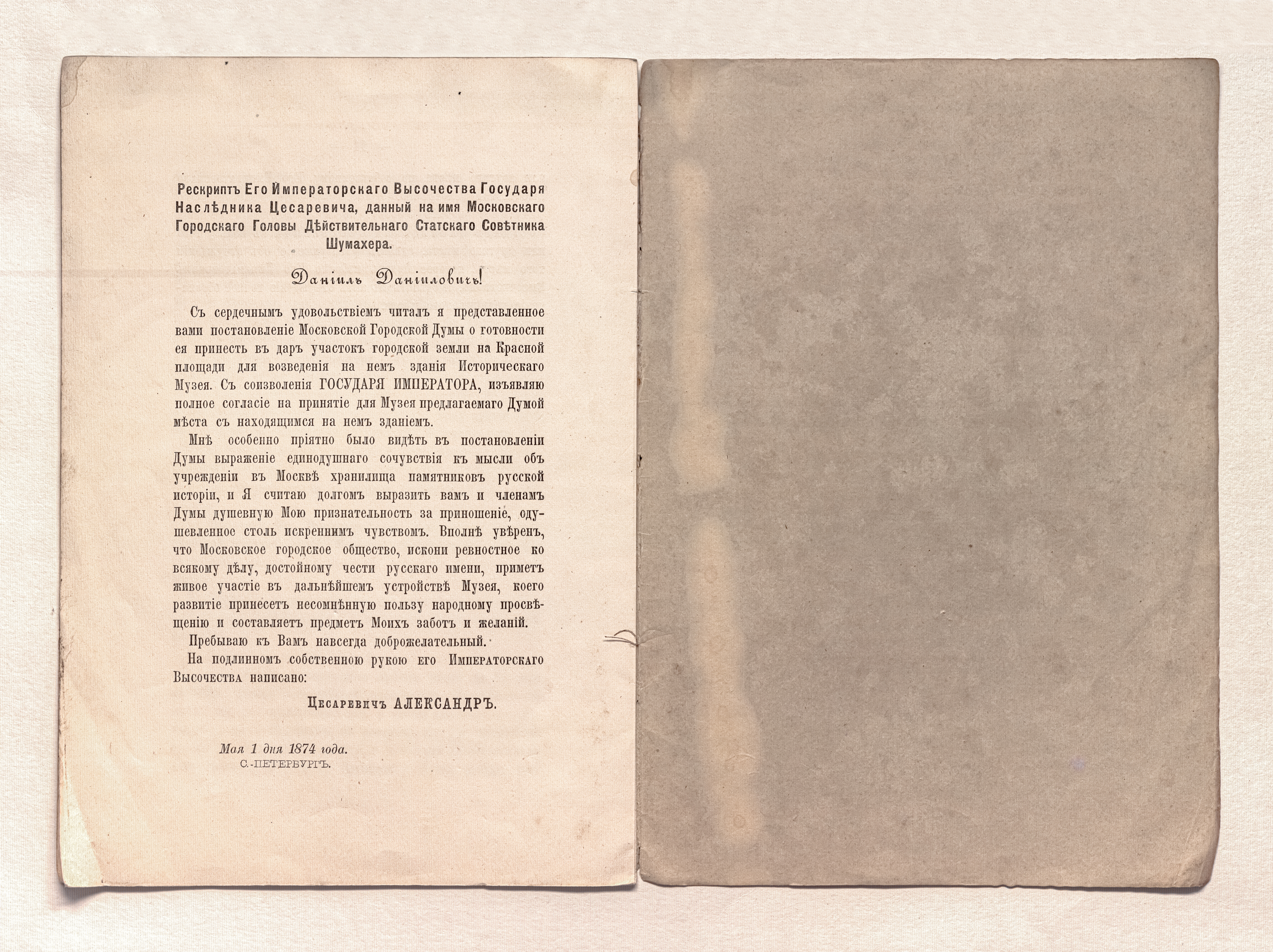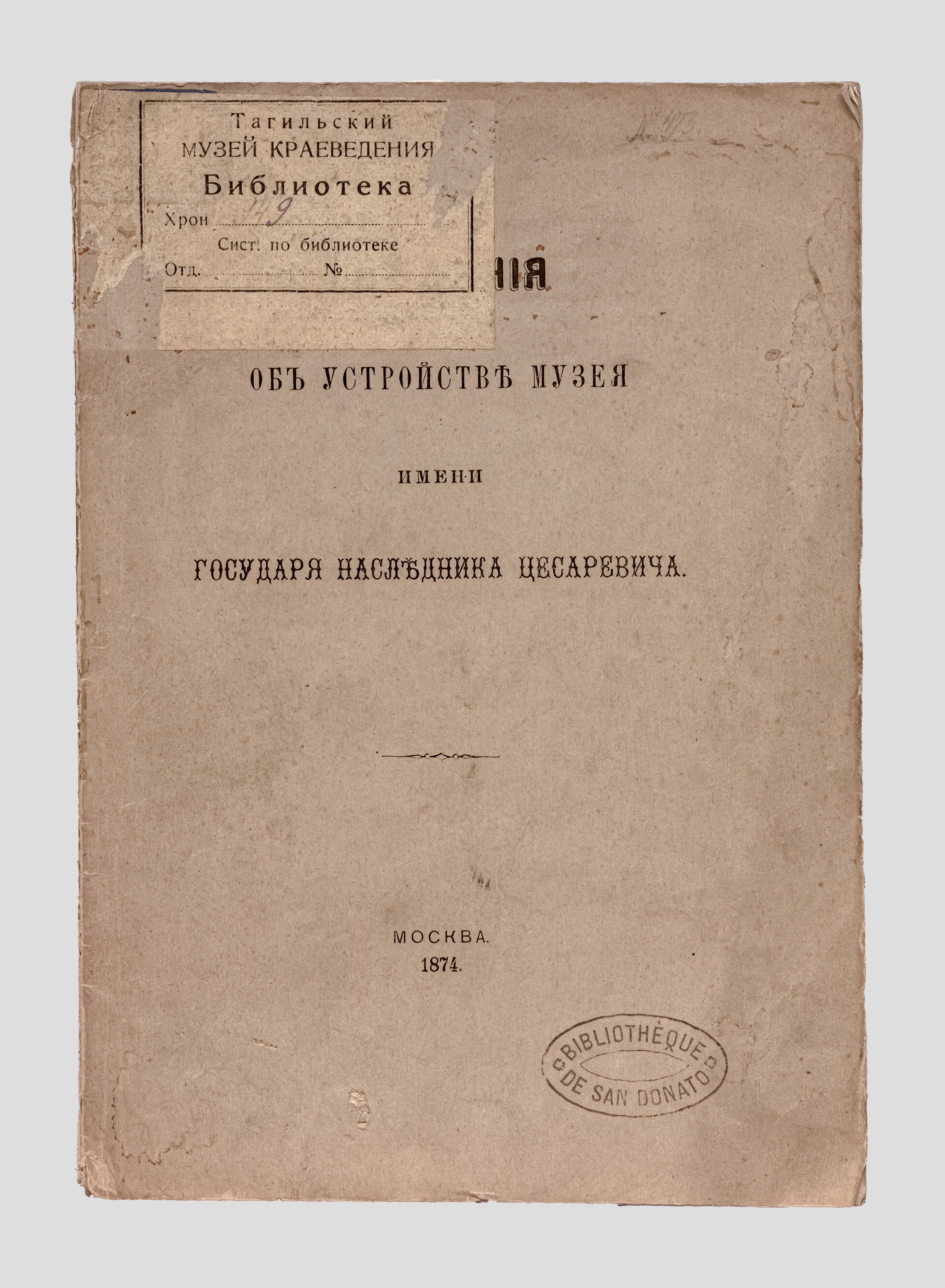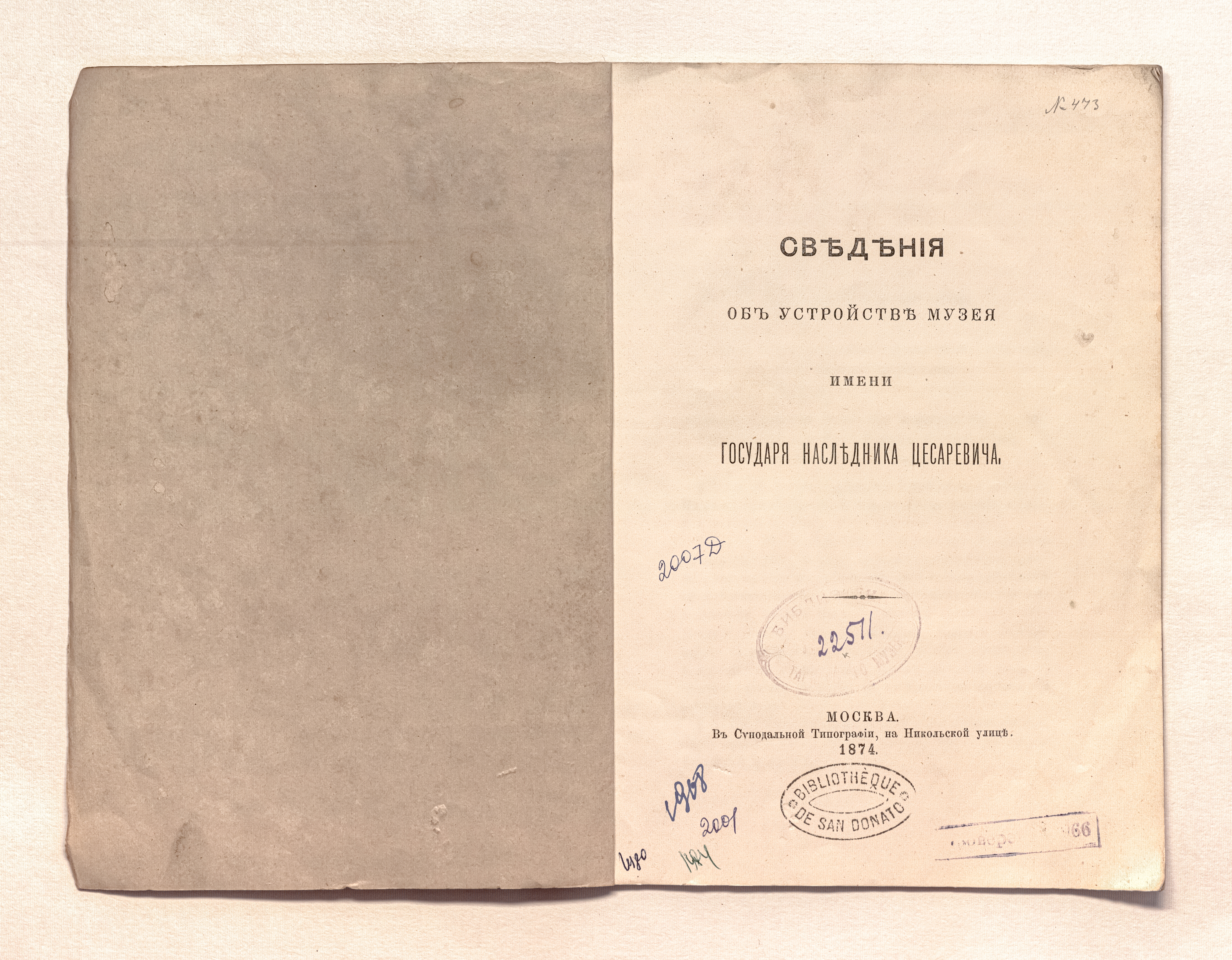 Сведения об устройстве музея имени Государя Наследника Цесаревича. – Москва : Синодальная типография, 1874. – 12 с. ; 23,5х16,5 см.