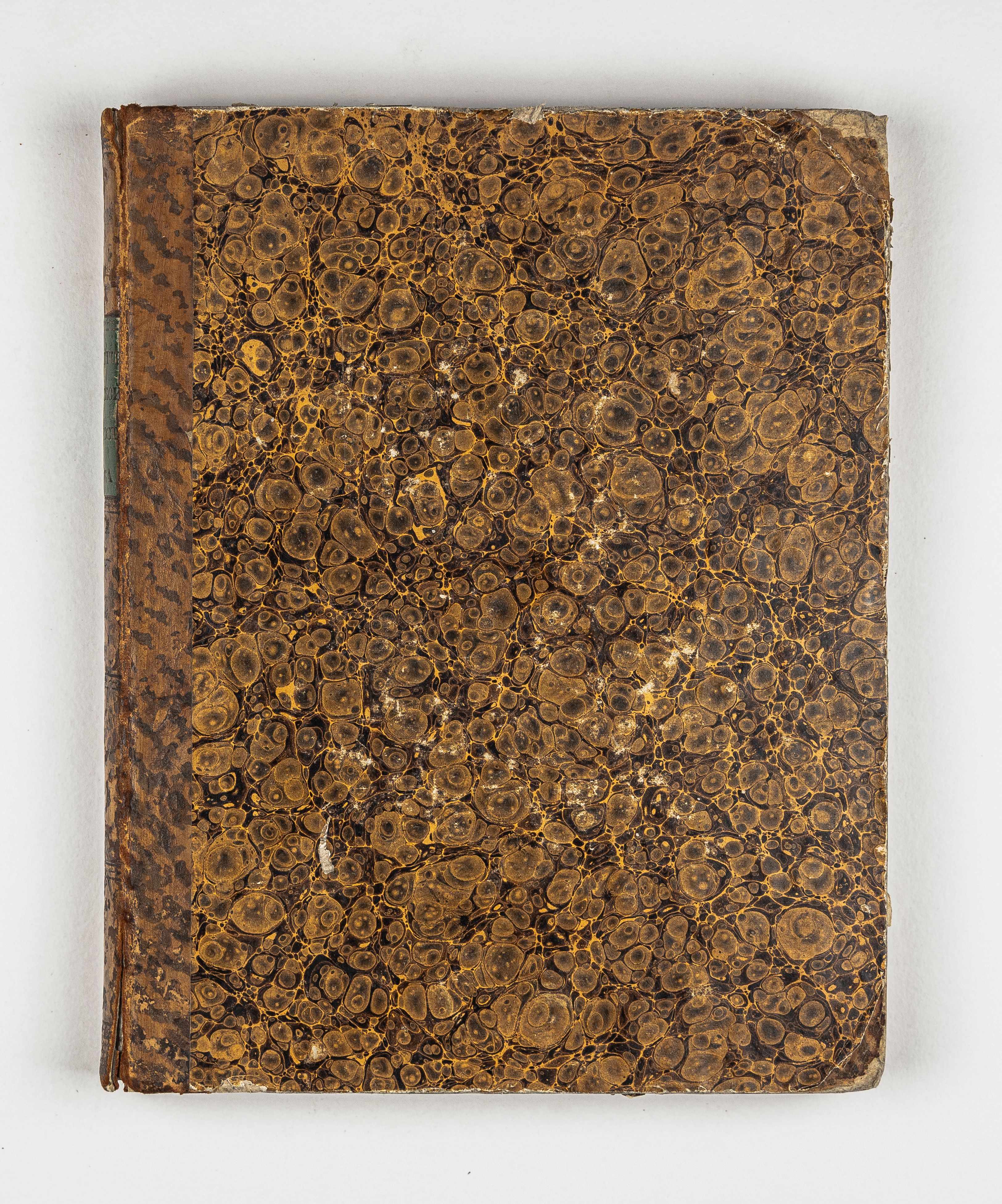 Книга в полукожаном владельческом переплете. Крышки переплета обтянуты бумагой с рисунком «под мрамор». Обрез тонированный.