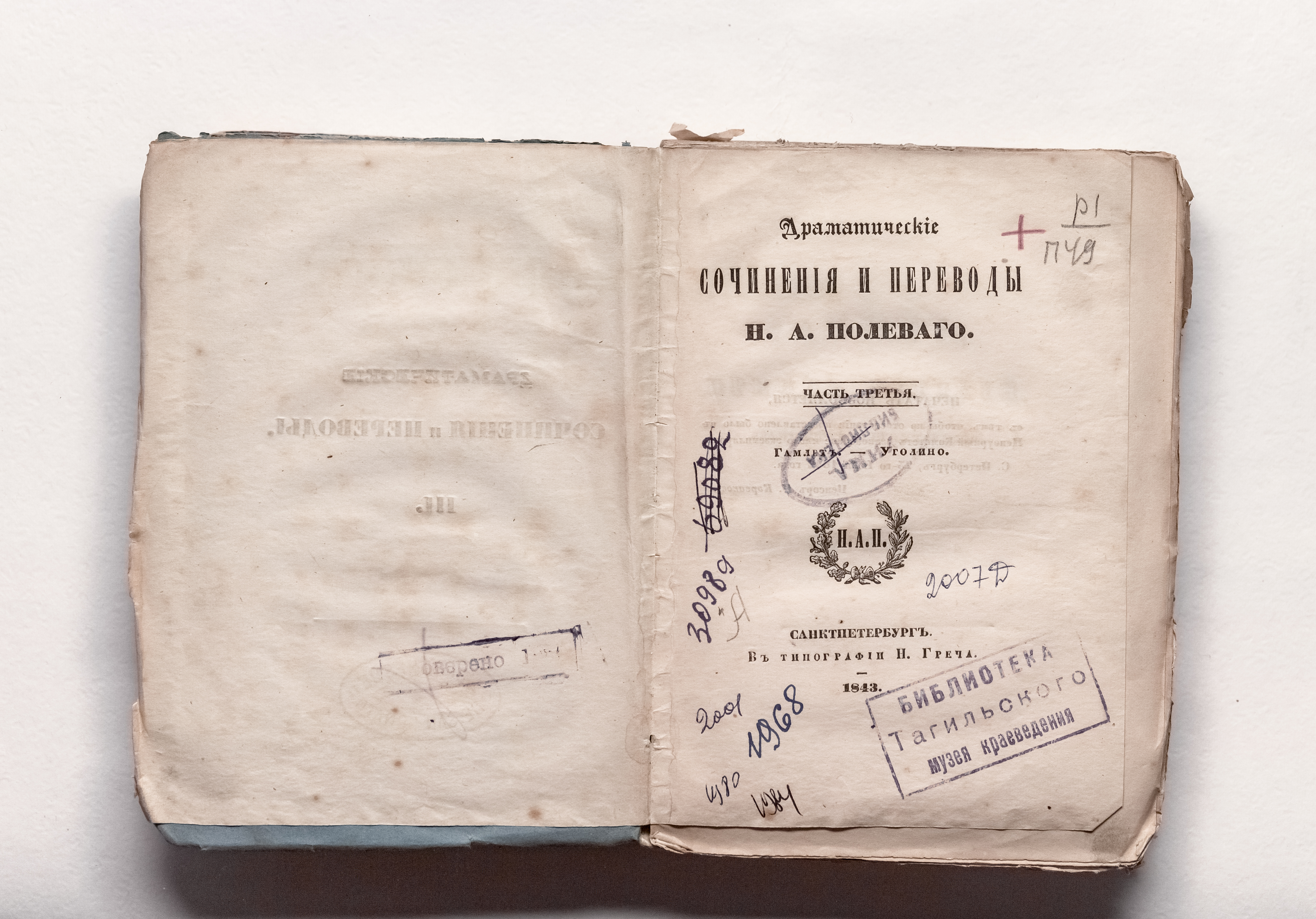 Полевой, Н. А.(1796 – 1846). Драматические сочинения и переводы Н.А. Полевого : Ч. 1-4. – Санкт-Петербург : тип. Н. Греча, 1842-1843.