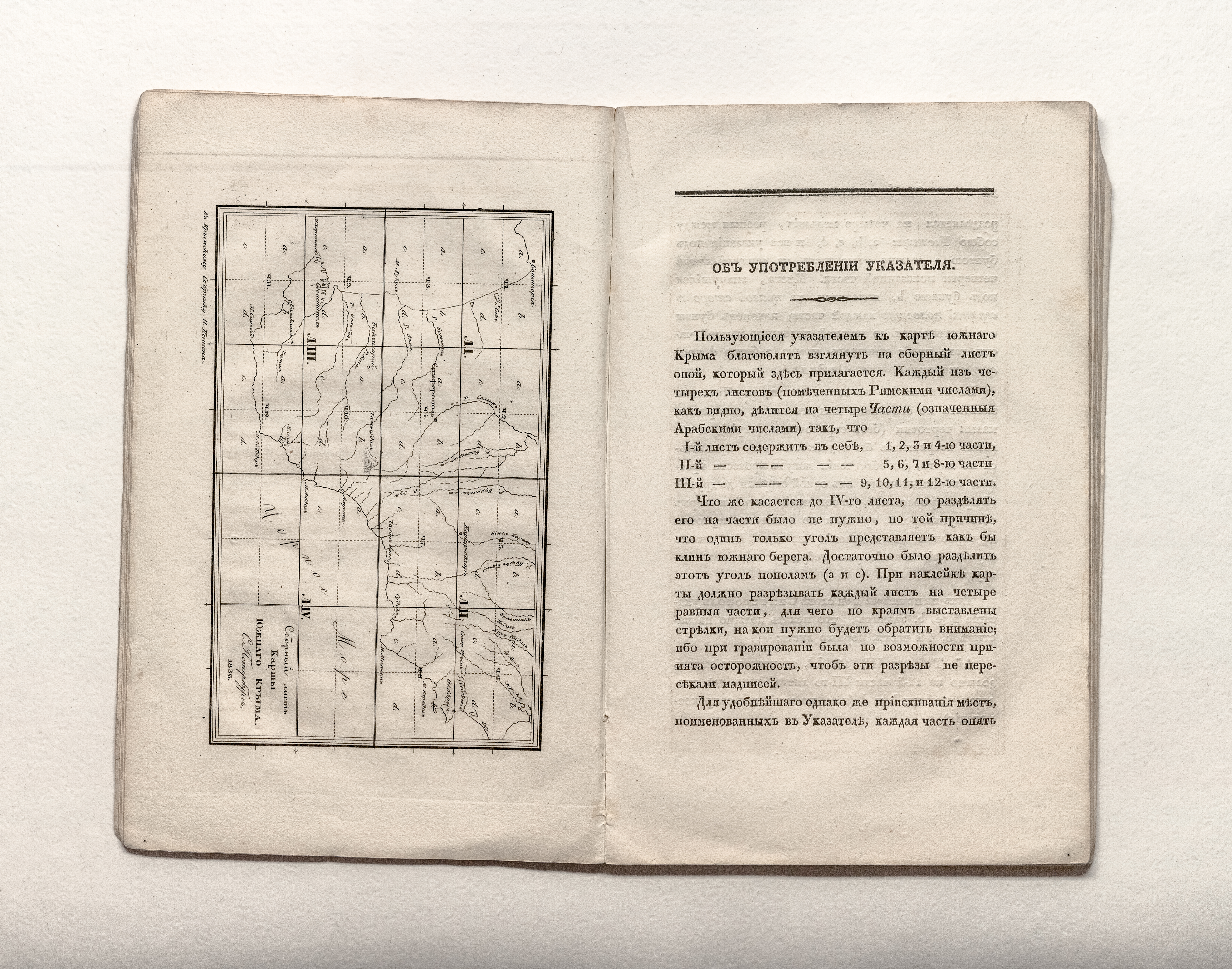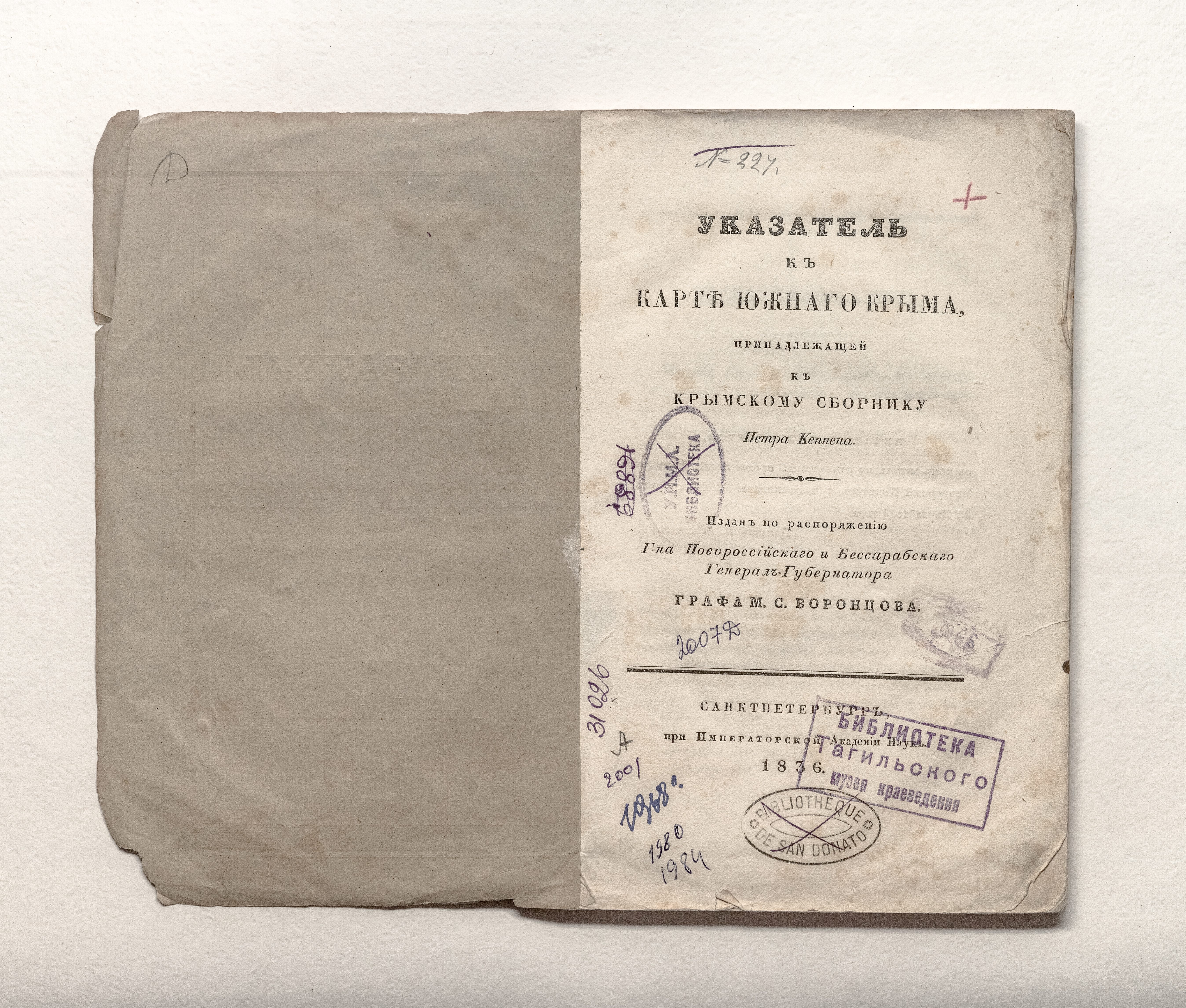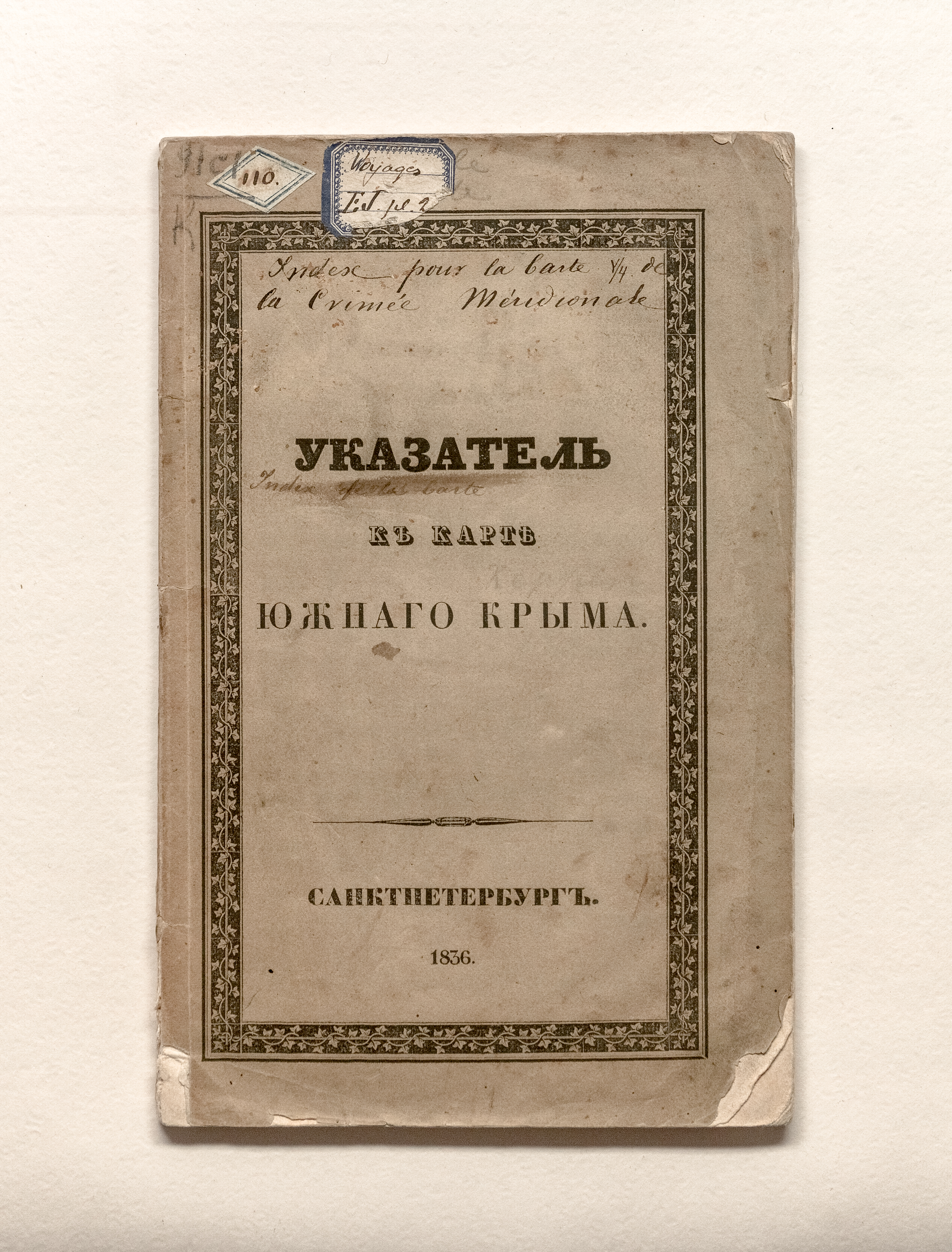 Кеппен, П. И. (1793 – 1864). Указатель к карте Южного Крыма, принадлежащей к Крымскому сборнику Петра Кеппена / П. И. Кеппен ; издан по распоряжению Г-на Новороссийского и Бессарабского генерал-губернатора графа М.С. Воронцова. – Санкт-Петербург : Имп. Академия наук, 1836. – 68, [2] с. : ил. ; 22,5х14,5 см.