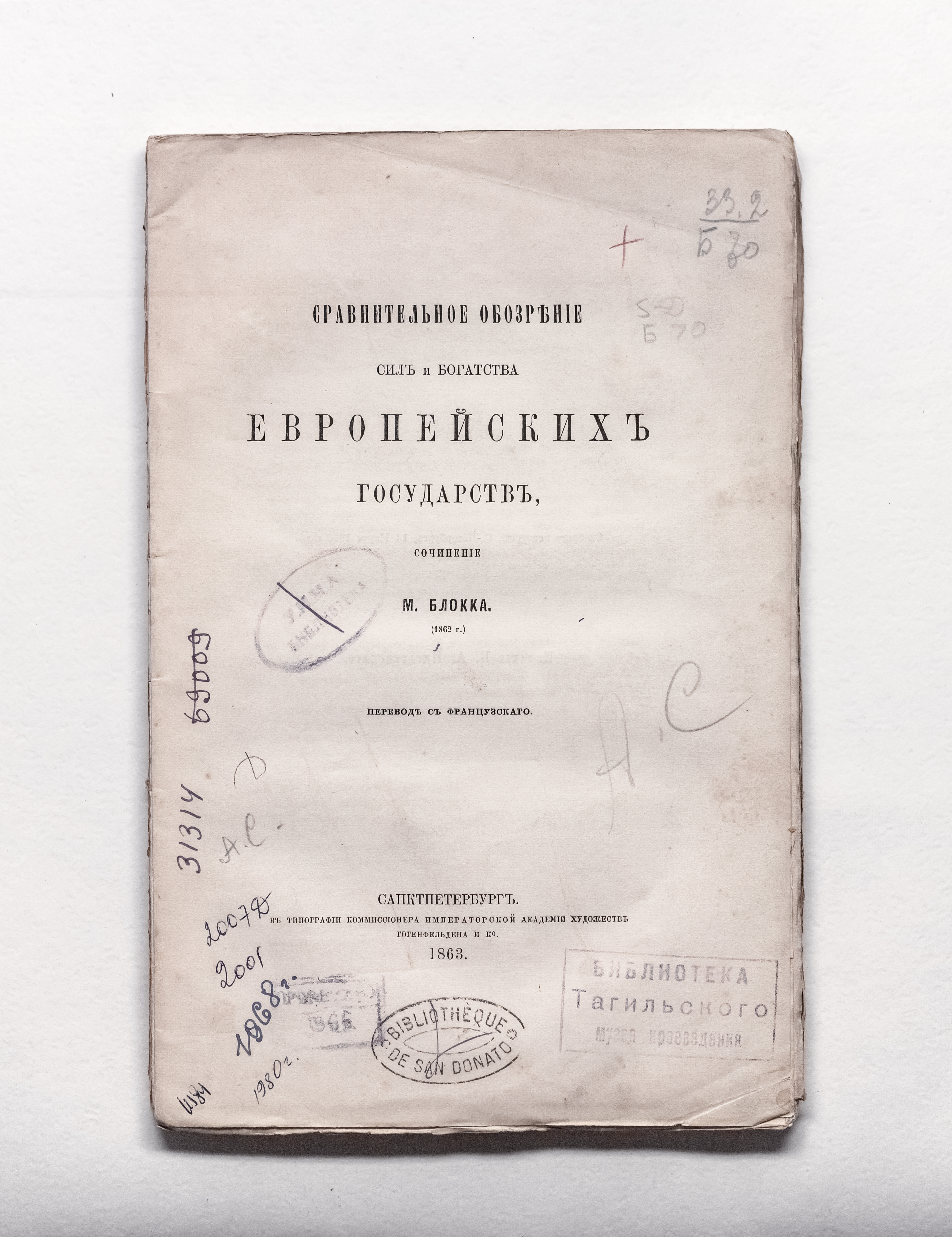 Блокк, М. (1816 – 1901). Сравнительное обозрение сил и богатства европейских государств : пер. с фр. / соч. М. Блокка (1862 г.). – Санкт-Петербург : тип. Гогенфельдена и К, 1863. – IV, 166, [1] с. ; 25х16,5 см.