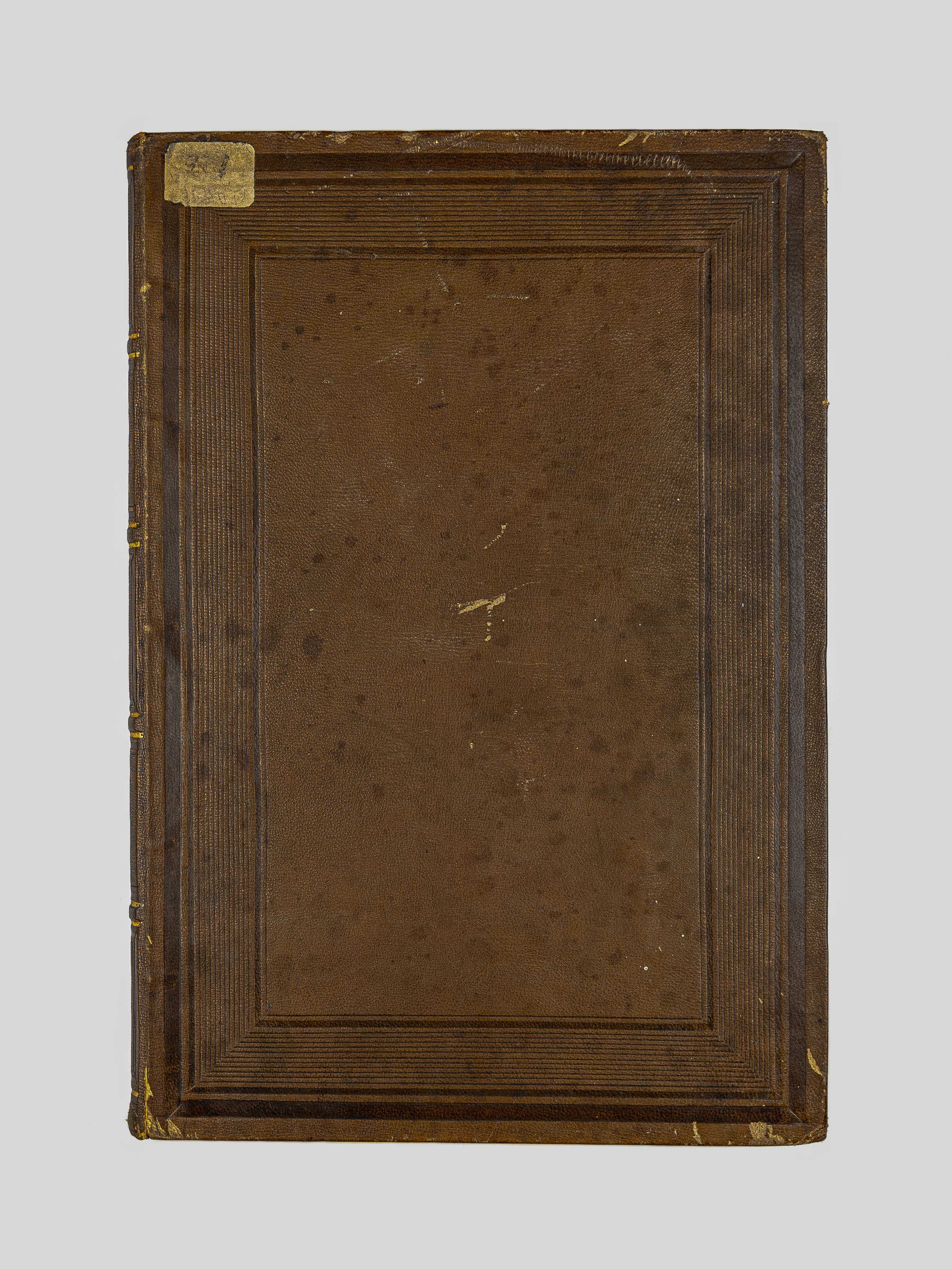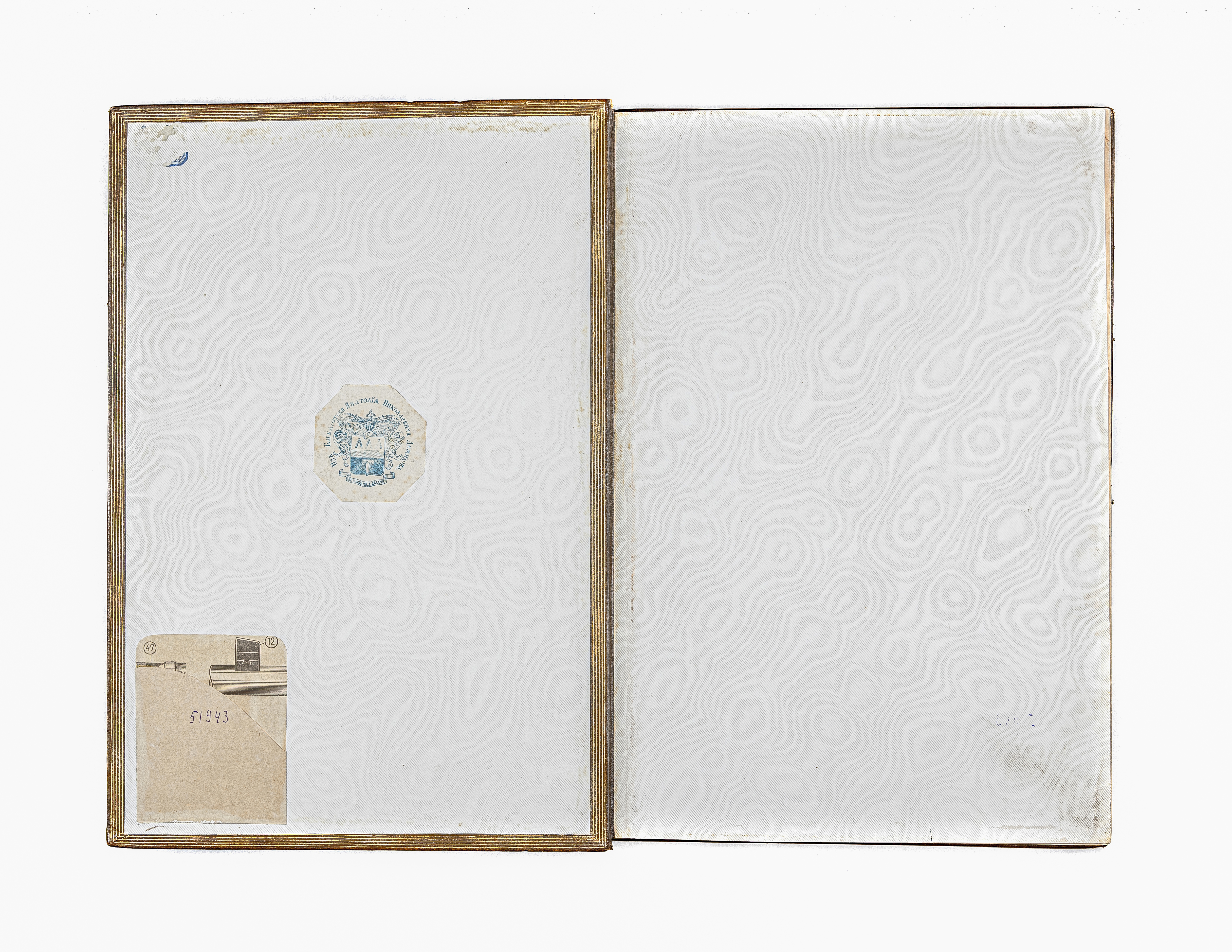 Книга в цельнокожаном владельческом переплете. Форзацы украшены бумагой с отделкой под муаровый шелк.
