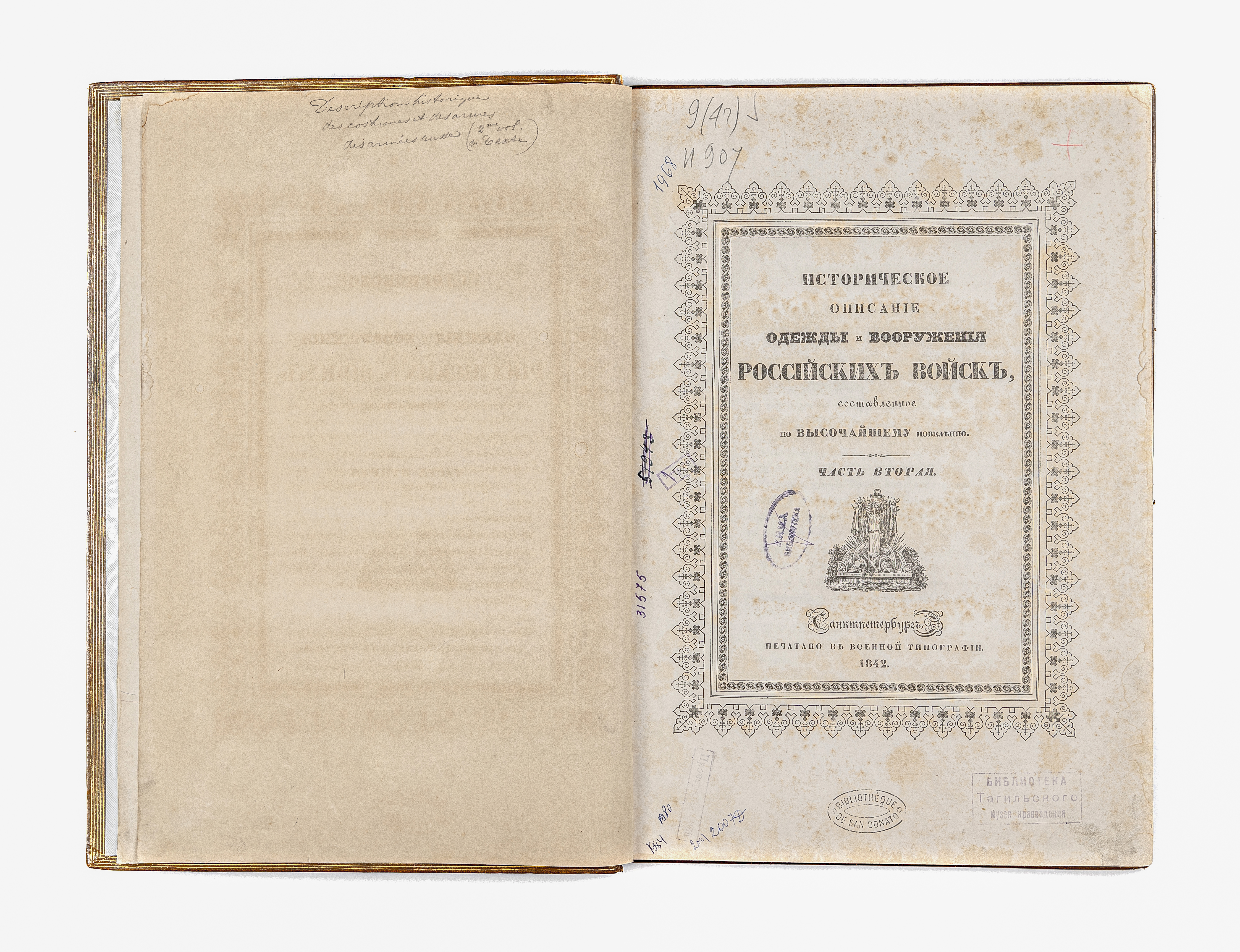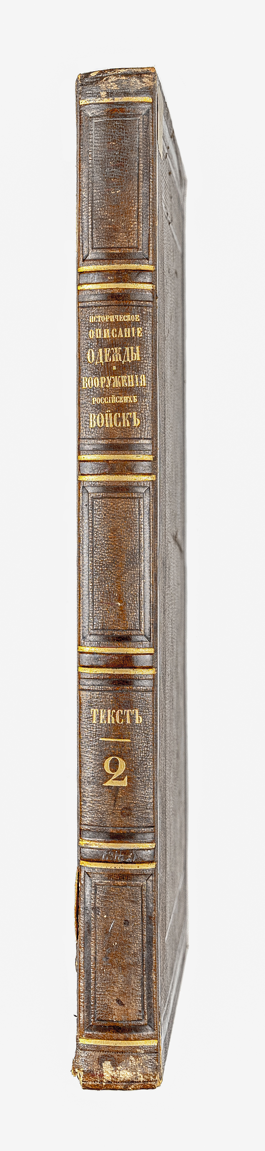 Золототисненое заглавие «Историческое описание одежды и вооружения Российских войск. Текст. 2» (на корешке перепл.).