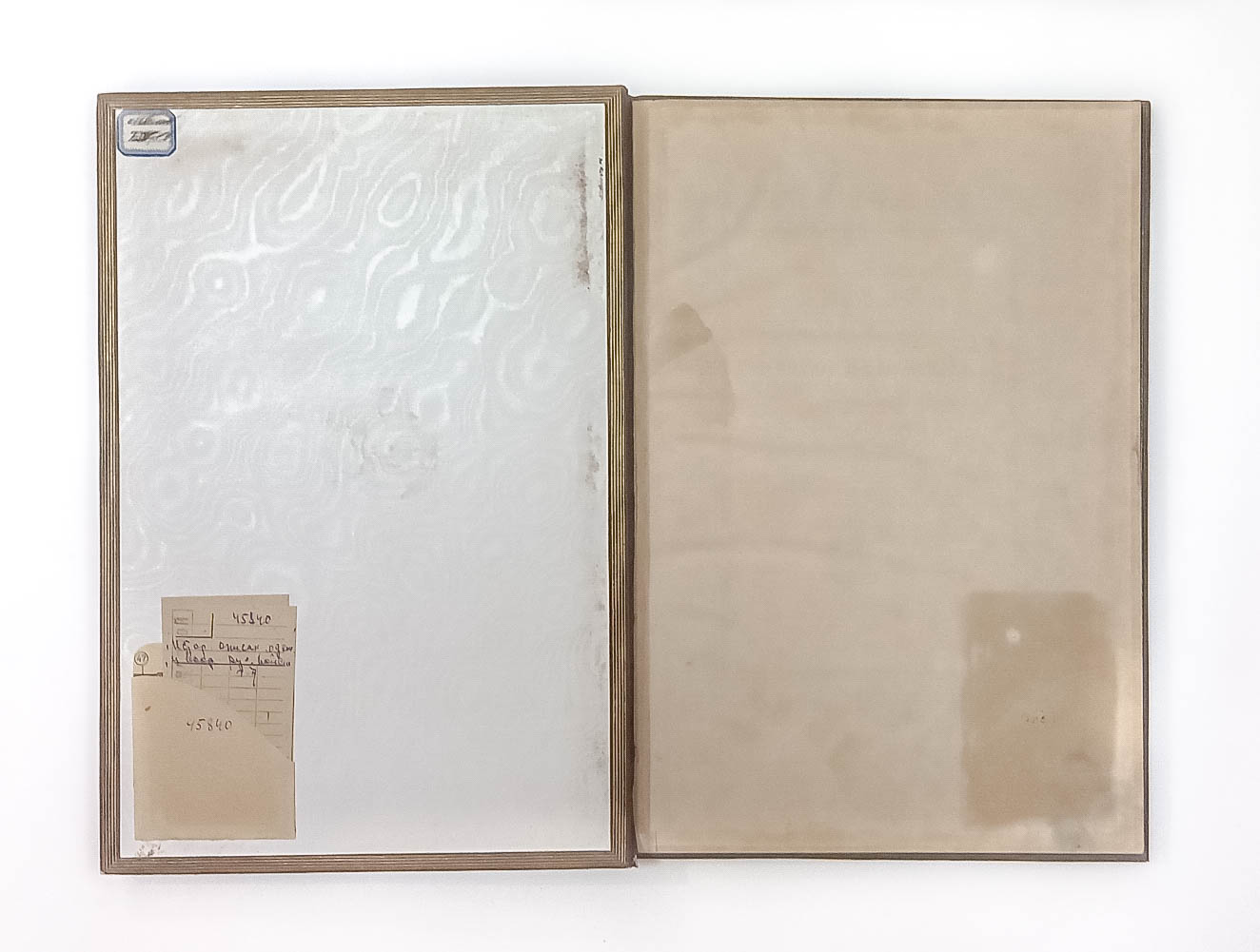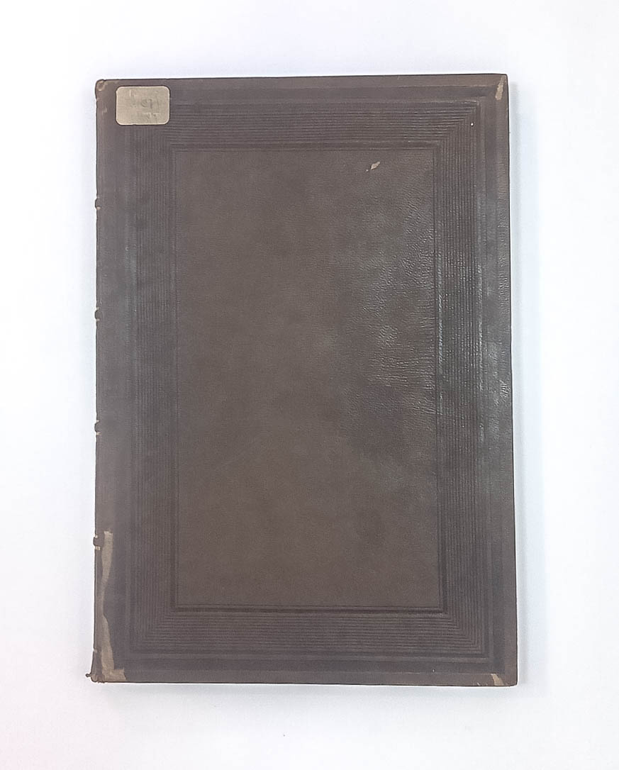 Книга в цельнокожаном владельческом переплете. Форзацы украшены бумагой с отделкой под муаровый шелк.