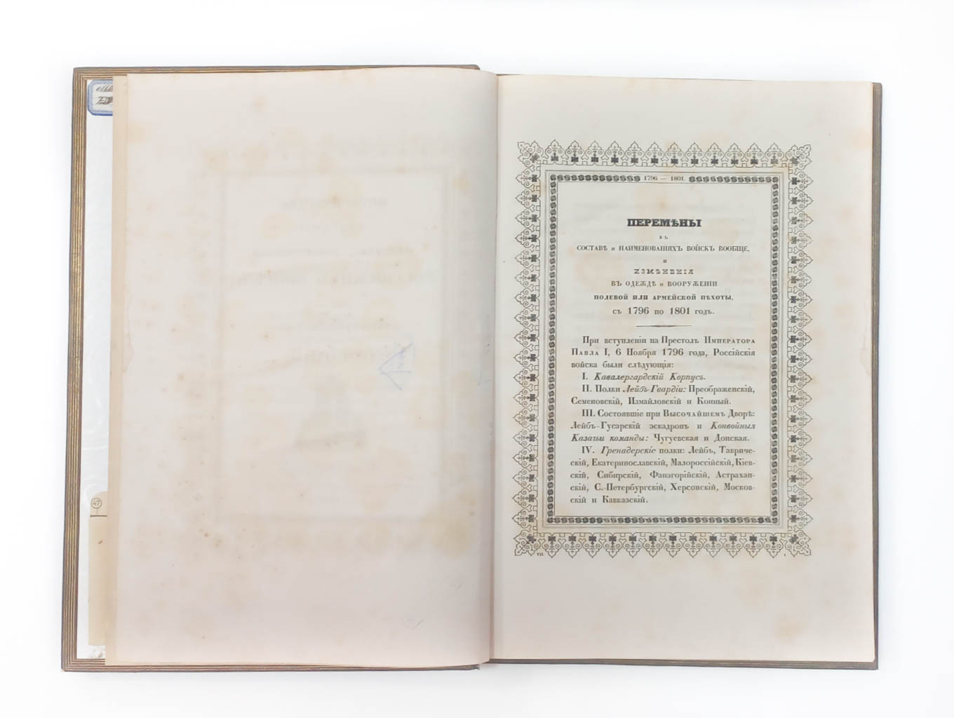 Ч.7. Перемены в составе и наименованиях войск вообще, и изменения в одежде и вооружении… с 1796 по 1801 год. – Санкт-Петербург : военная типография, 1848. – [2], 172, XIX с. ; 40х27,5 см.