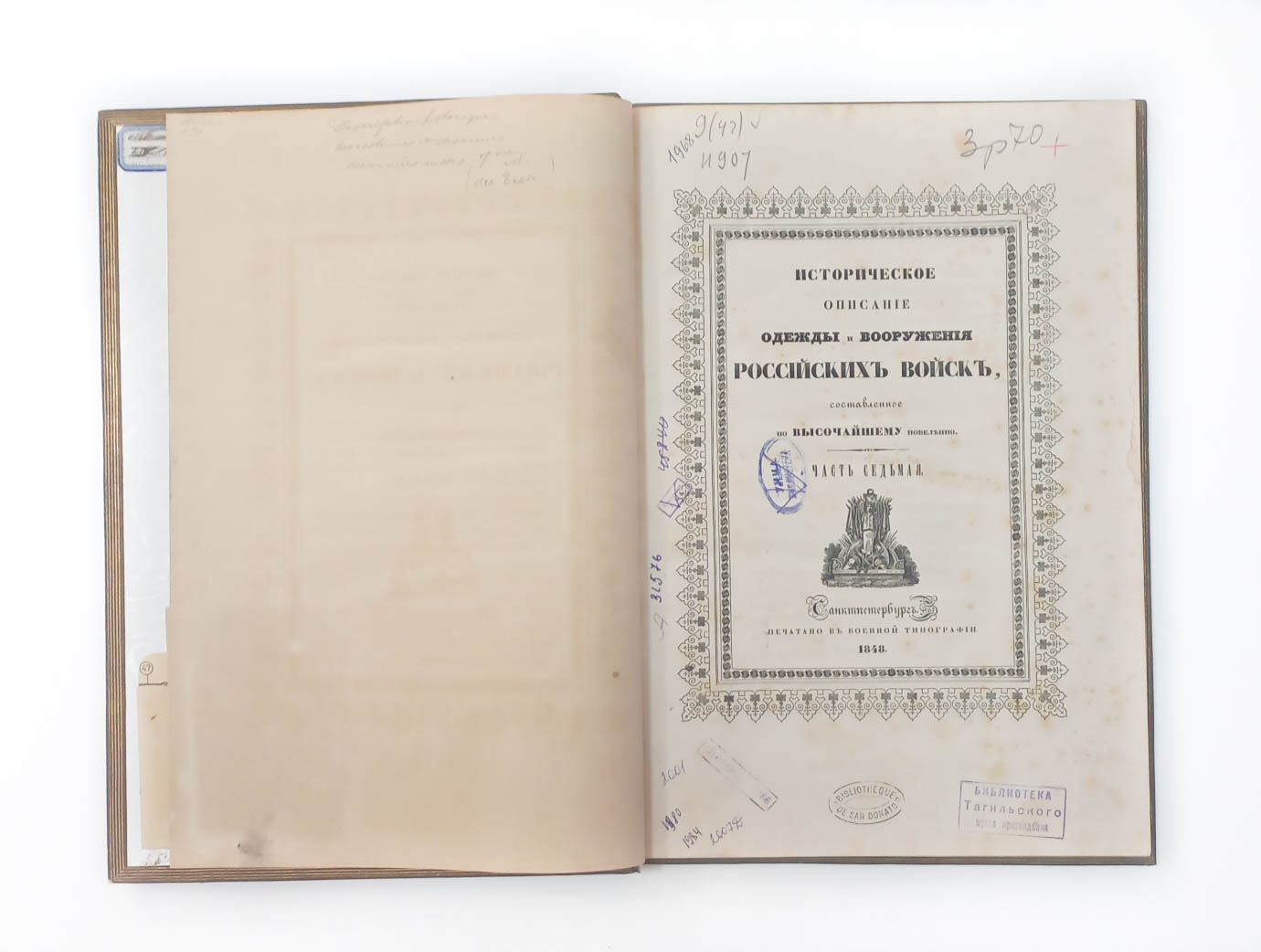 Золототисненое заглавие «Историческое описание одежды и вооружения Российских войск. Текст. 7» (на корешке перепл.).