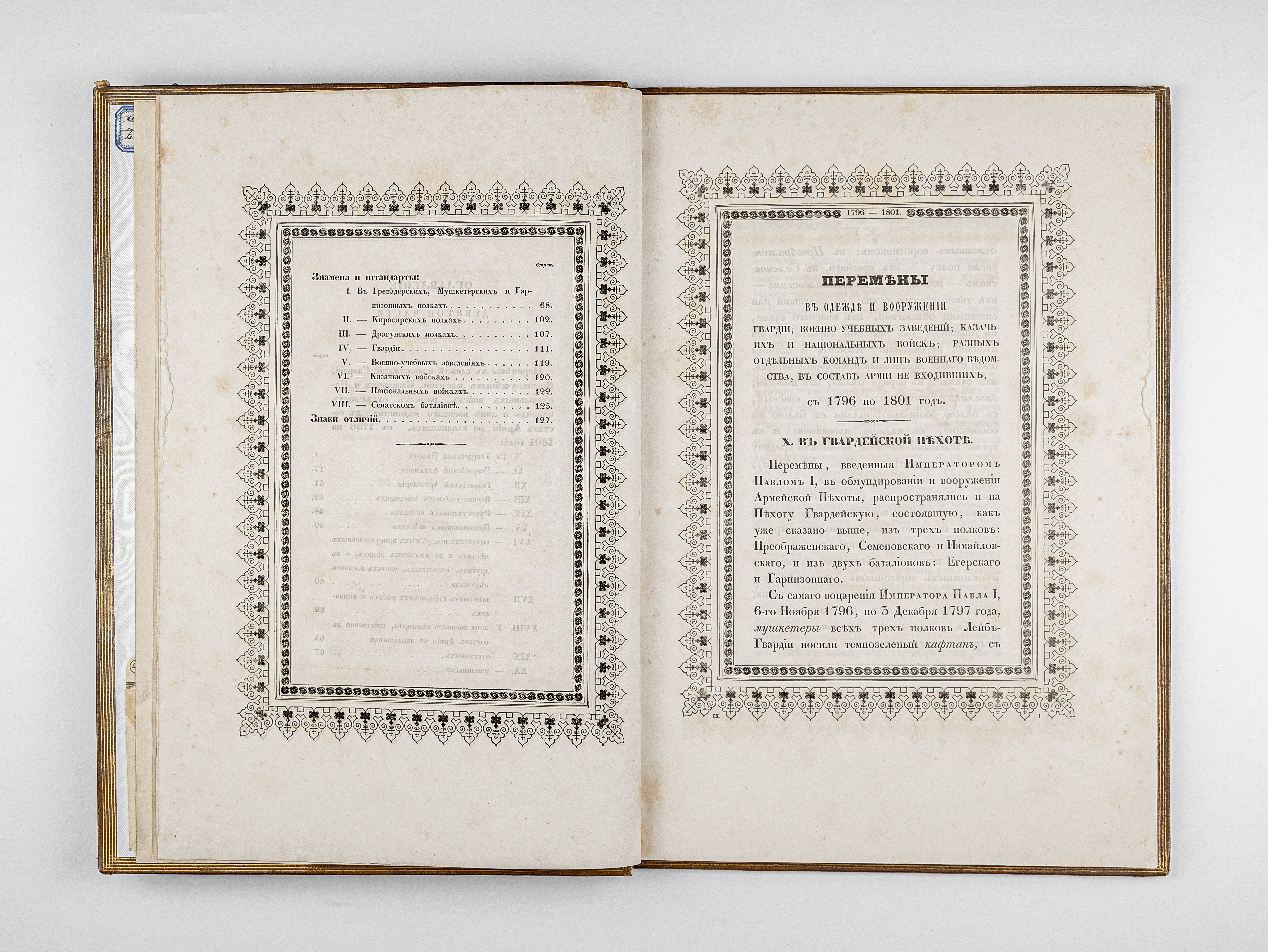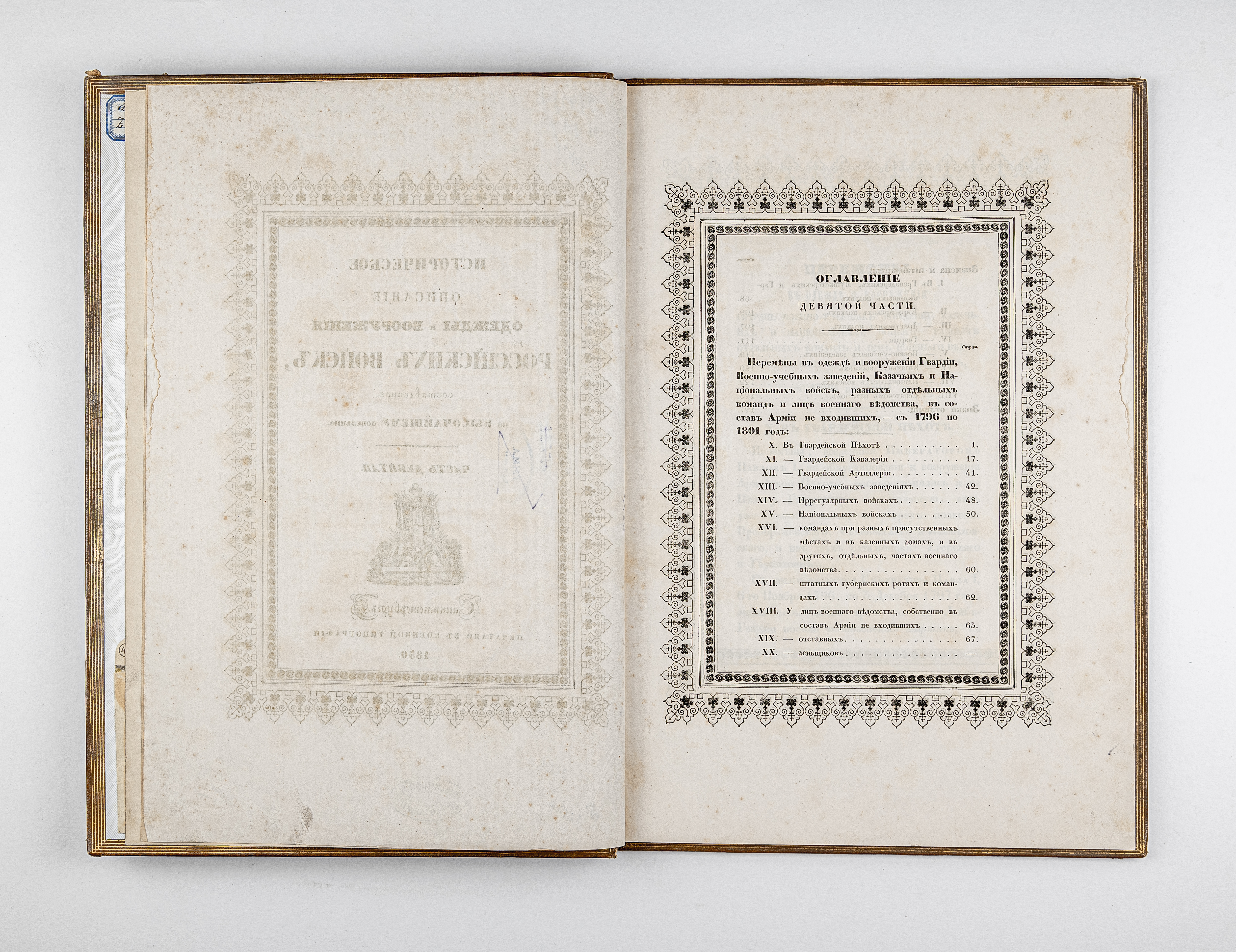 Ч. 9. Перемены в одежде и вооружении Гвардии… с 1796 по 1801 год. – Санкт-Петербург : военная типография, 1850. – [2], 130, XL с. ; 40х27,5 см.