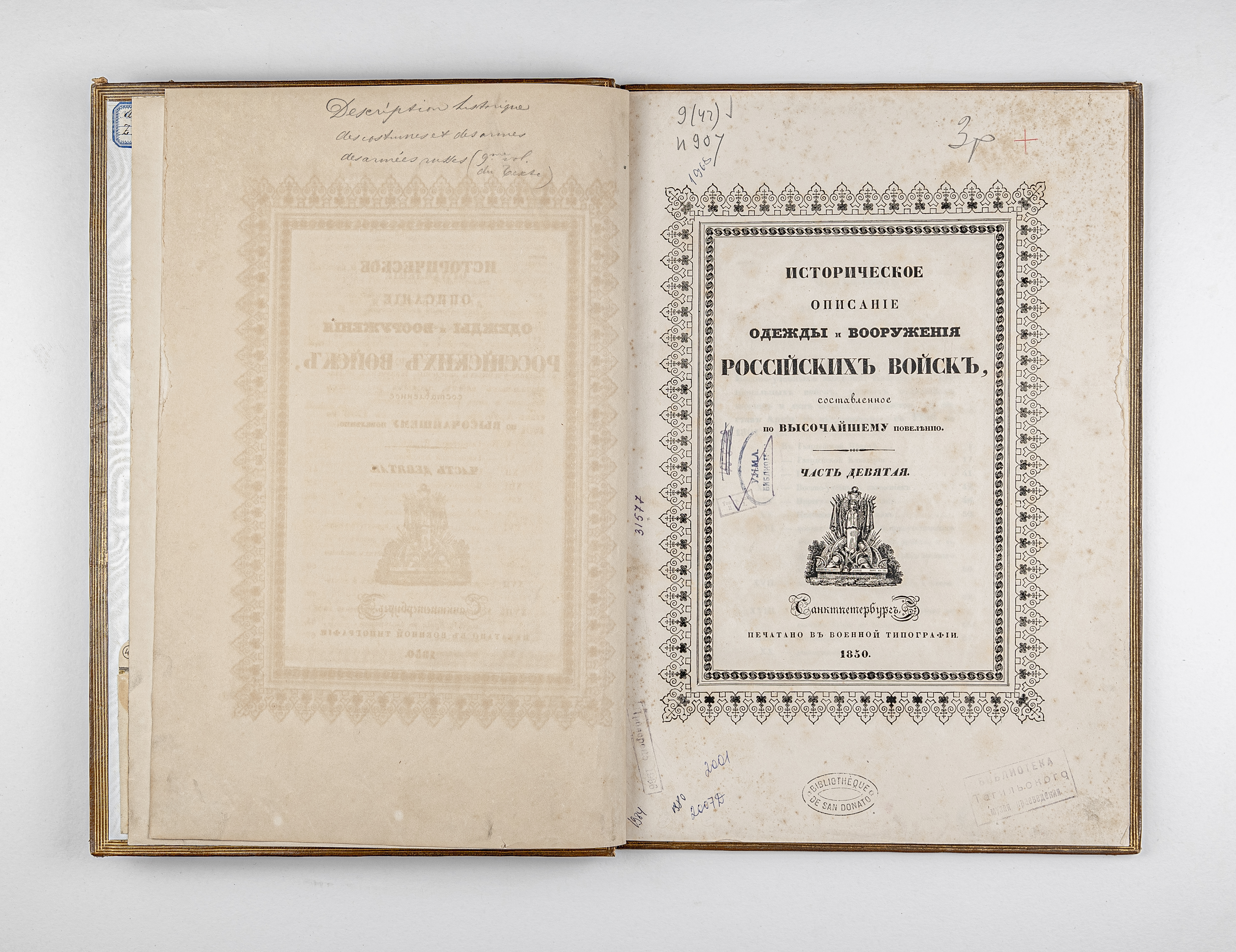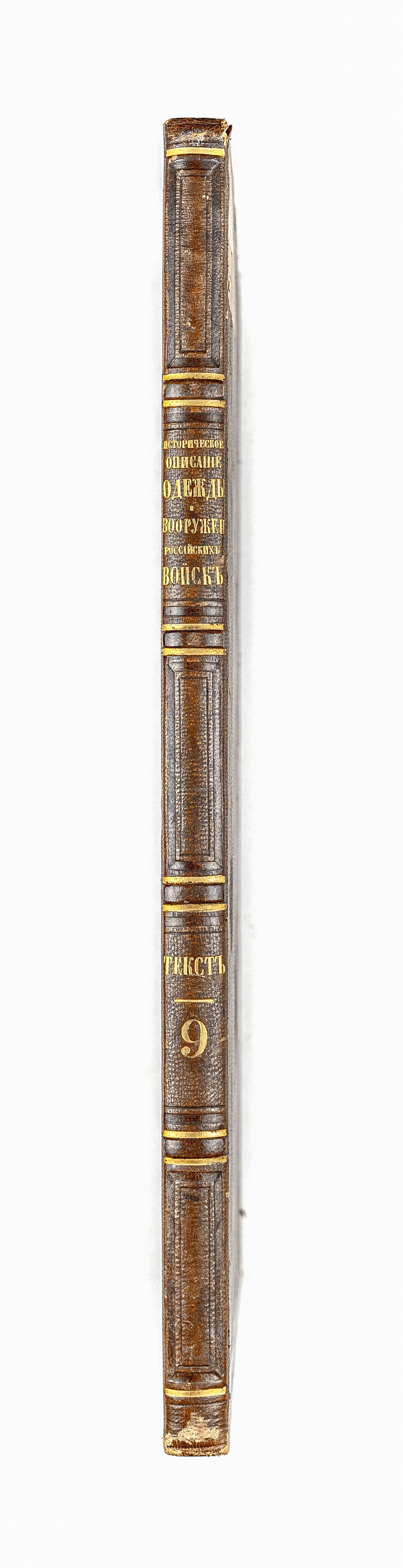 Золототисненое заглавие «Историческое описание одежды и вооружения Российских войск. Текст. 9» (на корешке перепл.).