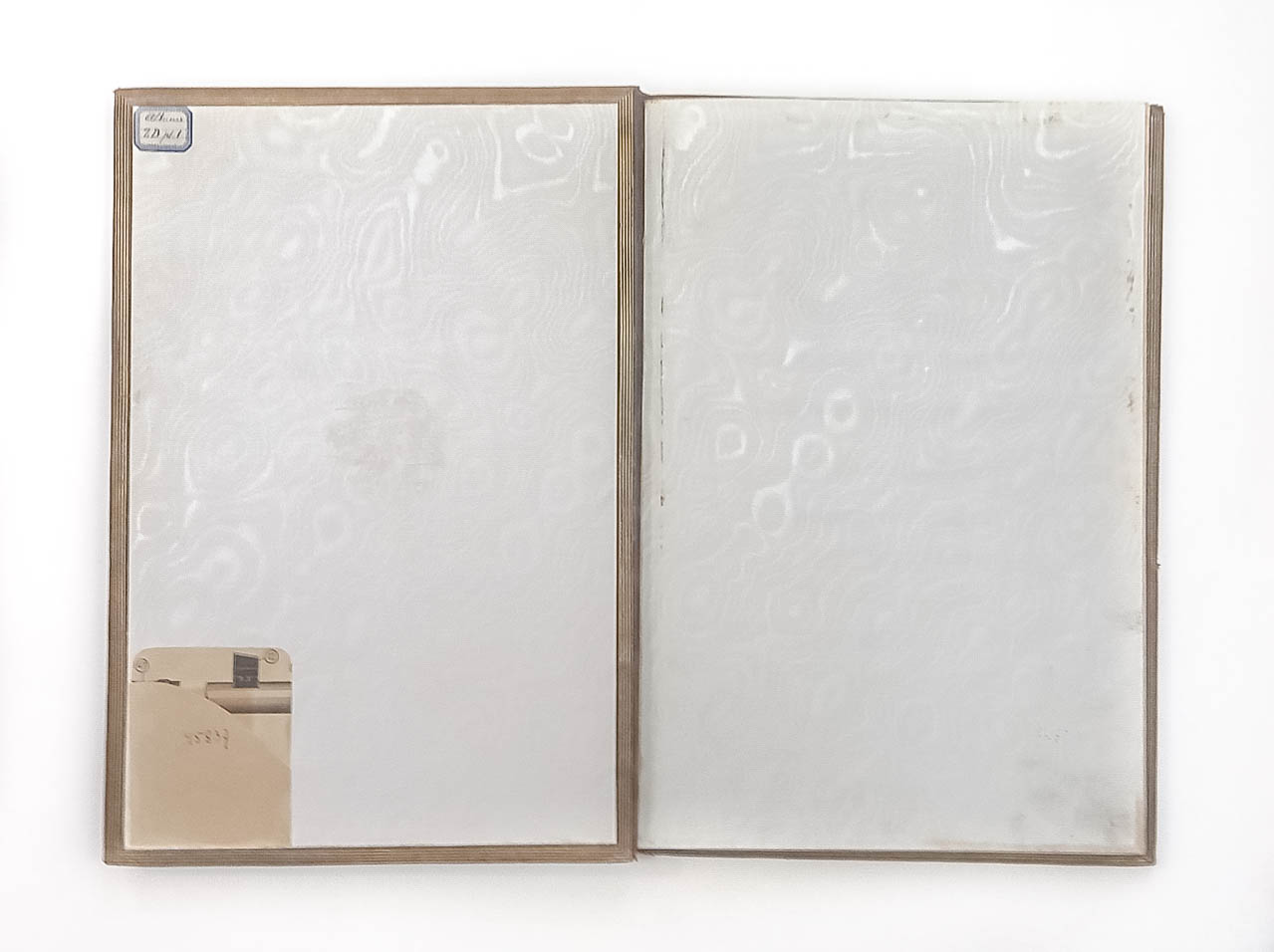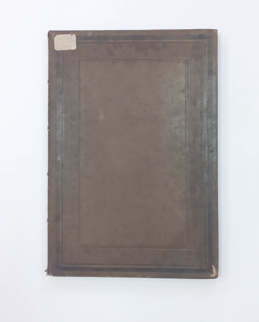 Книга в цельнокожаном владельческом переплете. Форзацы украшены бумагой с отделкой под муаровый шелк.