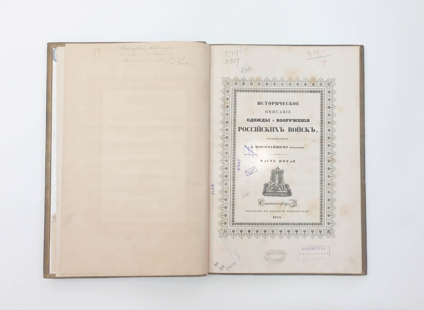 Золототисненое заглавие «Историческое описание одежды и вооружения Российских войск. Текст. 5» (на корешке перепл.).