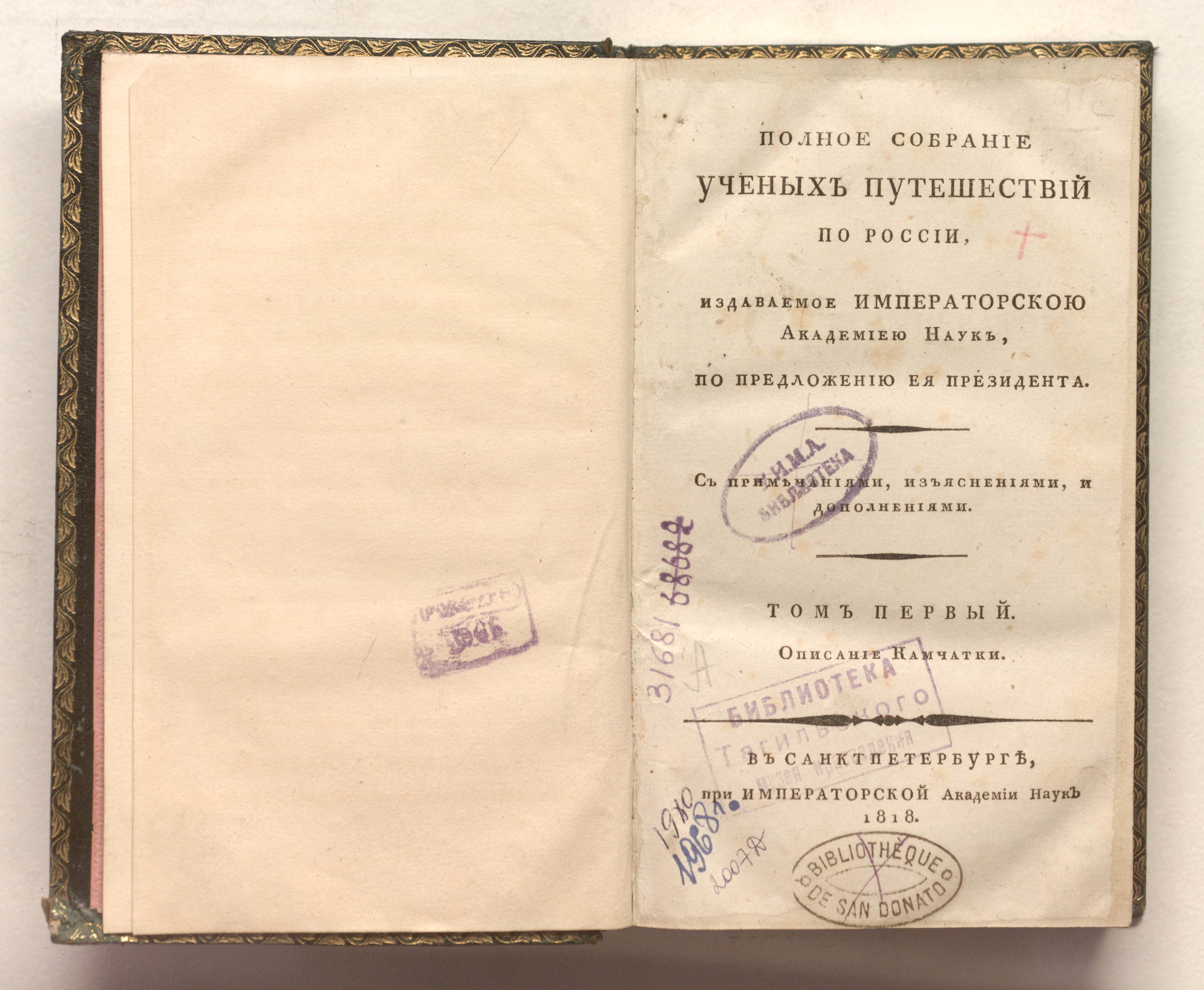 Полное собрание ученых путешествий по России, издаваемое Императорскою Академиею Наук, по предложению ее президента : с примечаниями, изъяснениями, и дополнениями. – в Санктпетербурге : при Императорской академии наук, 1818 - 1825. Т. 1 : Описание Камчатки / [соч. С. Крашенинникова]. – 1818. – XXXIV, 493, [2] с. ; 20 см.