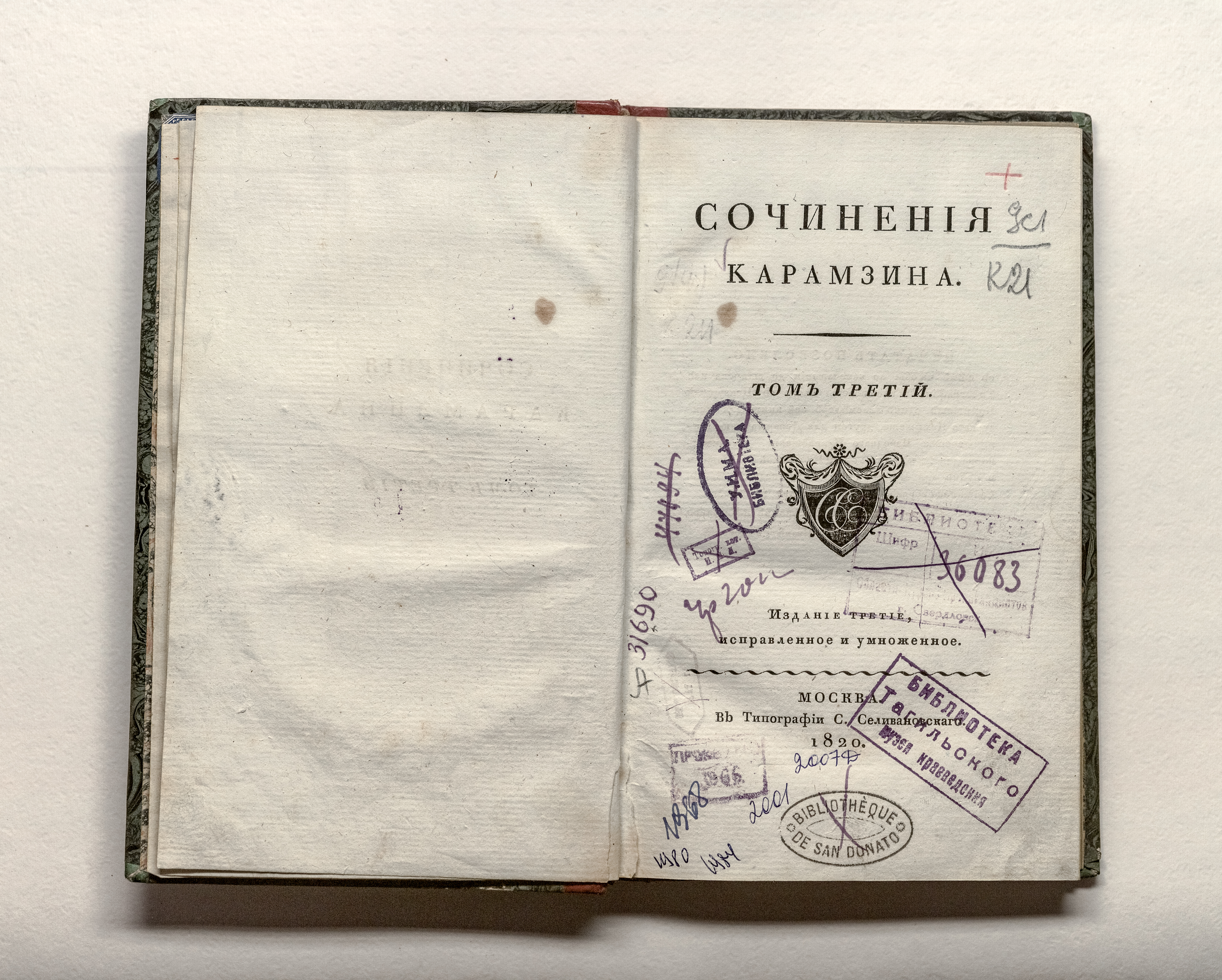 Карамзин, Н. М. (1766 – 1826). Сочинения Карамзина / Н. М. Карамзин. Изд. 3-е, испр. и умноженное. Т. 3. – Москва : тип. С. Селивановскаго, 1820. – 214, [2] с. ; 23х14 см.