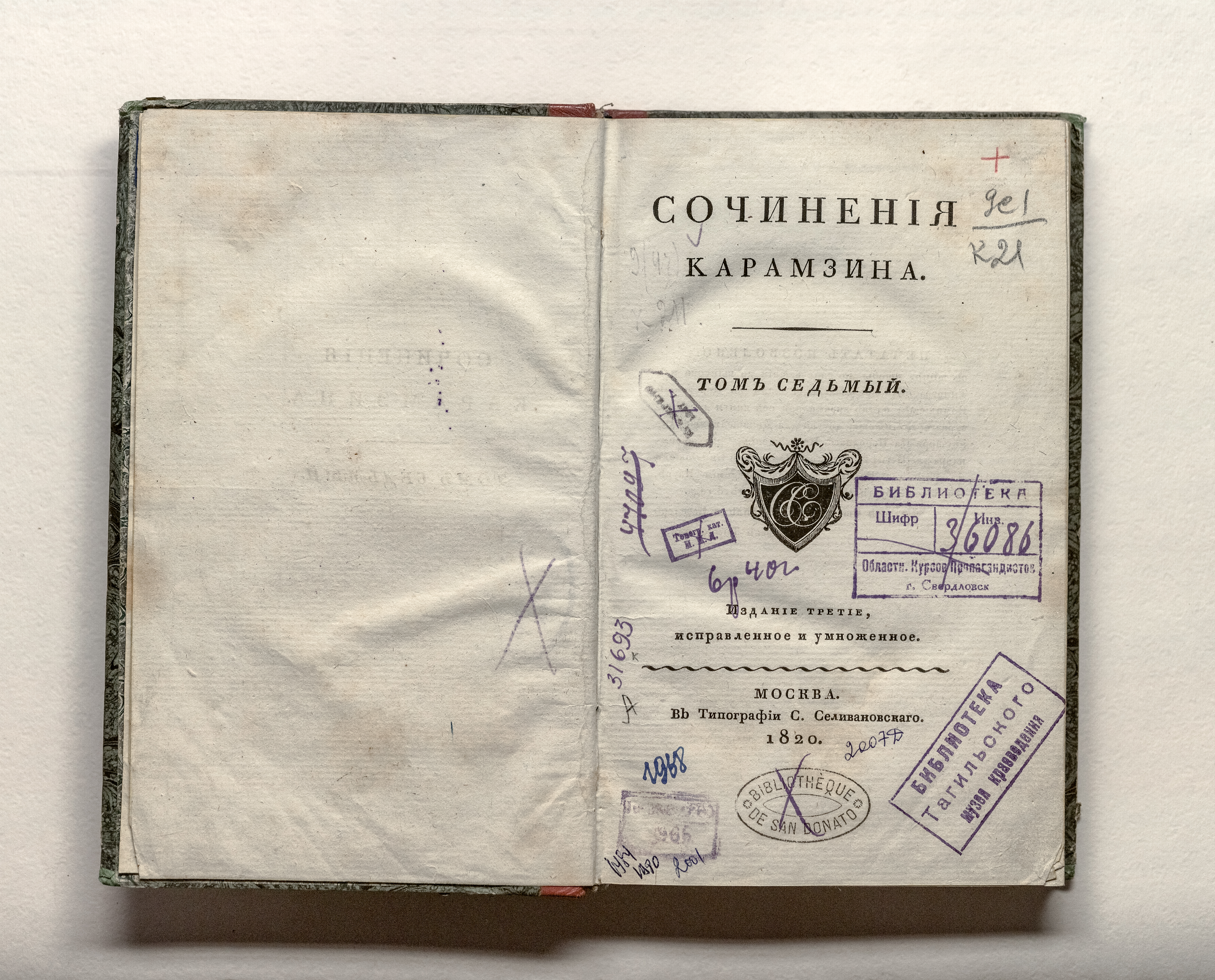 Карамзин, Н. М. (1766 – 1826). Сочинения Карамзина / Н. М. Карамзин. Изд. 3-е, испр. и умноженное. Т. 7. – Москва : тип. С. Селивановскаго, 1820. – 325, [2] с. ; 23х14 см.
