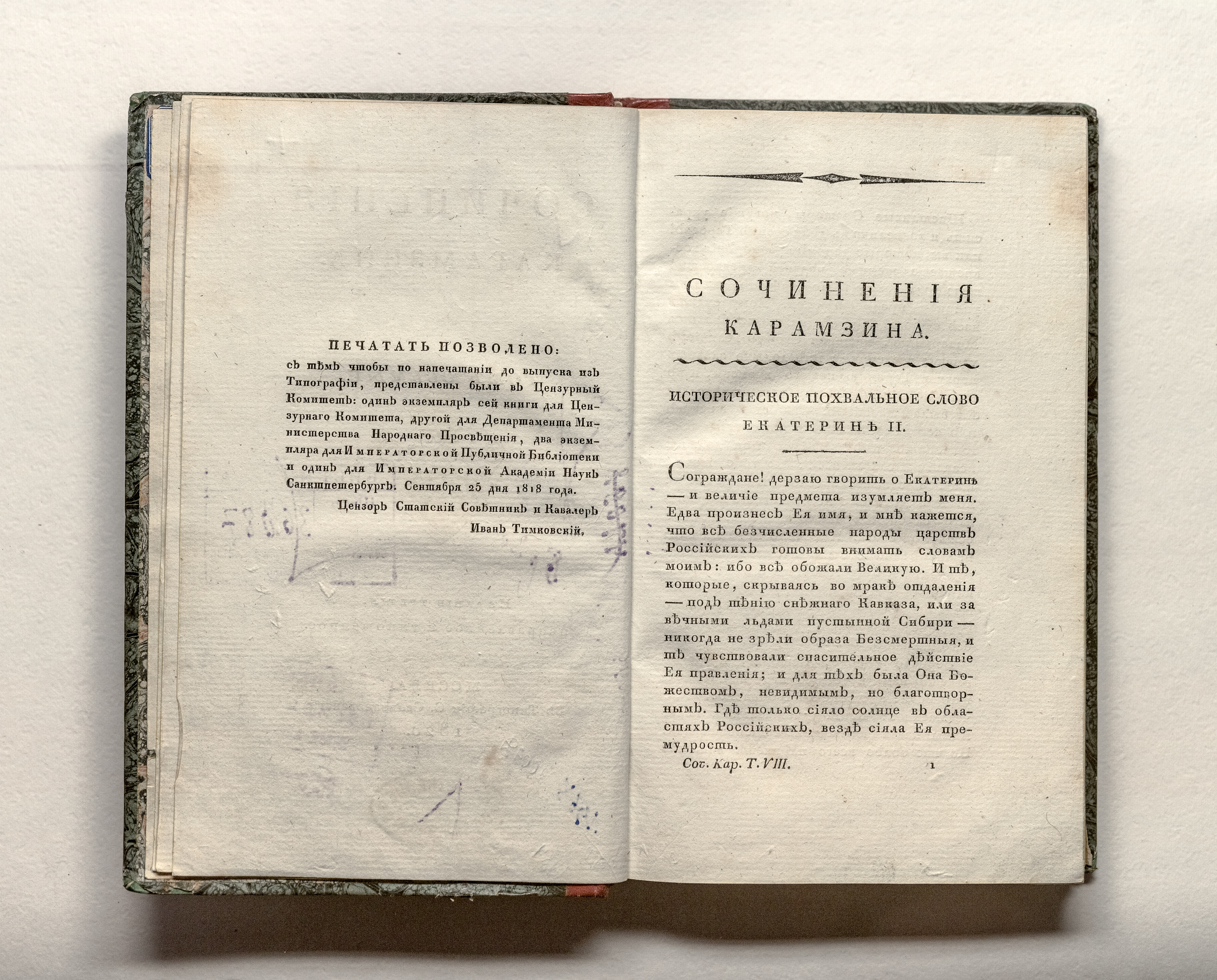 Золототиснение «OEUVRES DE KARAMSINS» (на корешке перепл.).
