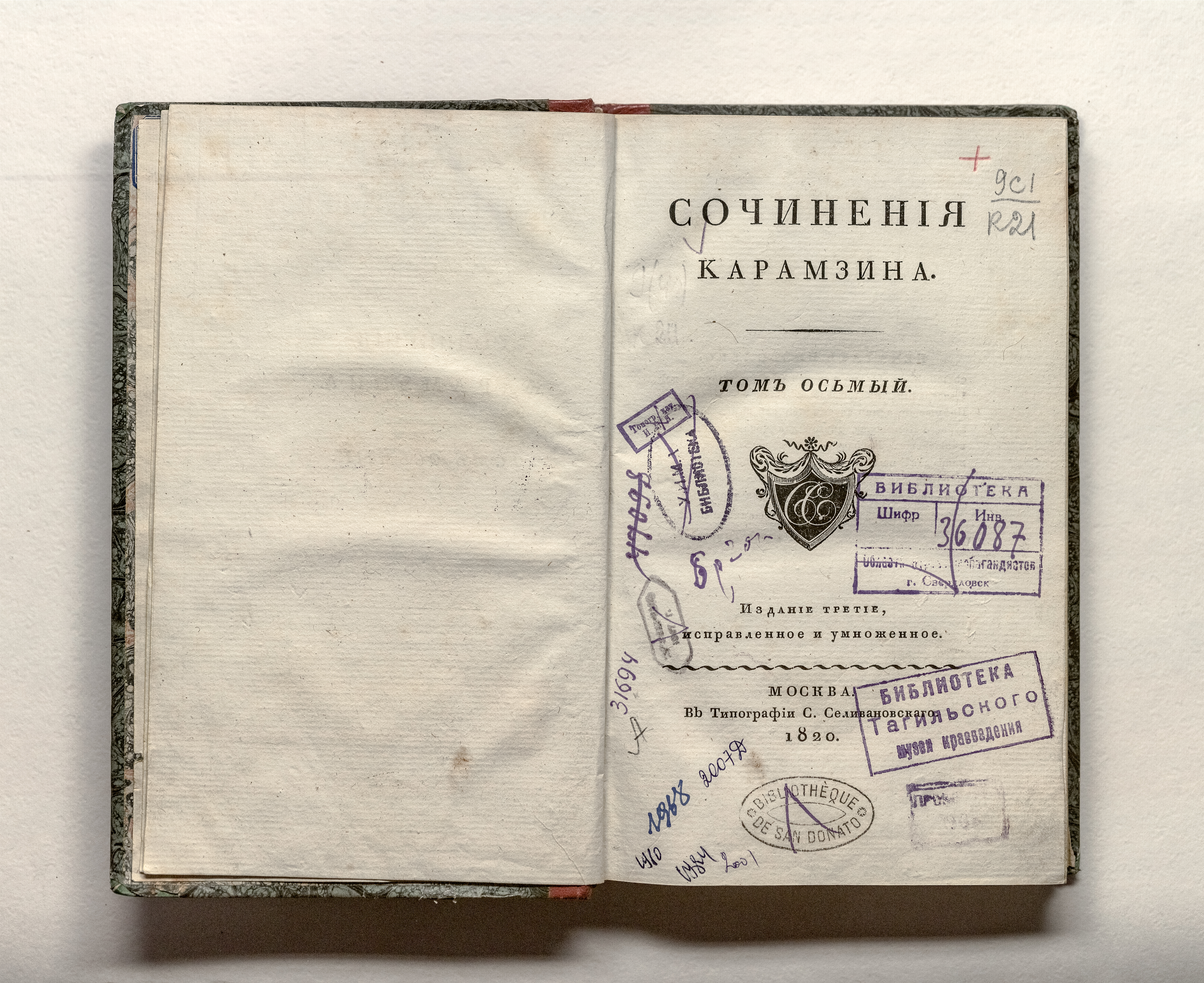 Карамзин, Н. М. (1766 – 1826). Сочинения Карамзина / Н. М. Карамзин. Изд. 3-е, испр. и умноженное. Т. 8. – Москва : тип. С. Селивановскаго, 1820. – 265, [2] с. ; 23х14 см.