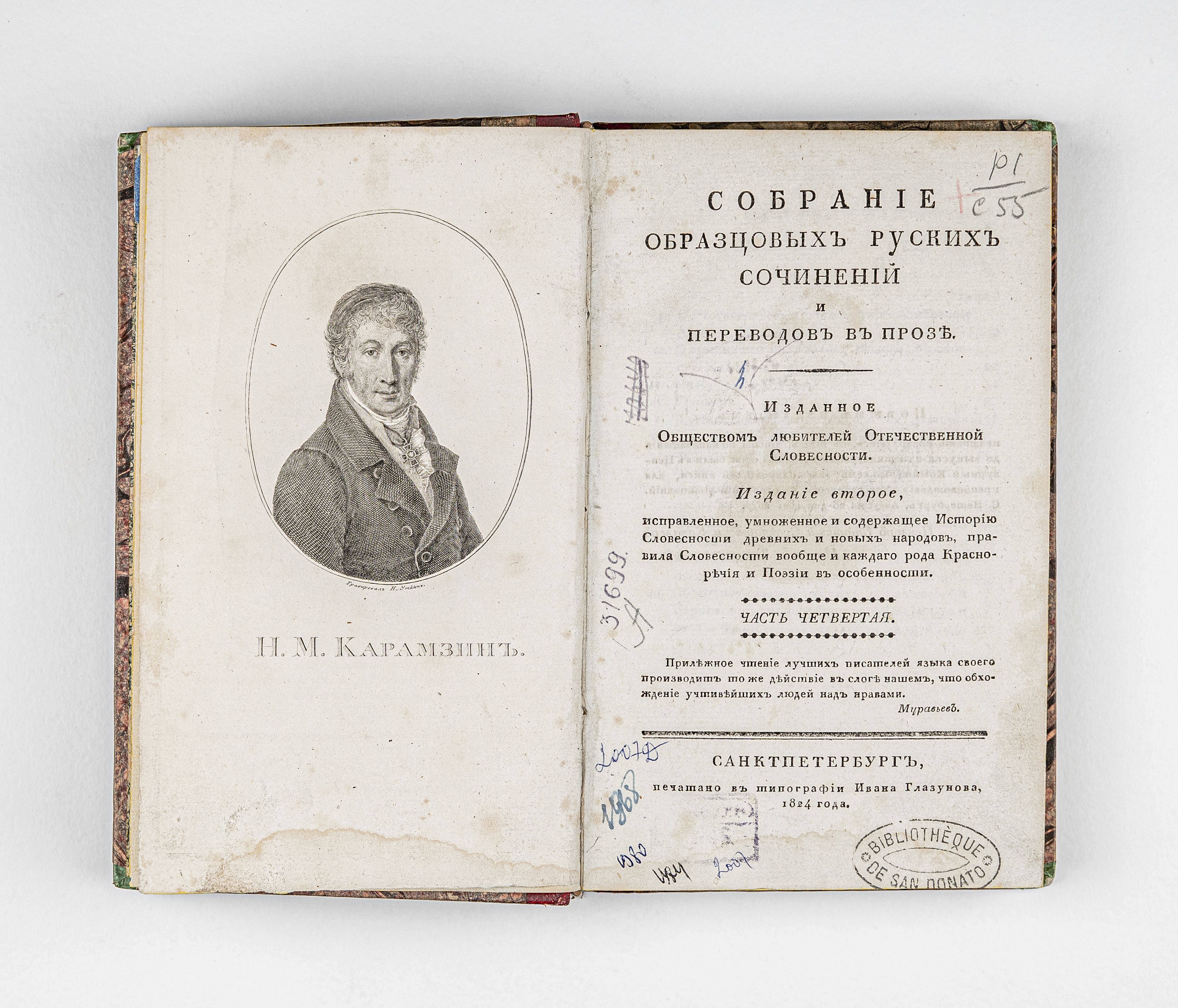 Собрание образцовых русских сочинений и переводов в прозе : [в ? ч.]. Ч. 4 / изданное Обществом любителей отечественной словесности. — 2-е изд., испр. – Санкт-Петербург : тип. Ивана Глазунова, 1824. – CVI-CXXVI, 357 с. : грав. фронт. ; 21х13 см.