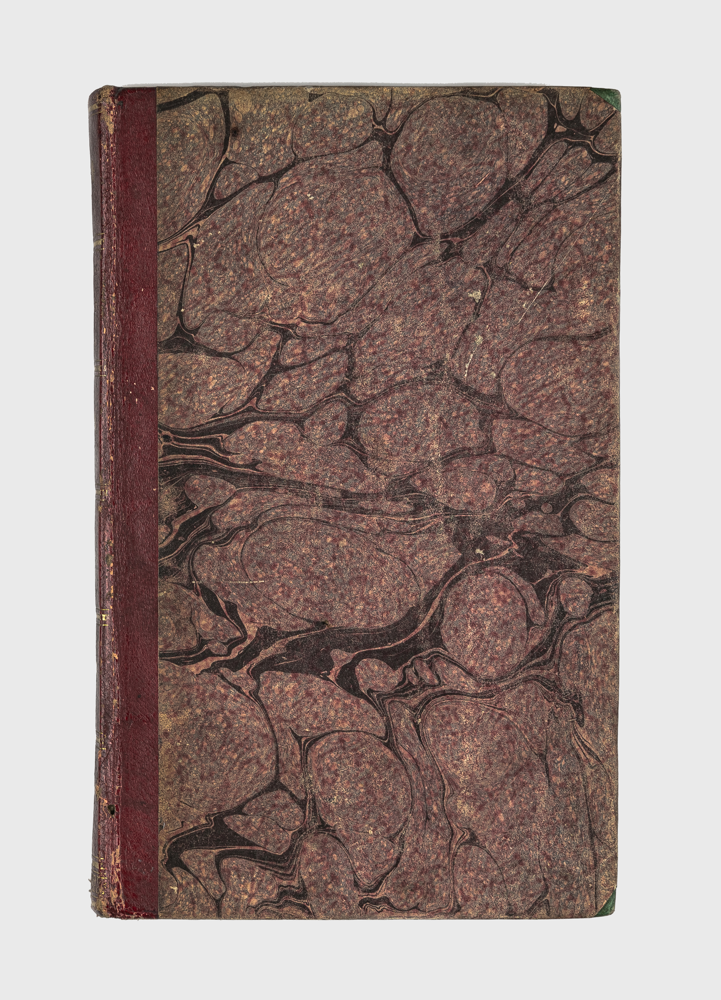 Книга в полукожаном владельческом переплете. Крышки переплета обтянуты бумагой с рисунком «под мрамор». Обрез тонированный. Бумага верже. Задний форзац декорирован бумагой «под мрамор».