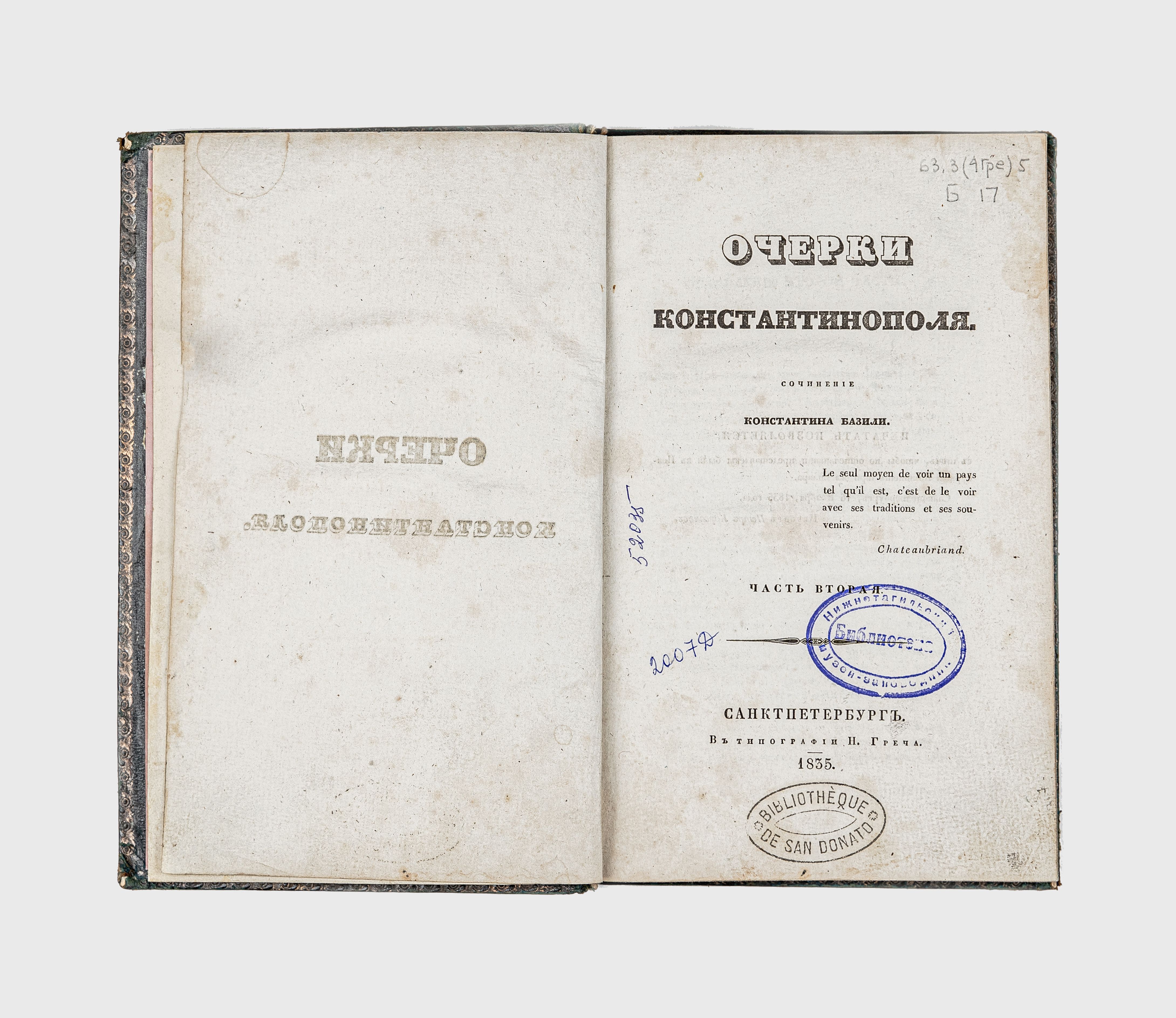 Базили, К. М. (1809-1884). Очерки Константинополя. Ч. 2 / К. М. Базили. – Санкт-Петербург : тип. Н. Греча, 1835. – 285 с. ; 21,5х13,5 см.