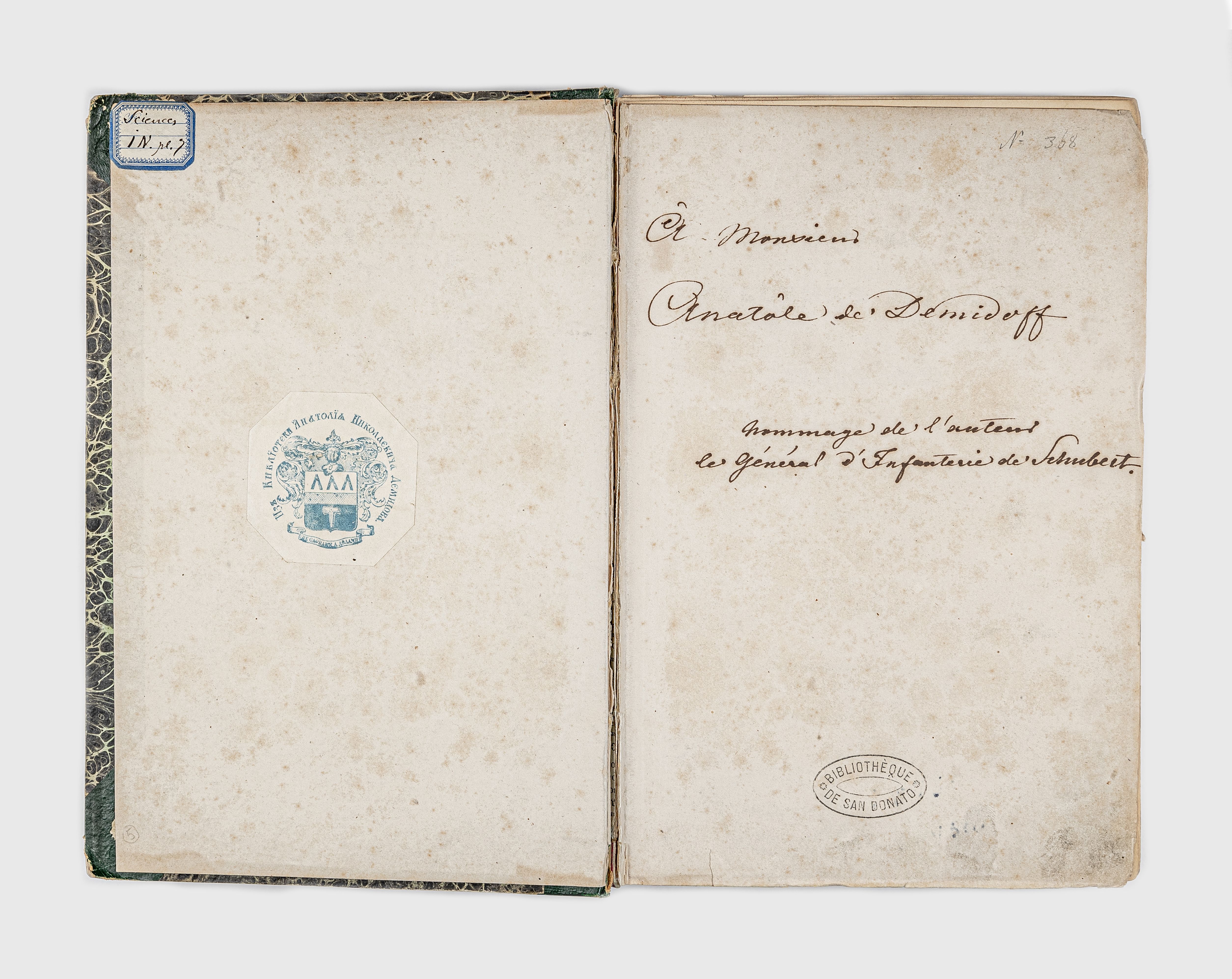 Дарственная надпись на французском языке "A monsiers Anatole de Demidoff hommage de L'auteur. Le general d'Infanterie de Chubert " Перевод: Господину Анатолию Демидову c почтением автор. Генерал от инфантерии Шуберт» (форзац).