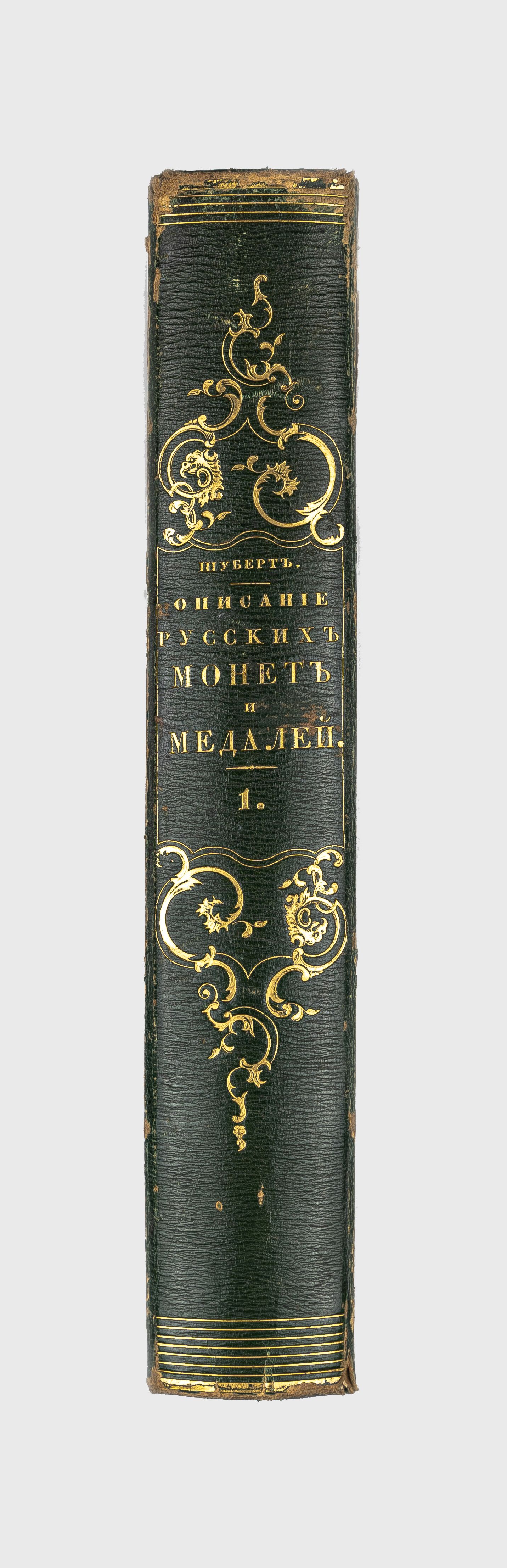 Золототисненое заглавие «Шубертъ, описание русских монет и медалей. 1» (на корешке перепл.).