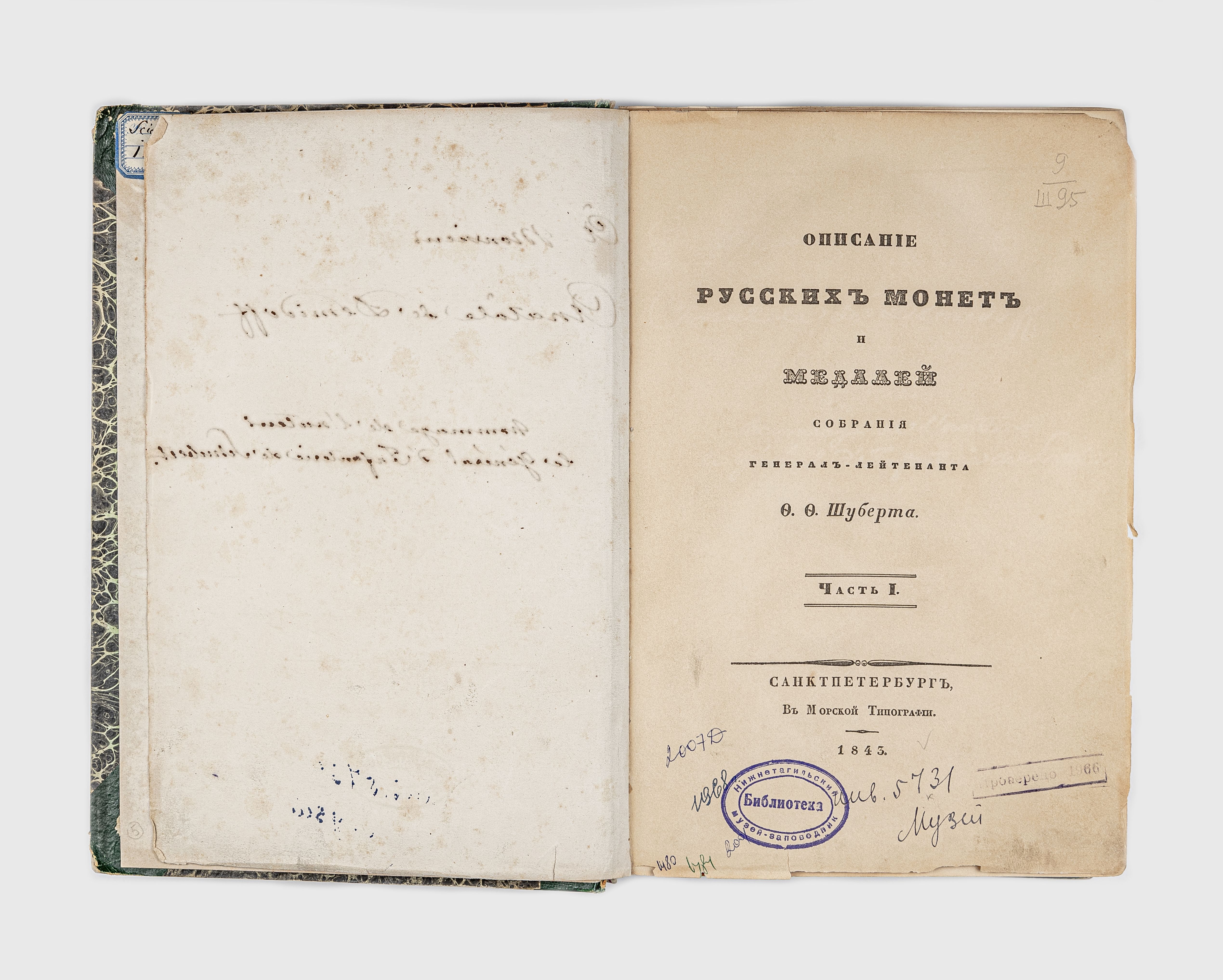 Шуберт, Фёдор Фёдорович (1789-1865). Описание русских монет и медалей собрания генерал-лейтенанта Ф. Ф. Шуберта : Ч. 1 (единственная) / Ф. Ф Шуберт. – Санкт-Петербург : В Морской Типографии, 1843. – 327 с. : 48 табл. ; 27,5х18 см.