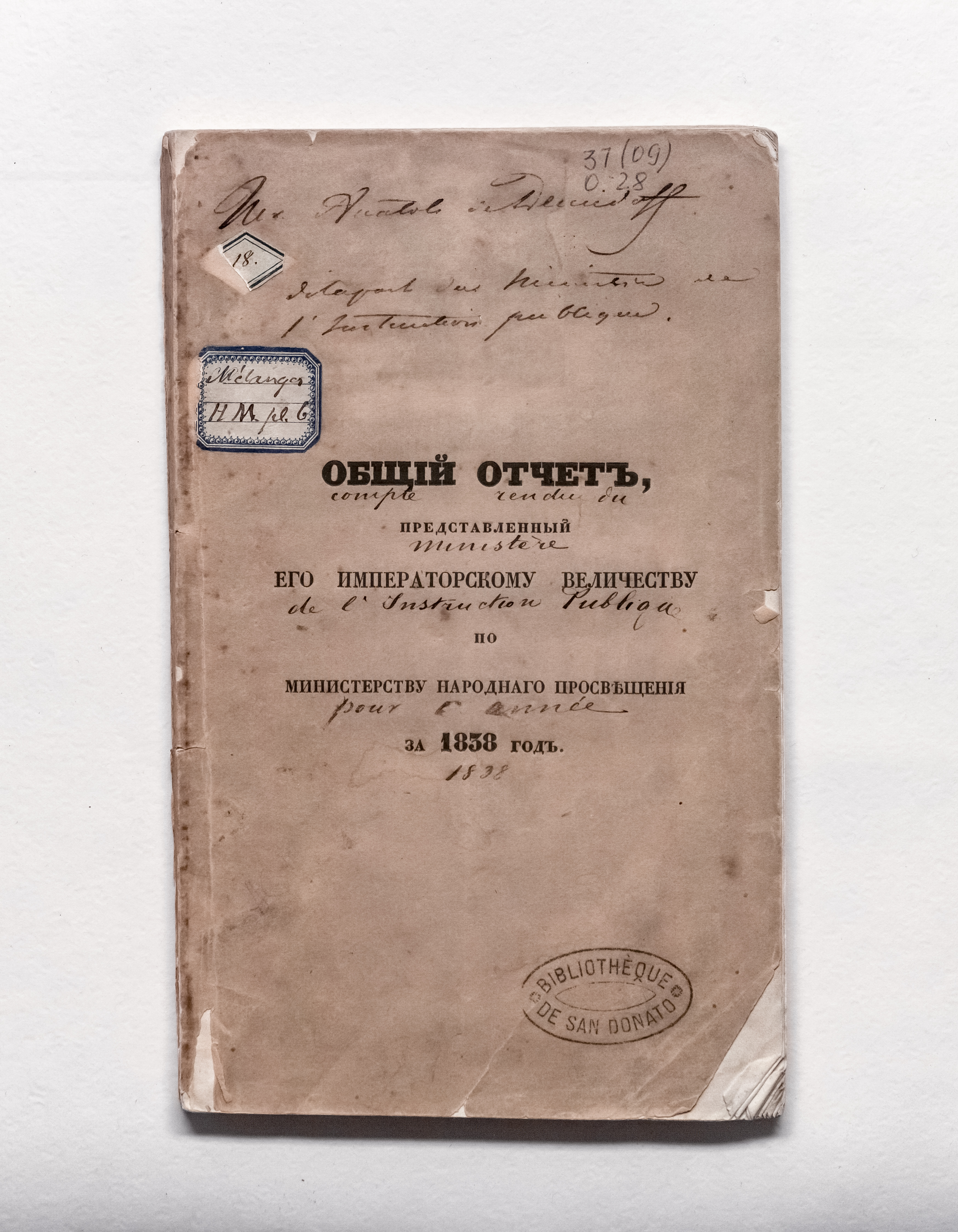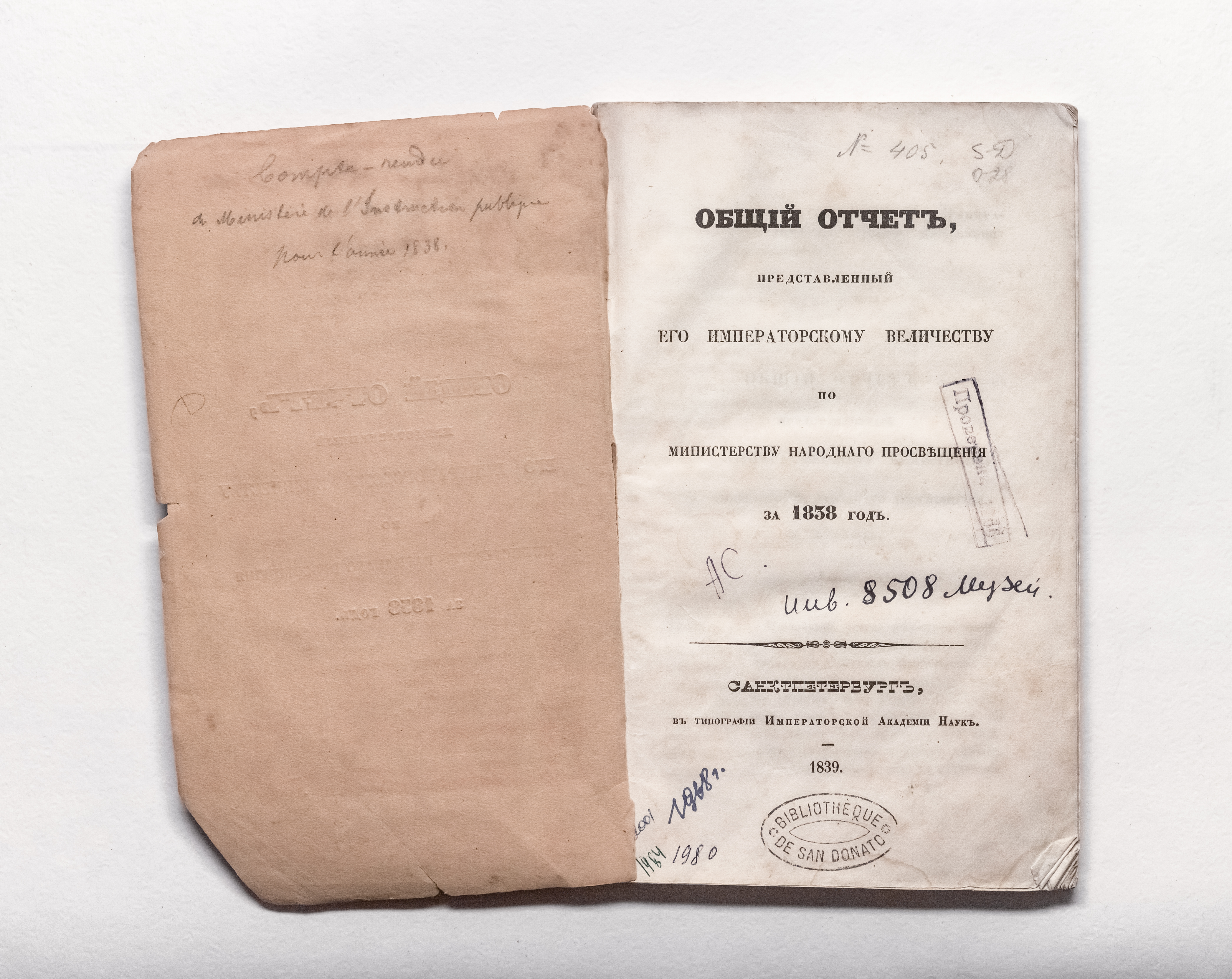 Общий отчет, представленный его Императорскому Величеству по Министерству народного просвещения за 1838 год. – Санкт-Петербург : тип. Императорской Академии Наук, 1839. – 135 с. ; 22,5х13,5 см.