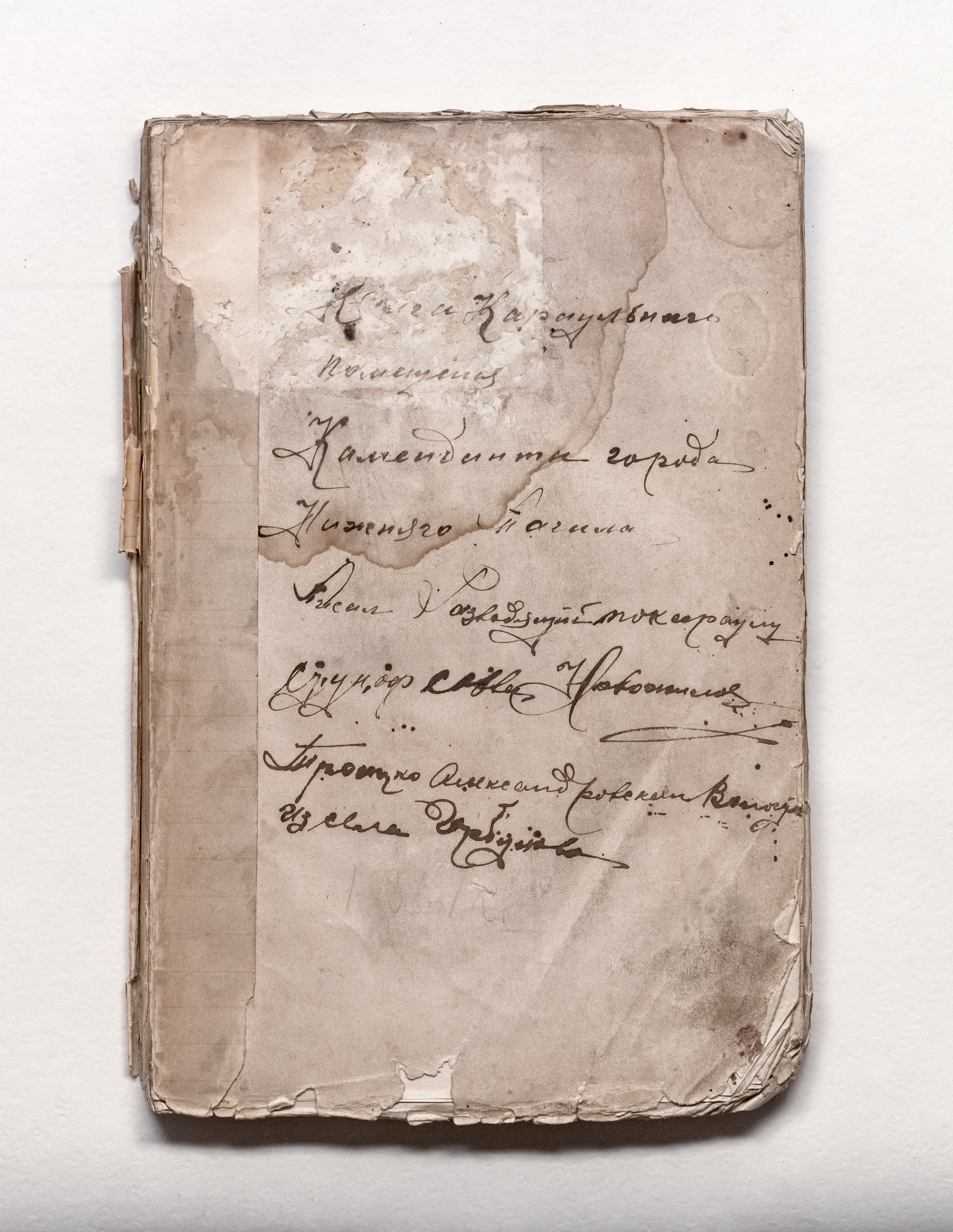 "Книга караульнаго помещения Каменданта города Нижняго Тагила (далее неразборчиво) Троицко Александровской волости из села Горбунова" (чернилами на обороте фронтисписа).
