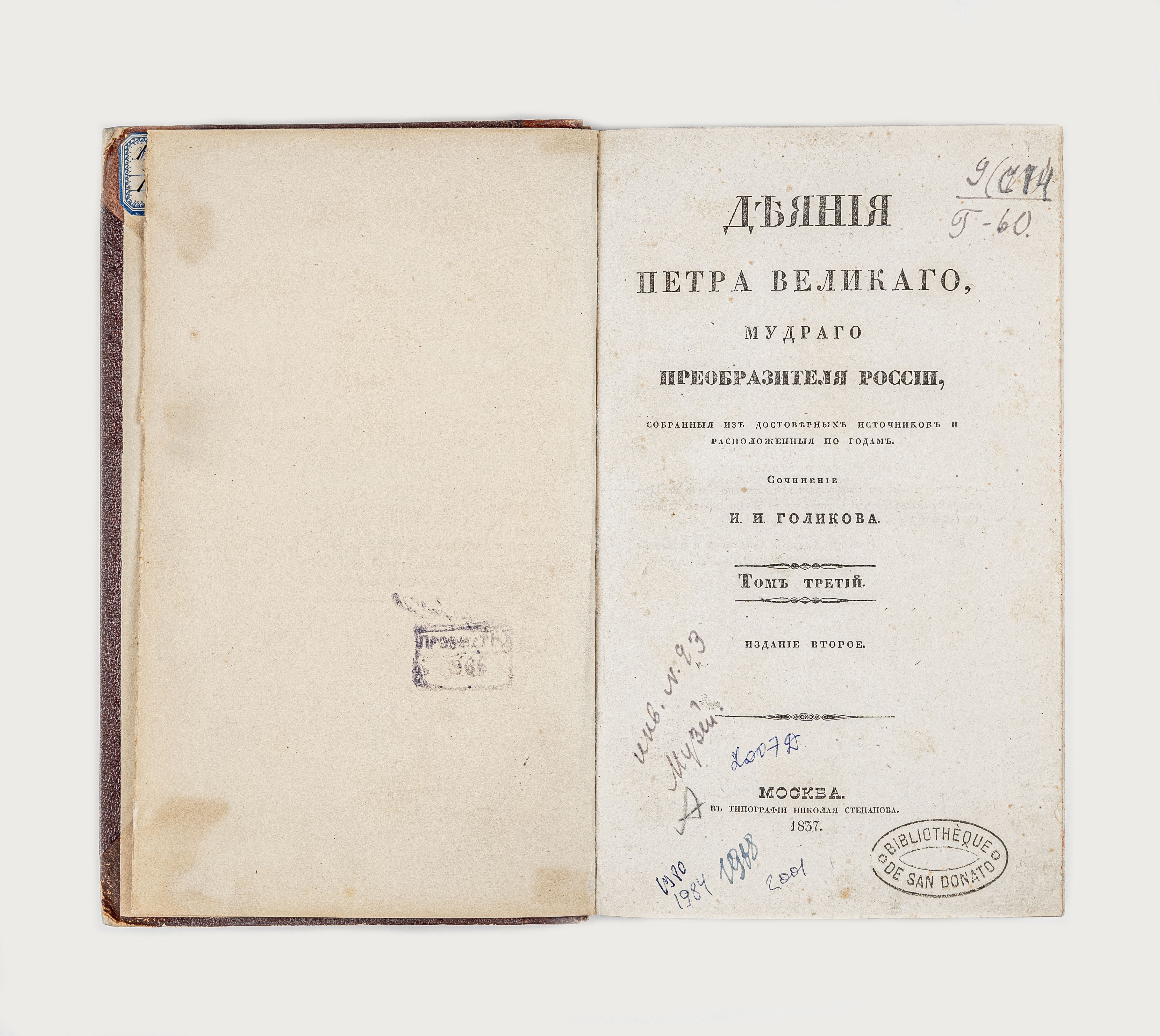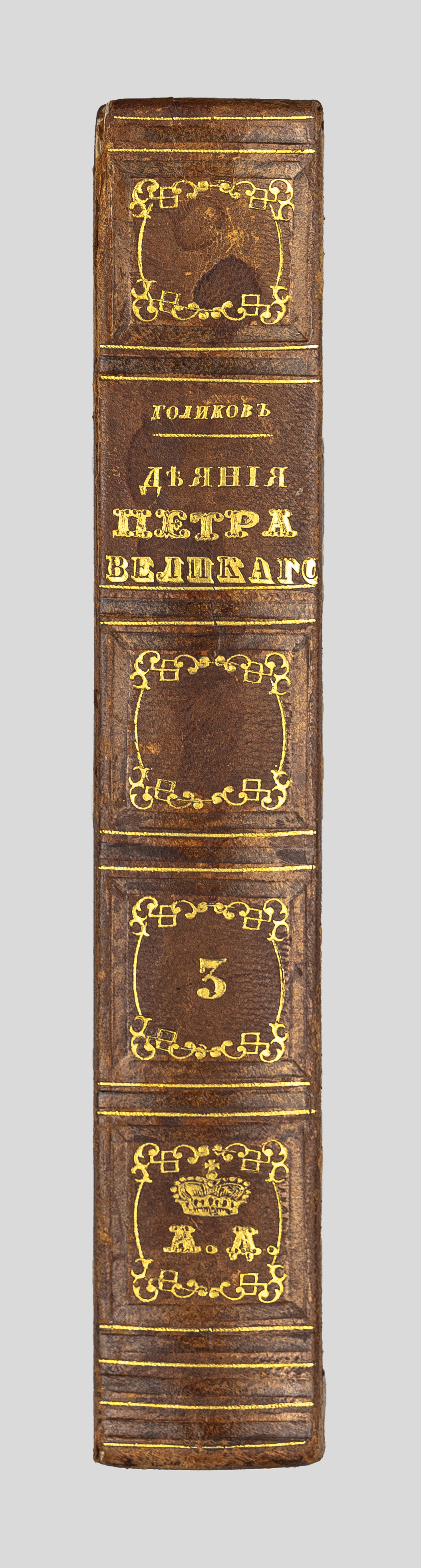Золототисненое заглавие «Голиков. Деяния Петра Великаго. 3» (на корешке перепл.);
