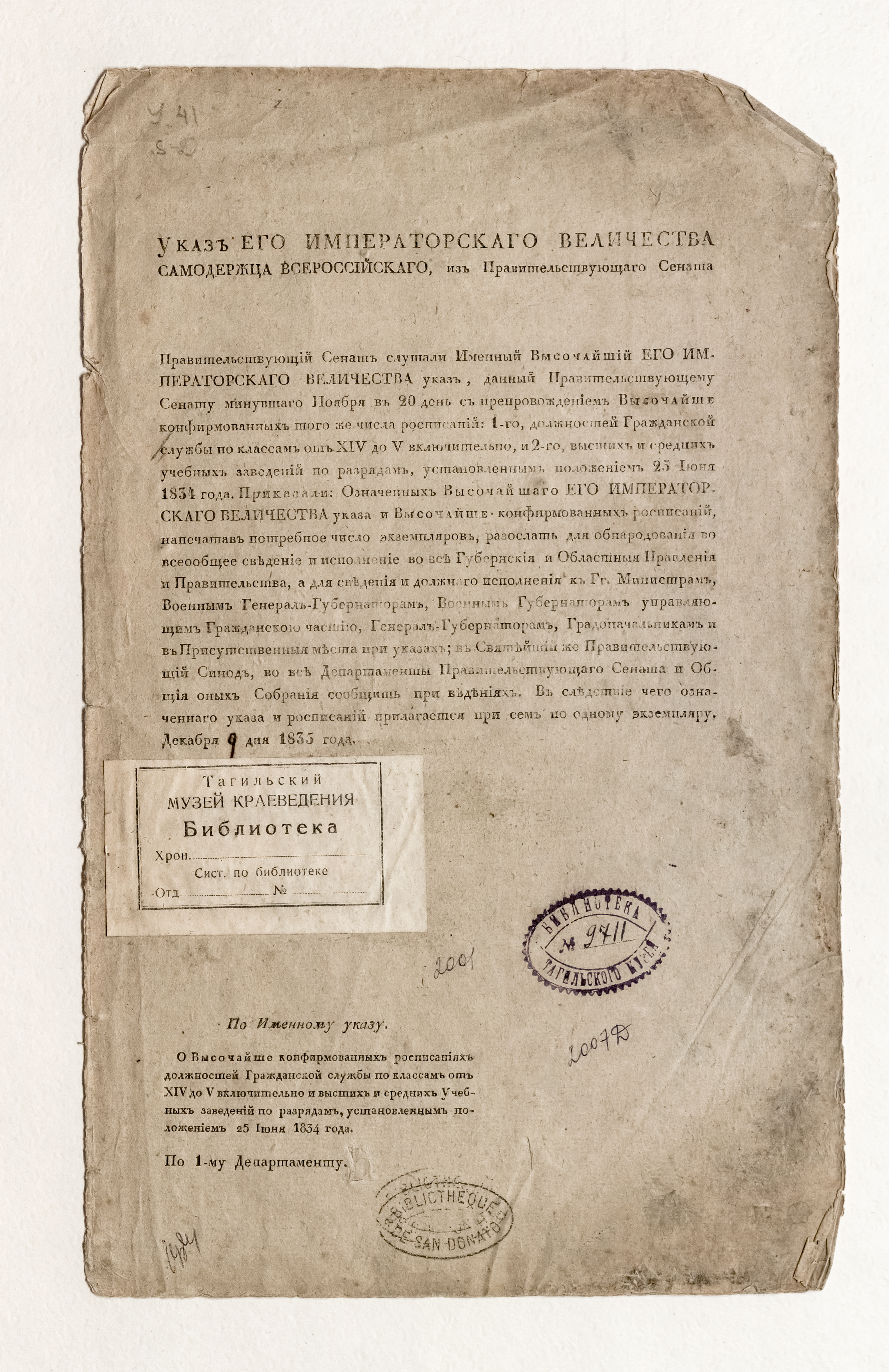Указ Его Императорского Величества, из Правительствующего сената о высочайше конфирмованных расписаниях должностей гражданской службы по классам от XIV до V включительно и высших средних учебных заведений по разрядам, установленным положением 25 июня 1834 года. По 1 Департаменту : по Именному указу. – Санкт-Петербург : [б. и.], 1835. – [3] л. ; 35х21,5 см.
