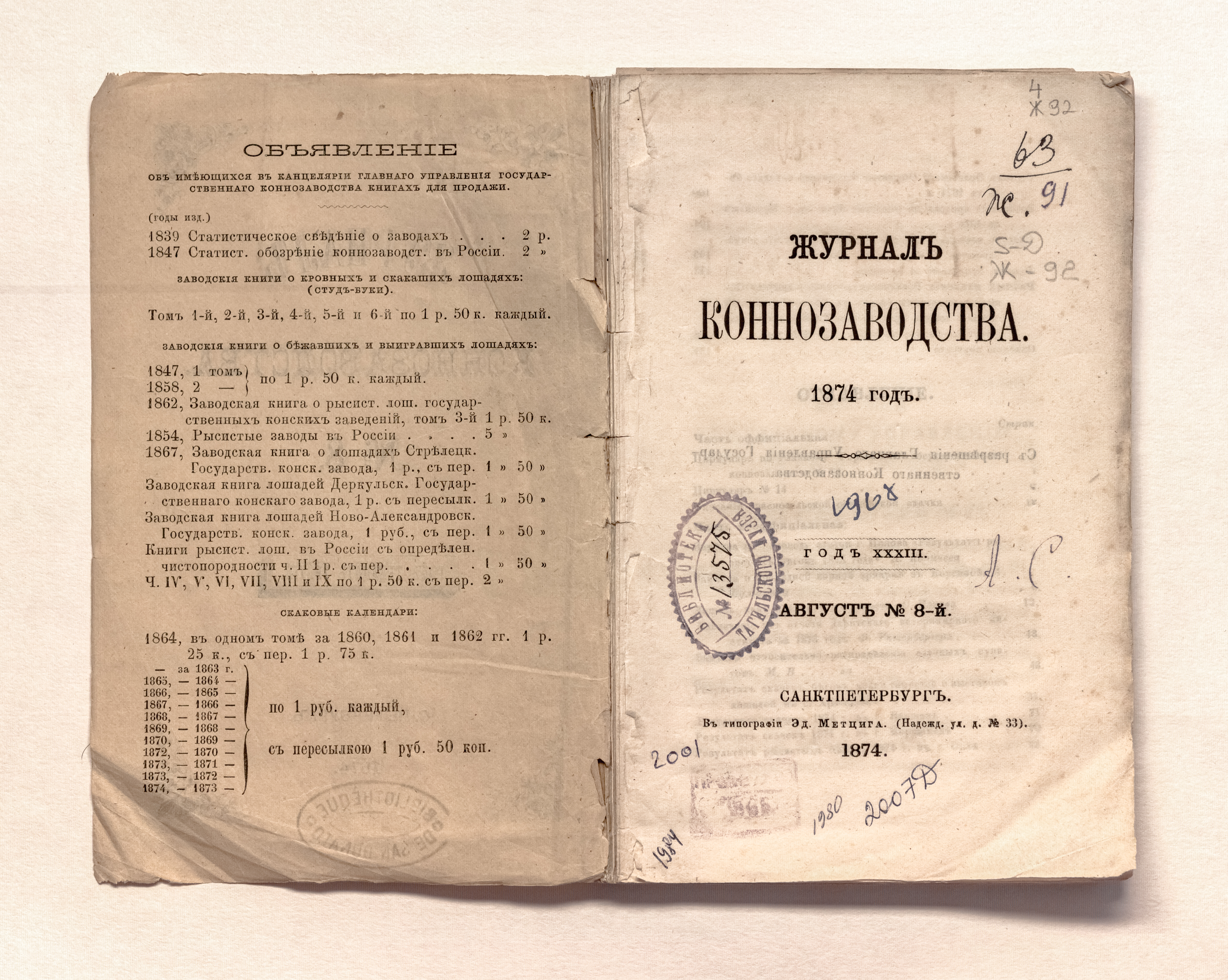 Журнал коннозаводства. – Санкт-Петербург : тип. Эд. Метцига – 1874. – № 8 (авг.) – 133 с. : ил. ; 20,5х13,5 см.