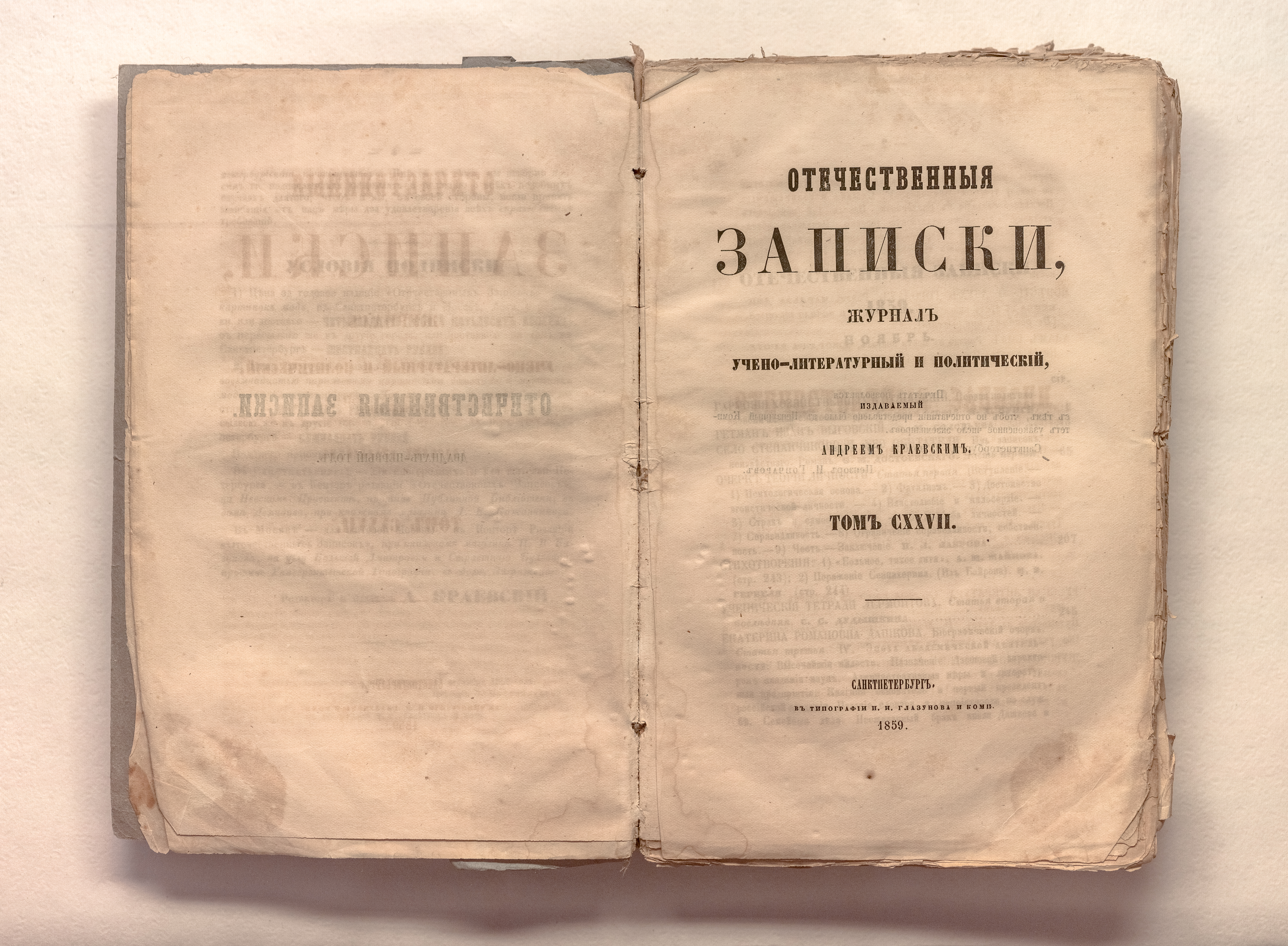 Отечественные записки : журнал учено-литературный и политический, издаваемый Андреем Краевским. – Санкт-Петербург : тип. И. И. Глазунова и комп., 1859.