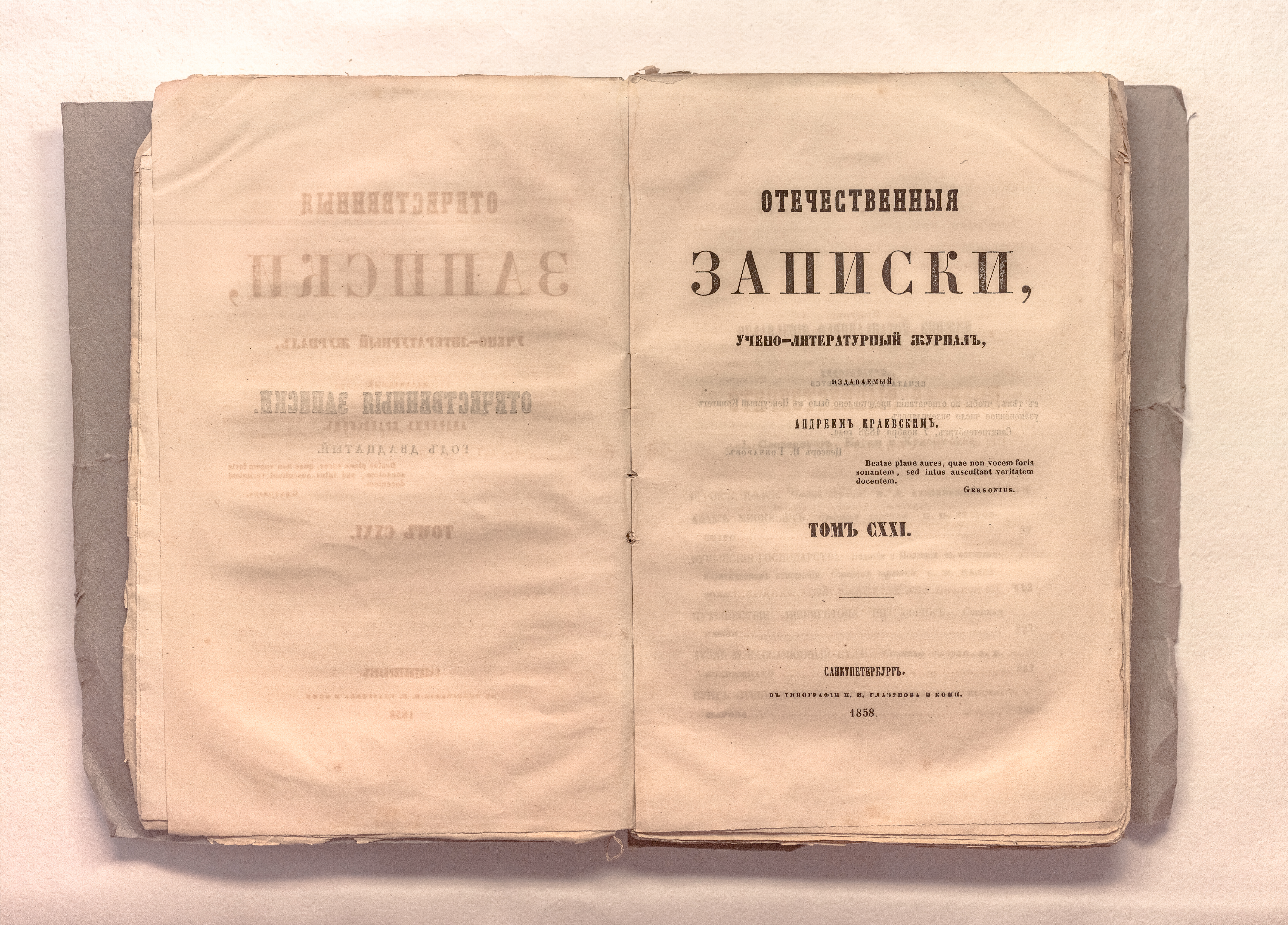 Отечественные записки : журнал учено-литературный и политический, издаваемый Андреем Краевским. – Санкт-Петербург : тип. И. И. Глазунова и комп., 1858.