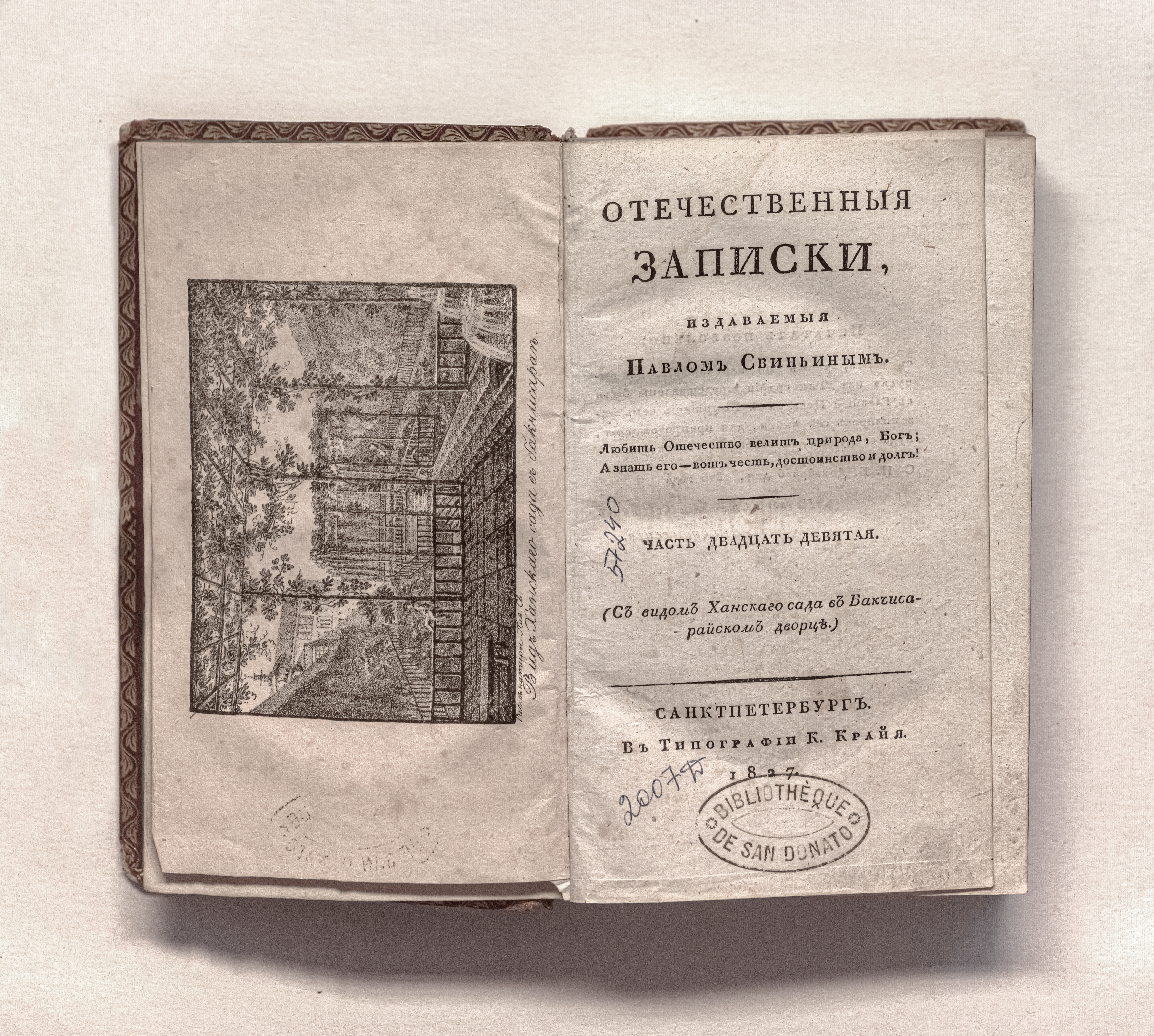Отечественные записки, издаваемые Павлом Свиньиным: [в ? ч.]. Ч. 29 / ред.-сост. Павел Свиньин. – Санкт-Петербург : тип. К. Крайя, 1827. – 542 с. : грав. фронт. ; 17,5х10,5 см.