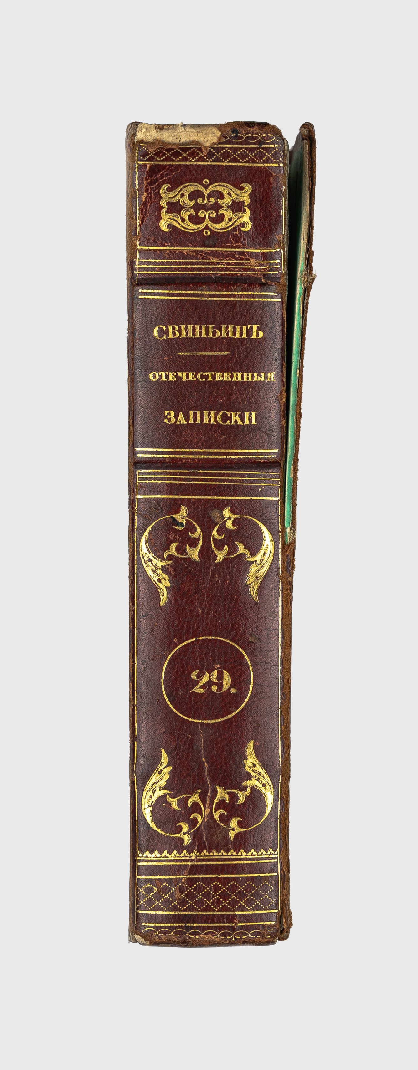 Золототисненое заглавие «Свиньинъ; Отечественные записки; 29» (на корешке перепл.).