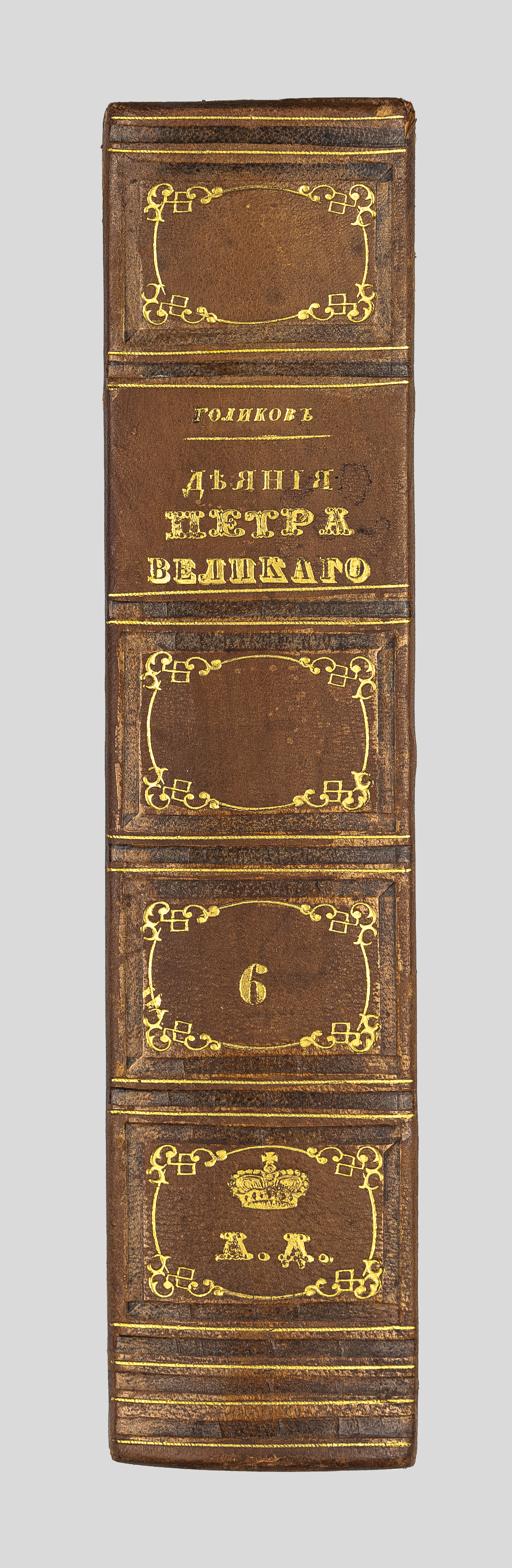 Золототисненое заглавие «Голиков. Деяния Петра Великаго. 6» (на корешке перепл.);
