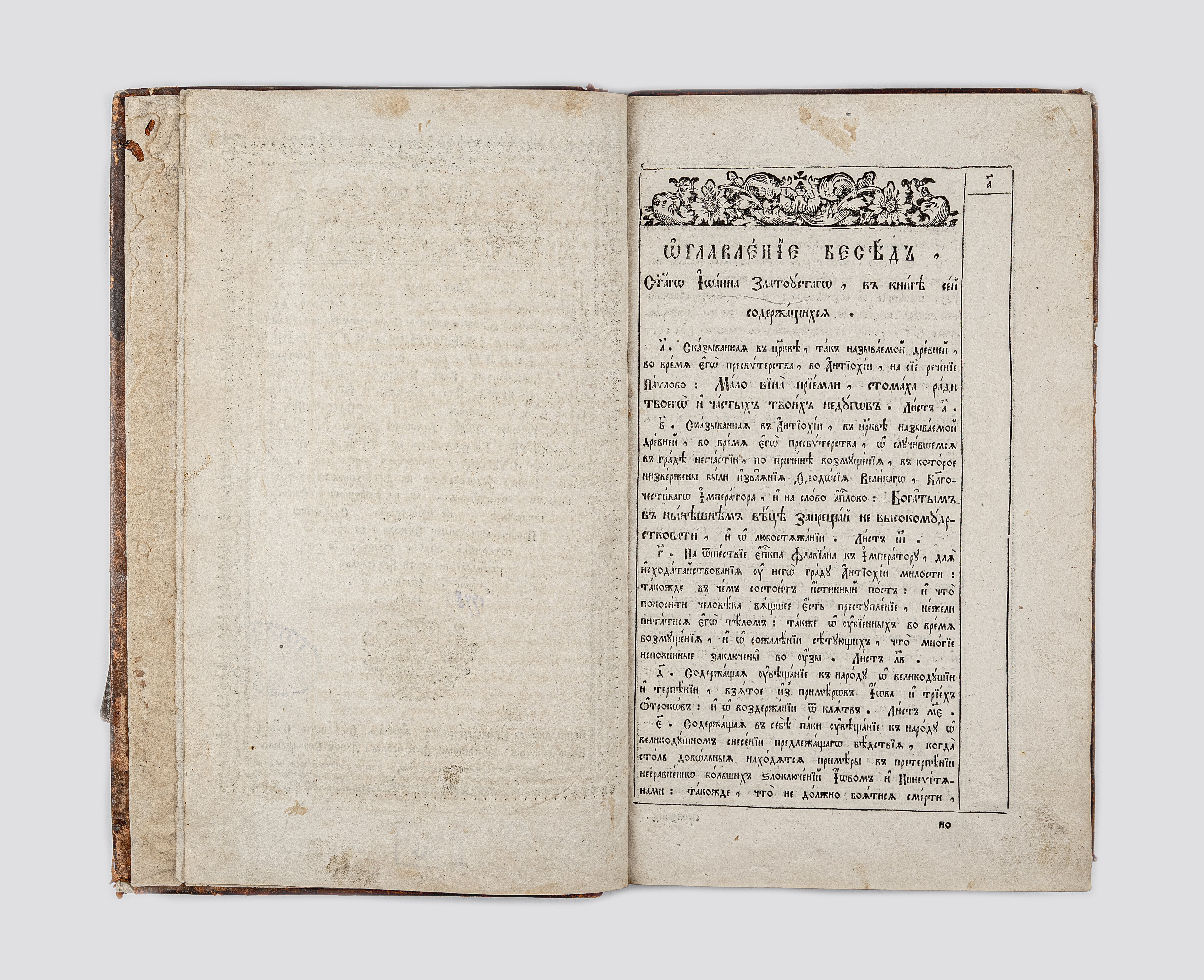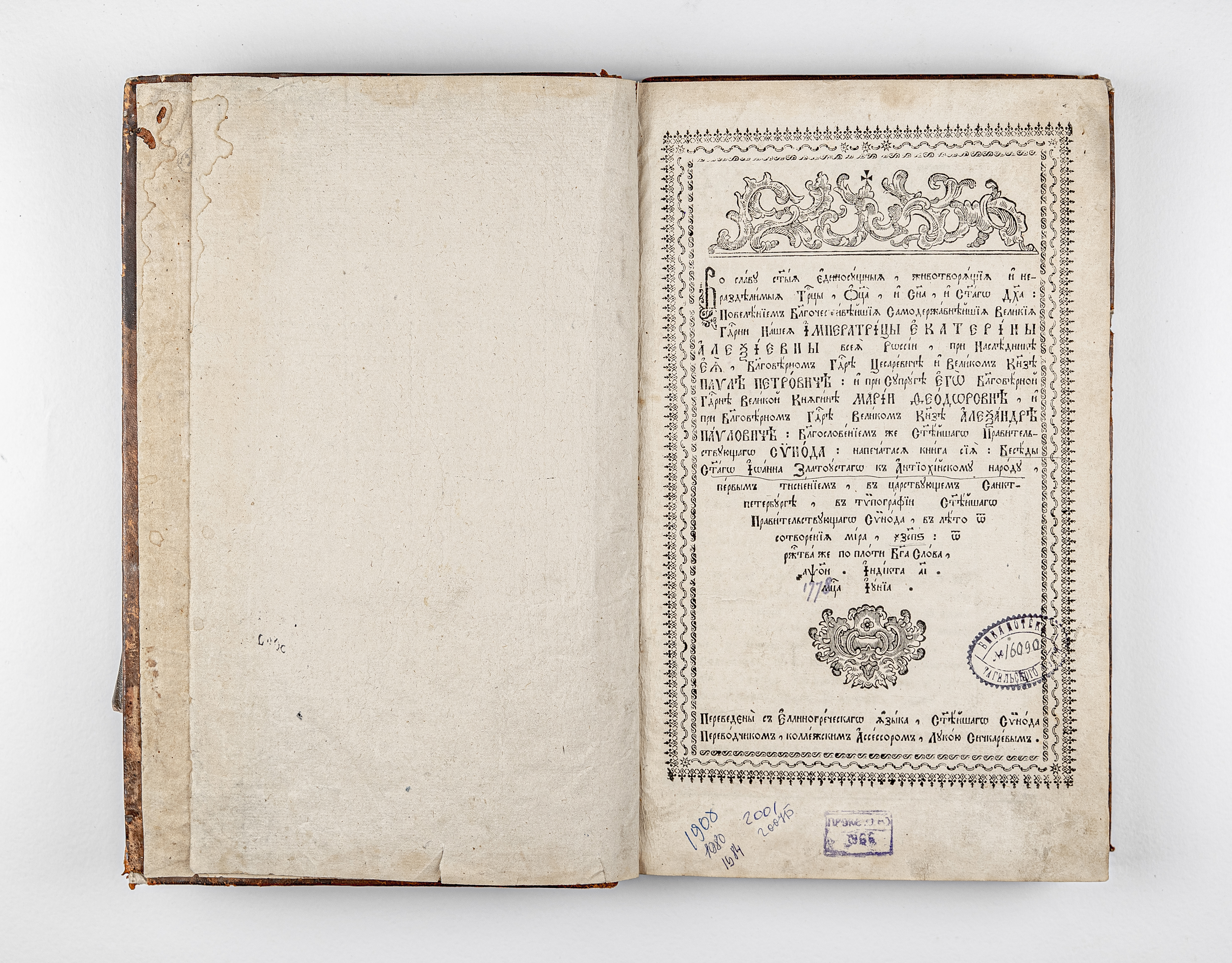 Златоуст, Иоанн (ок. 347-407; архп. Константинопальский). Беседы святого Иоанна Златоустаго к антиохийскому народу / Иоанн Златоуст ; пер. с греческого Святейшего Синода переводчиком, коллежским ассессором Лукою Сичкаревым. – Первым тиснением. – Санкт-Петербург : Синодальная тип., июнь 1778. – 225 л. ; 33х20,5 см.