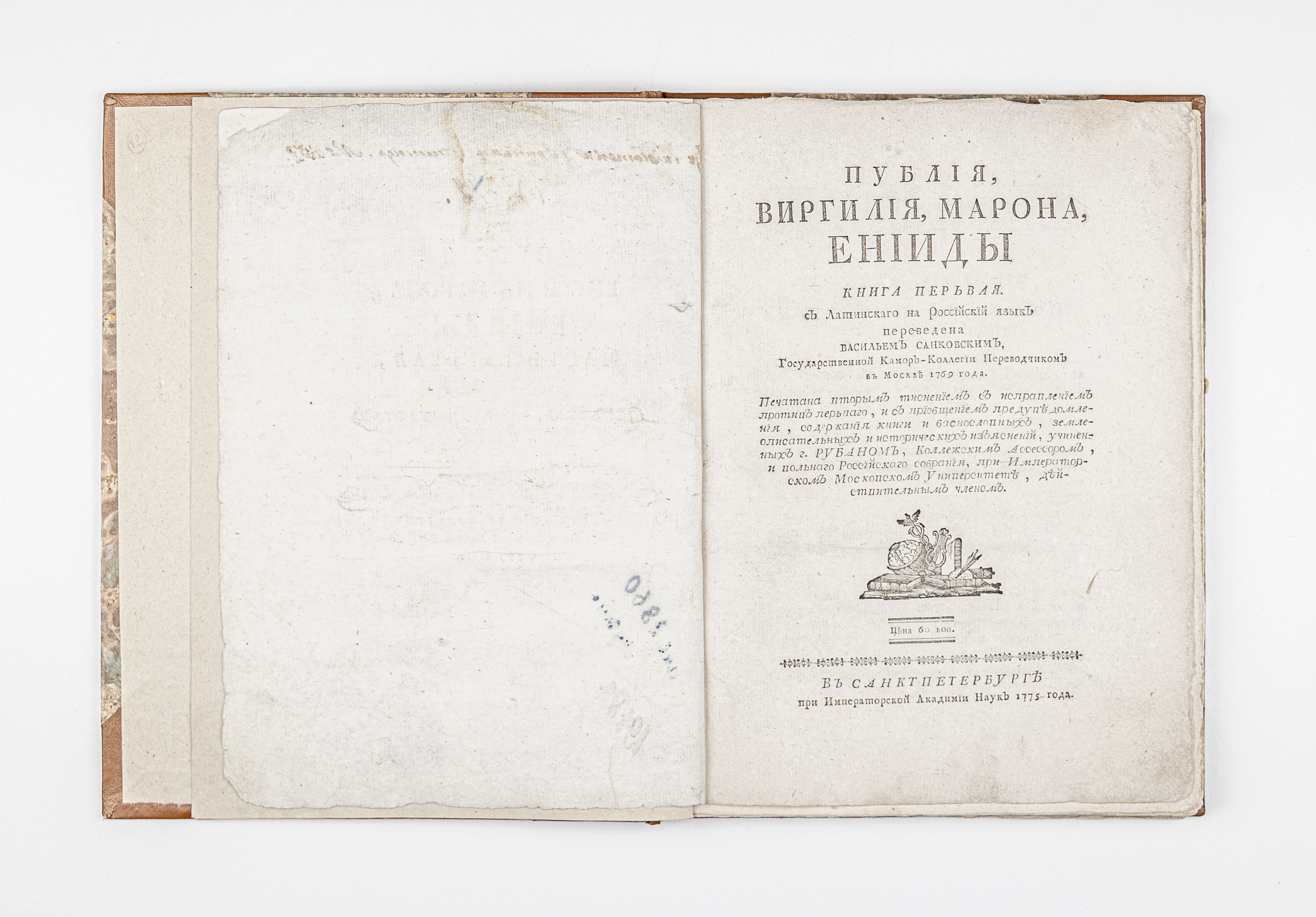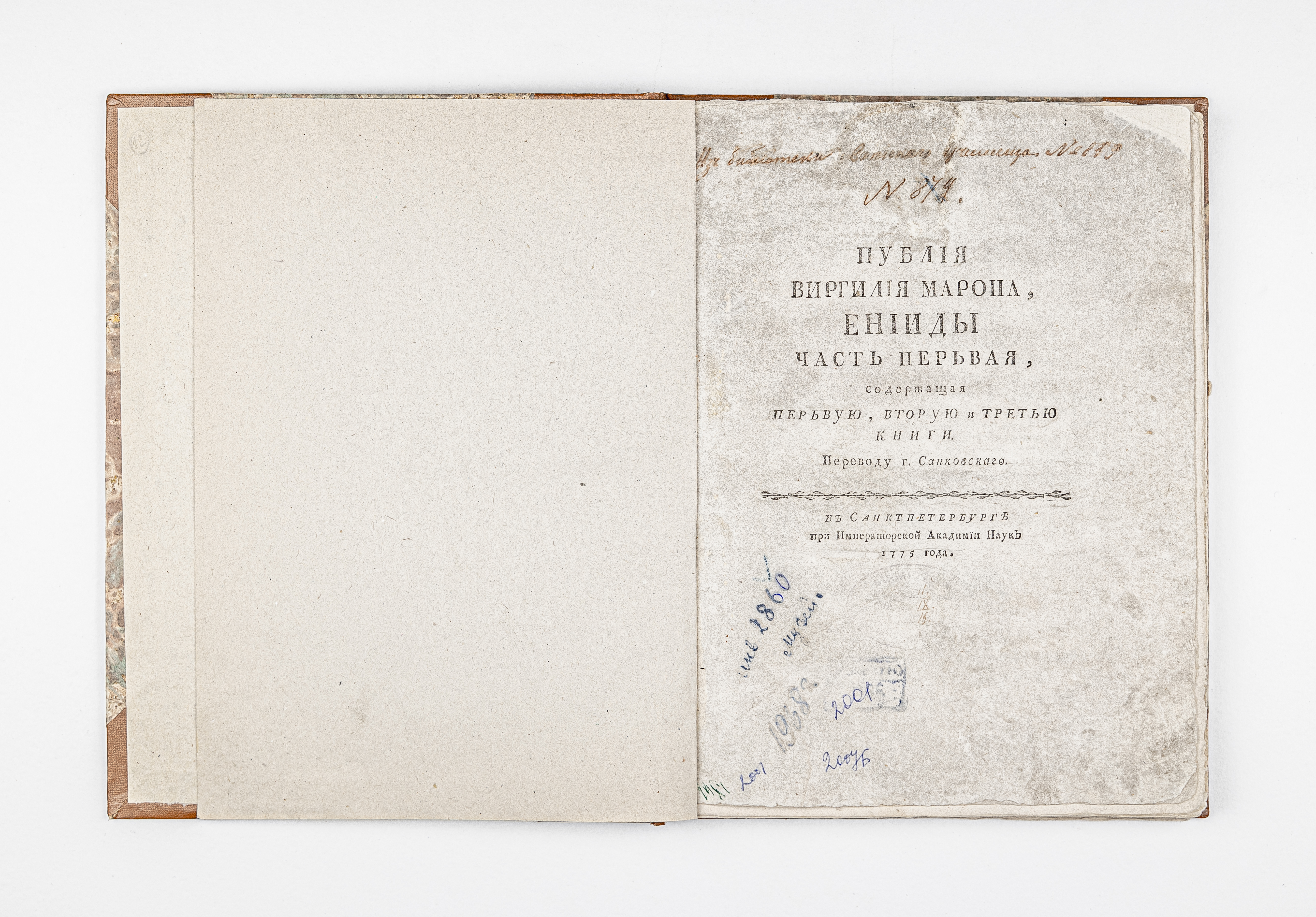 Вергилий, Марон Публий (70 г. до н. э. — 19 г. до н. э.). Публия Вергилия Марона Енииды часть первая, содержащая первую, вторую и третью книги / Марон Публий Вергилий; пер. с лат. Василием Санковским… Вторым тиснением, испр. и доп. Кн. 1-3. – Санкт-Петербург. При Имп. Акад. Наук, 1775. – 42, 30, 27 с. ; 25х19 см.