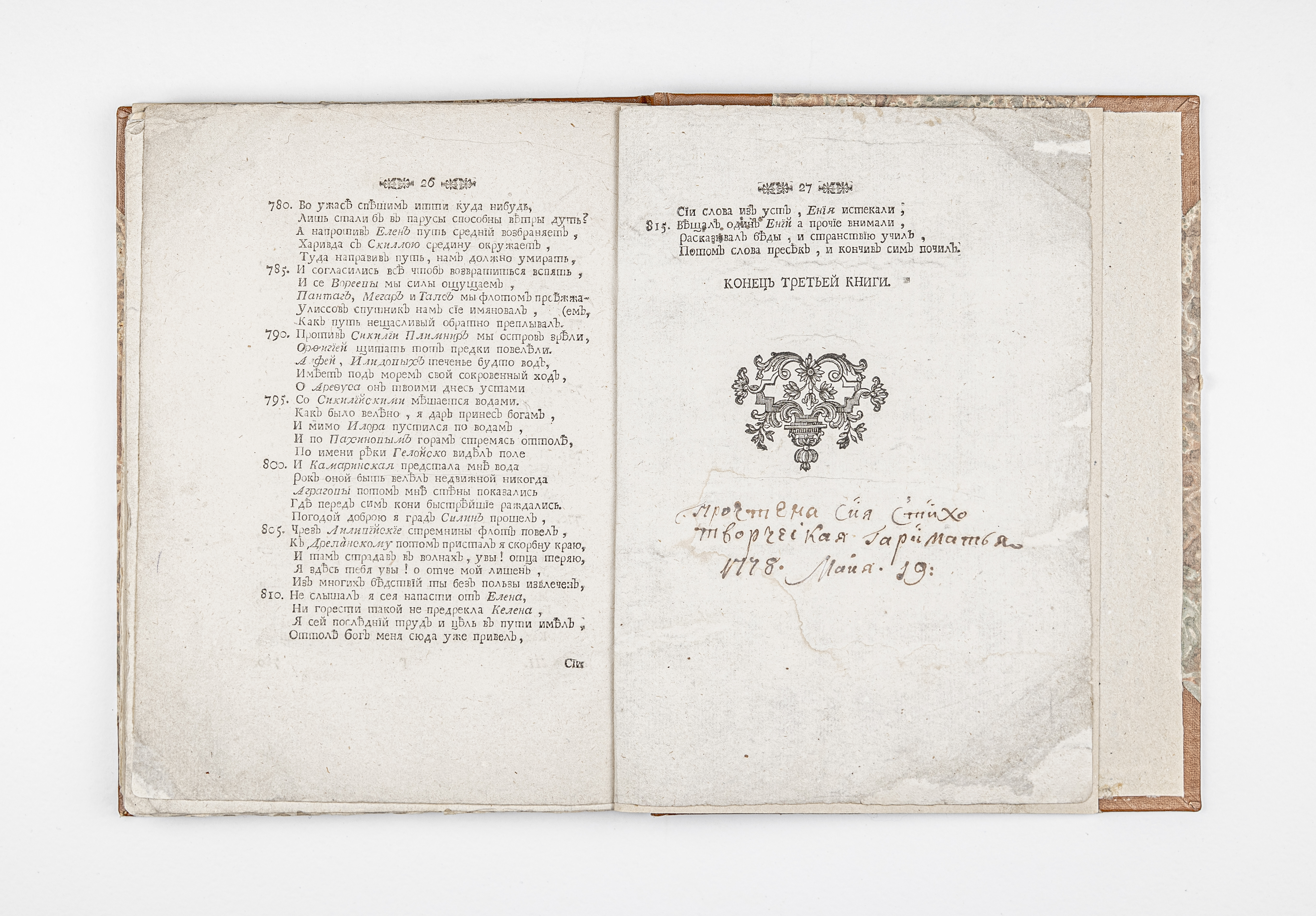 «Прочтена сия стихотворческая гариматья 1778 маия 19» (почерком Н.А. Демидова, с. 27 кн. 3).