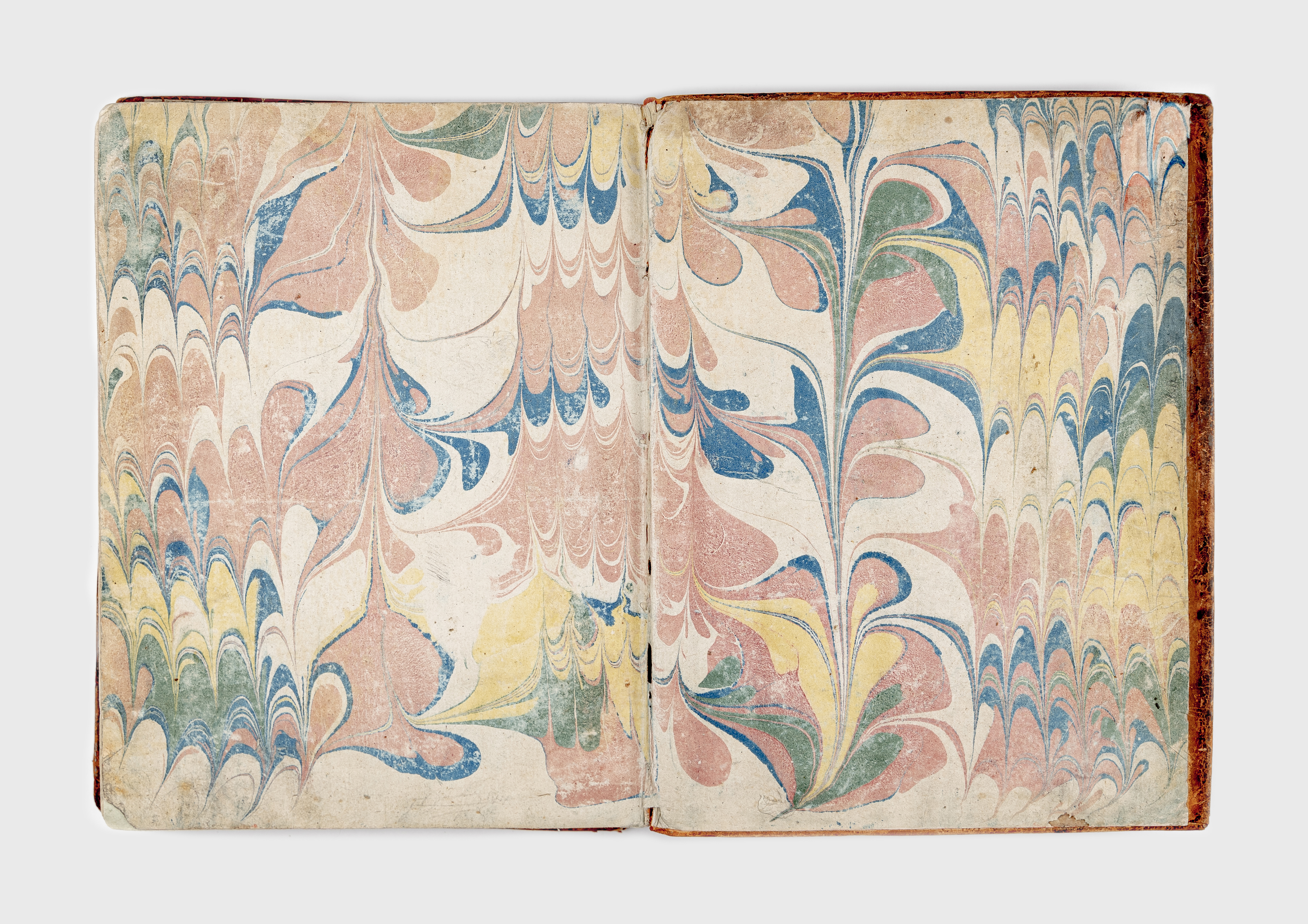 Книга в цельнокожаном владельческом переплете. Обрез тонированный. Форзацы украшены бумагой с рисунком «павлинье перо». Бумага верже.