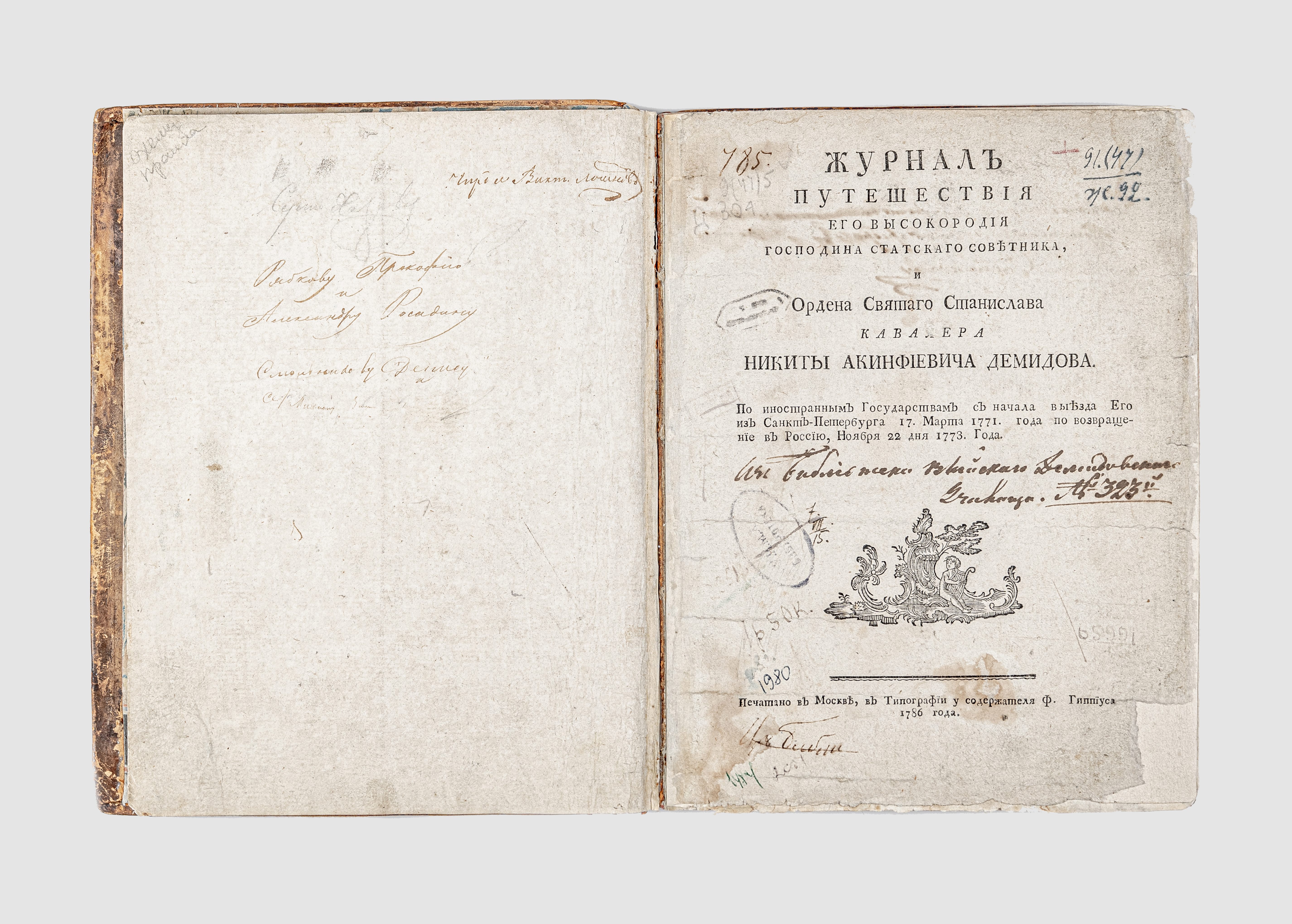 Демидов, Н.А. (1724-1787). Журнал путешествия его высокородия господина статского советника и Ордена святого Станислава кавалера Никиты Акинфиевича Демидова. По иностранным государствам с начала выезда его из Санкт-Петербурга 17 марта 1771 года по возвращении в Россию, ноября 22 1773 года / Н.А. Демидов. – Москва : тип. Ф. Гиппиуса, 1786. – [2], 164, [1] с. ; 25х19 см.