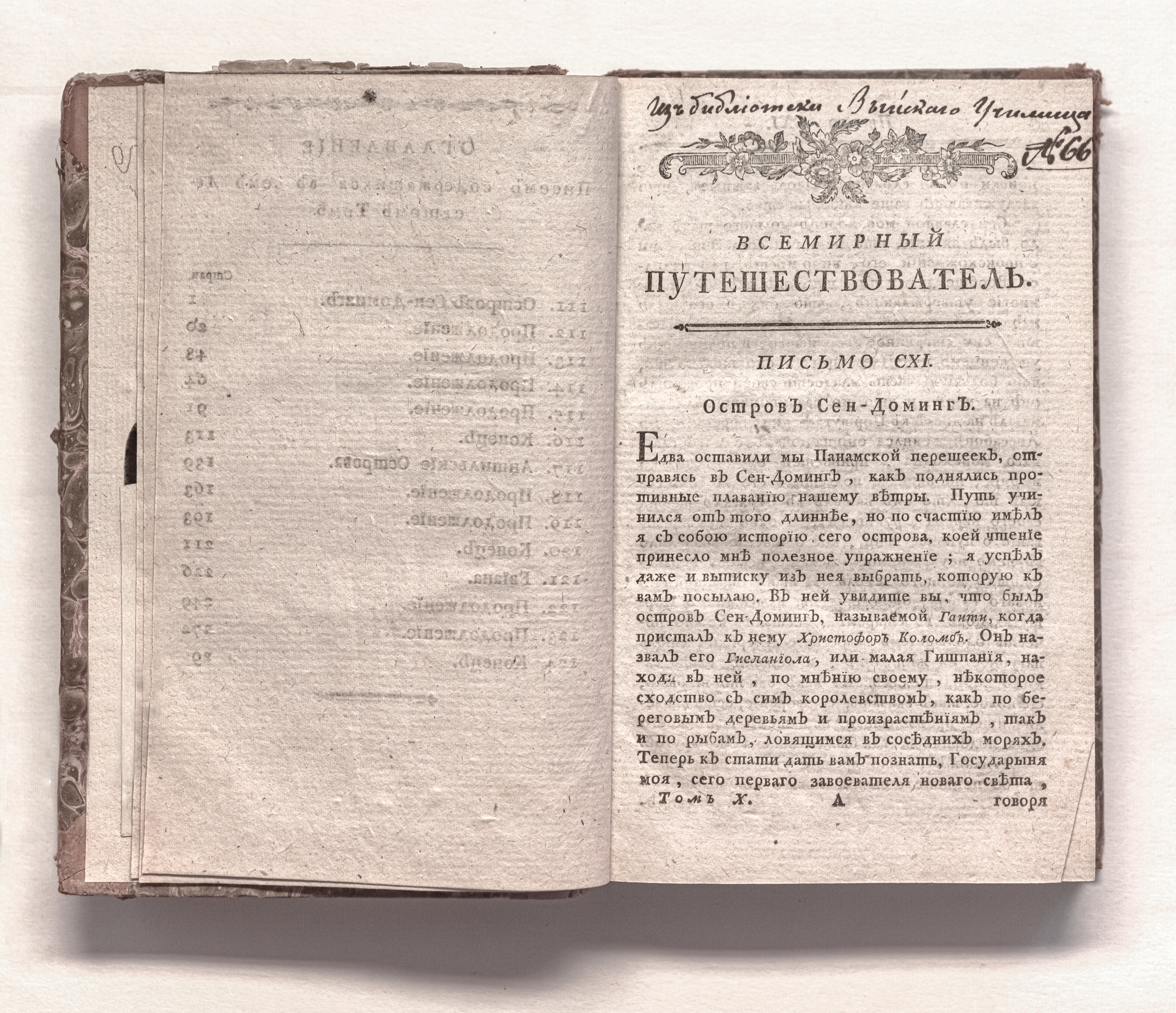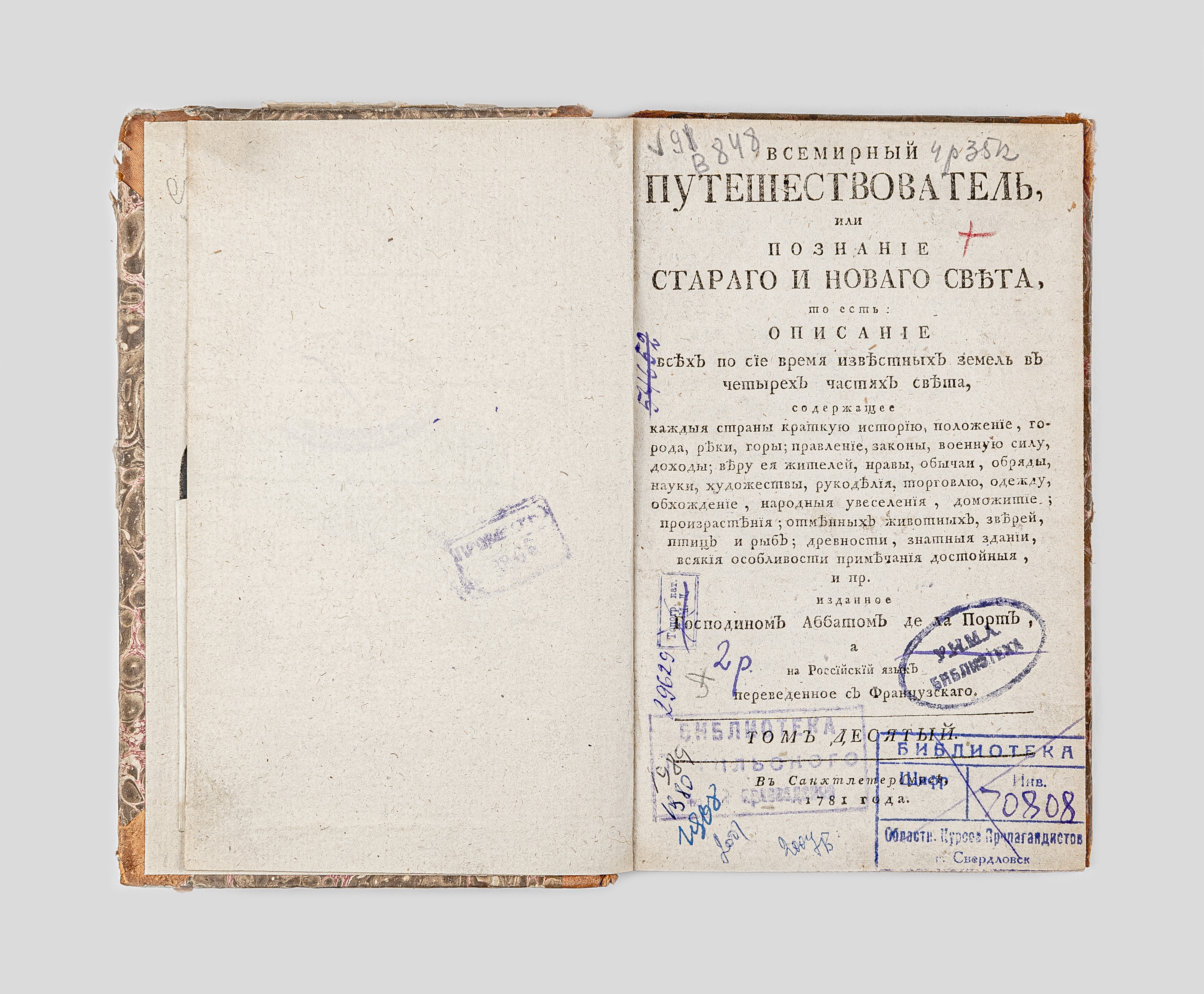 Ла Порт, Жозеф де (1713-1779). Всемирный путешествователь, или Познание Стараго, и Новаго света, то есть : описание по сие время известных земель в четырех честях света… изданное господином аббатом де ла Порт, а на российский язык переведенное с французскаго [Я. И. Булгаковым] / Жозеф де Ла Порт. Т. 1-27. – Санкт-Петербург. : тип. Вейтбрехта и Шнора, 1778-1794.
